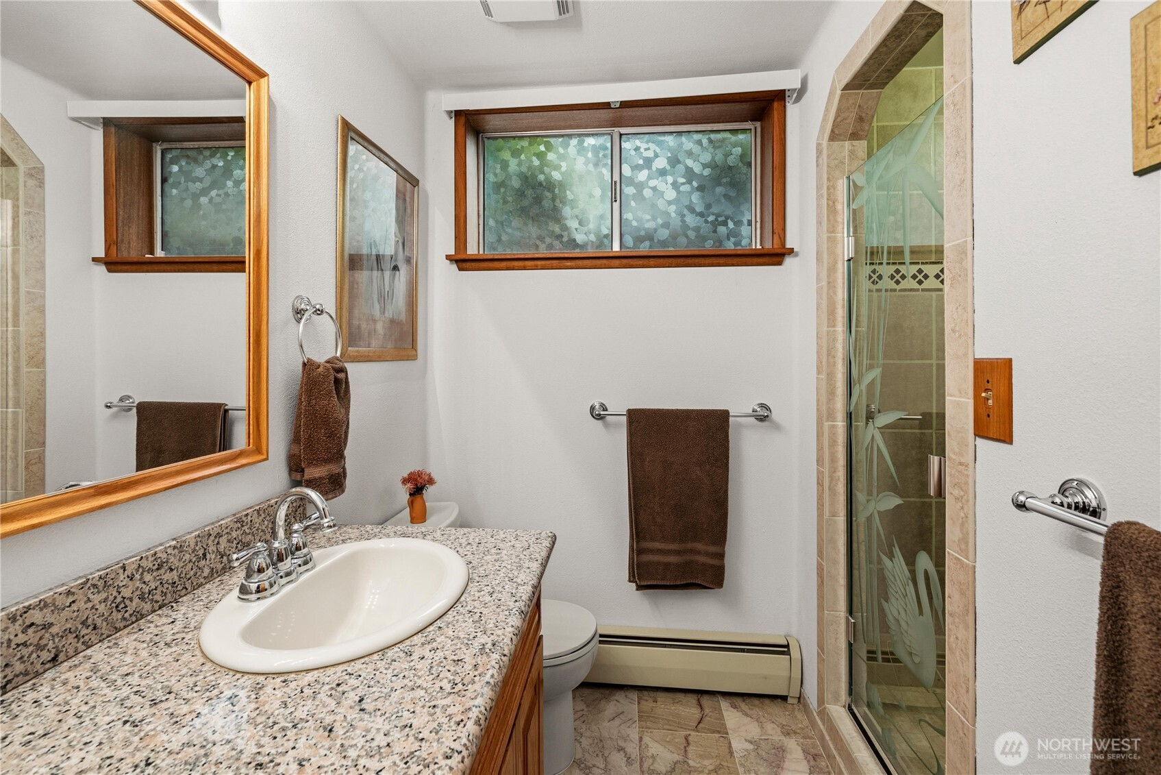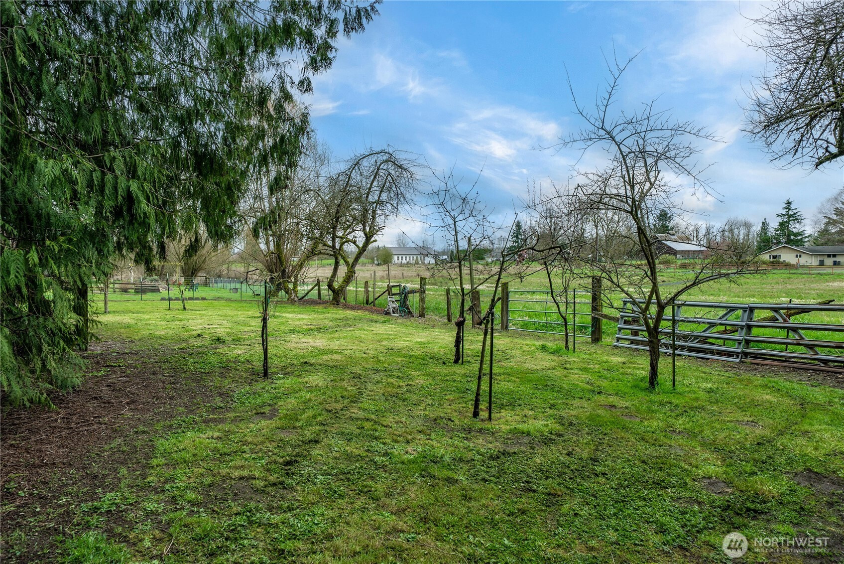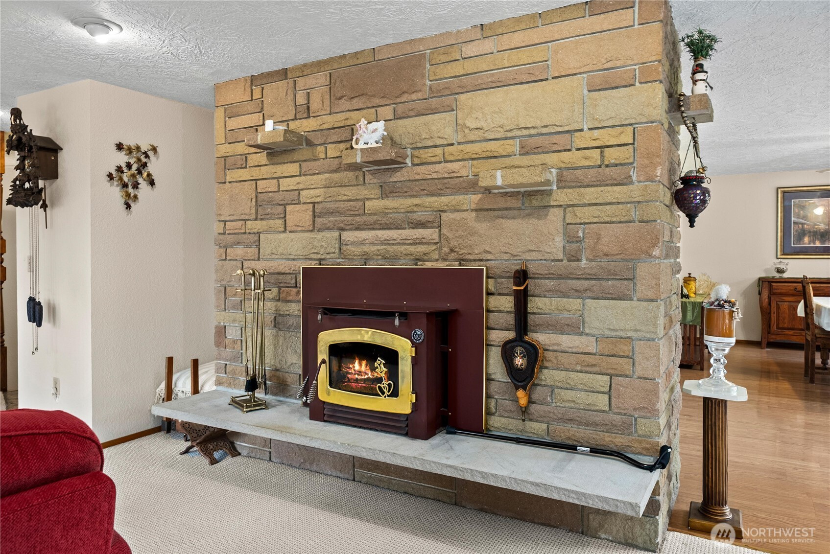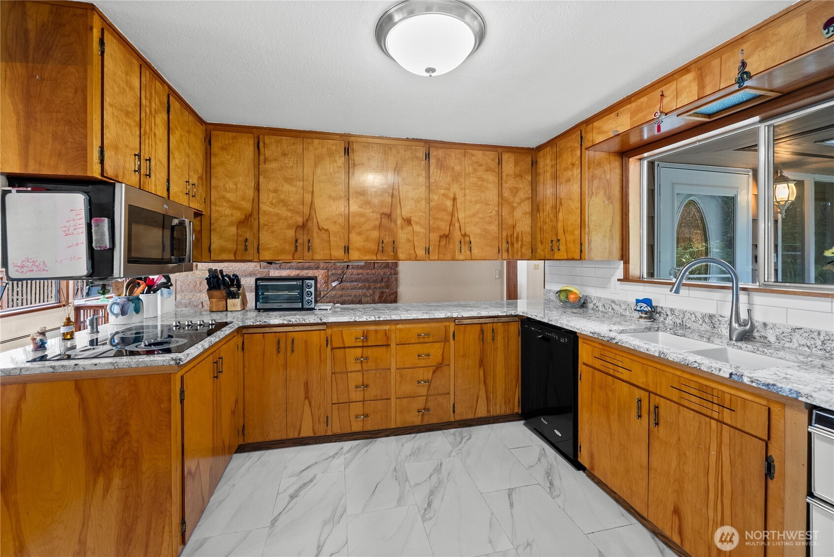 Welcome to this well-built 3,440 sqft, 5 bedroom rambler with a fully furnished daylight basement, ideally located on a quiet dead-end street and set on a shy 1-acre (.96 acre) private retreat. A circular driveway welcomes you to a slate entry, opening into an expansive living and dining area anchored by a cozy wood-burning fireplace. The main level features a well-appointed kitchen with granite countertops, along with 3 bedrooms and 1.5 baths. The lower level offers excellent potential for separate living quarters, complete with a full kitchen with granite counters, new stainless steel appliances and breakfast bar, spacious living room with wood fireplace insert, dining area, full bath, 2 additional bedrooms, and a versatile finished bonus room - perfect for multi-generational living or flexible space. Enjoy brand new propane radiant hot water heat throughout, plus peace of mind with a whole-home generator. The exterior was freshly painted just 3 years ago, enhancing both curb appeal and longevity. Step outside to a wrap-around deck and attached greenhouse for year-round enjoyment. The grounds are truly special, featuring fruit trees, roses, lush gardens, and majestic mature trees. Additional highlights include a 3-stall barn, 24X22 detached shop, utility shed, and a brand new 5-bedroom septic system. A rare combination of space, function, and serene setting--this property has it all.