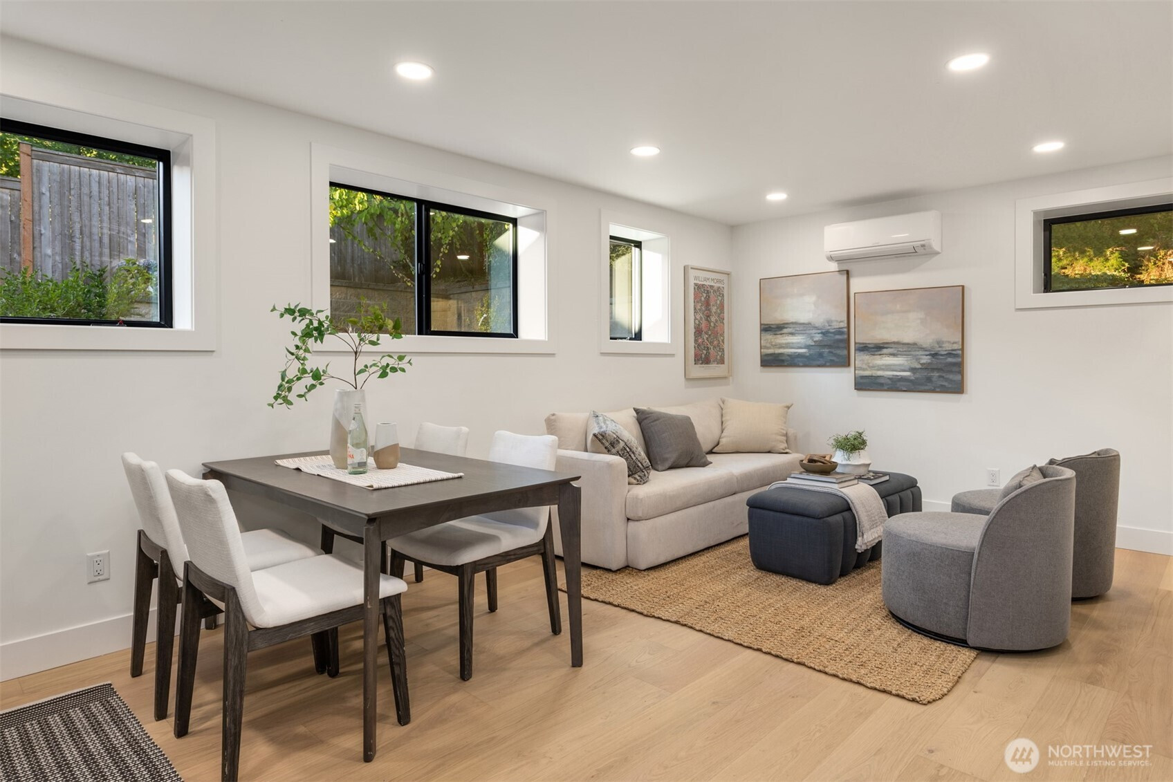 Beautiful & thoughtfully designed, custom Magnolia home combines luxury w/practicality.Open concept is abundant w/natural light via high ceilings & oversized windows. Dining area, great rm w/gas fpl, & high-end kitchen w/ 2 Nanawalls open to outdoor covered seating & lush, private yard. Current finishes & styling. Full ensuite bed/bath, powder, mud room, & 2 garage w/ EV charger on main. Mini splits. Elevated style continues upstairs w/vaulted ceilings, luxurious primary suite, 2 add'l bed/baths, family rm, & laundry. A 2 BR/1.5 BTH DADU for endless possibilities. Quiet location close to playfields, Magnolia Village, Discovery Prk, Met Market, Locks + easy distance to Ballard & Downtown Seattle. Bluetooth speakers. Builder Bluetooth w/t