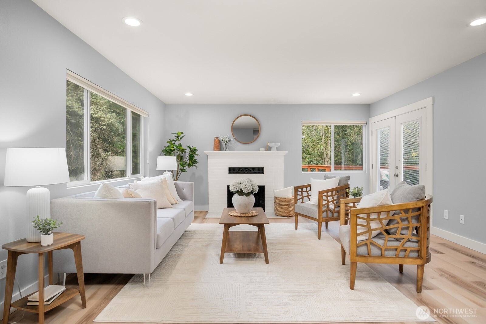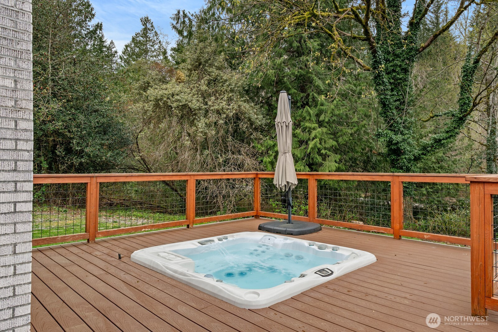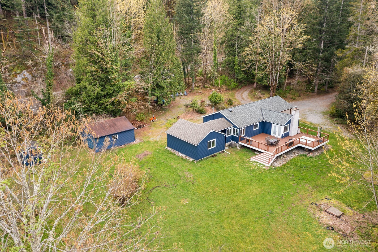 Situated on over 3 private acres, this tastefully remodeled 3 bedroom, 2 bath home offers an array of exceptional features. Enjoy the beautifully updated eat-in kitchen with quartz countertops and stainless steel appliances. Relax by the cozy fireplace in the living room or entertain under the stars on the new deck with a sparkling clean sunken hot tub. Other updates include fresh interior paint throughout, new trim, custom tile work in the beautifully updated bathrooms along with a new covered front patio. 2 car garage and extra detached work/shop/storage space in outbuilding, new roof in 2023, freshly painted exterior and new heat pump for year-round comfort. The spacious lower level rec room provides ample space for entertainment as well as a den/office, laundry room and plenty of flexible space to use or customize however you like.