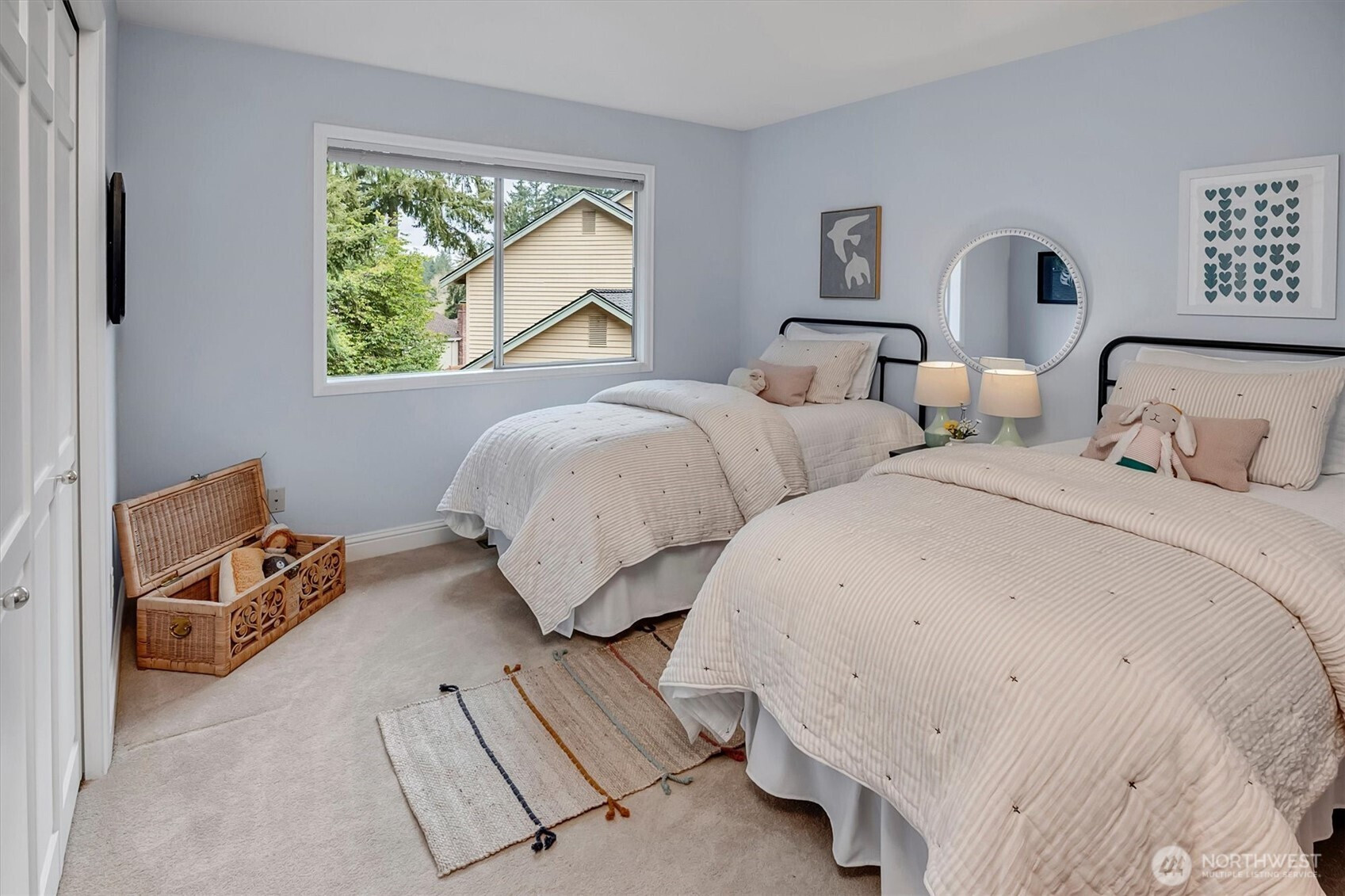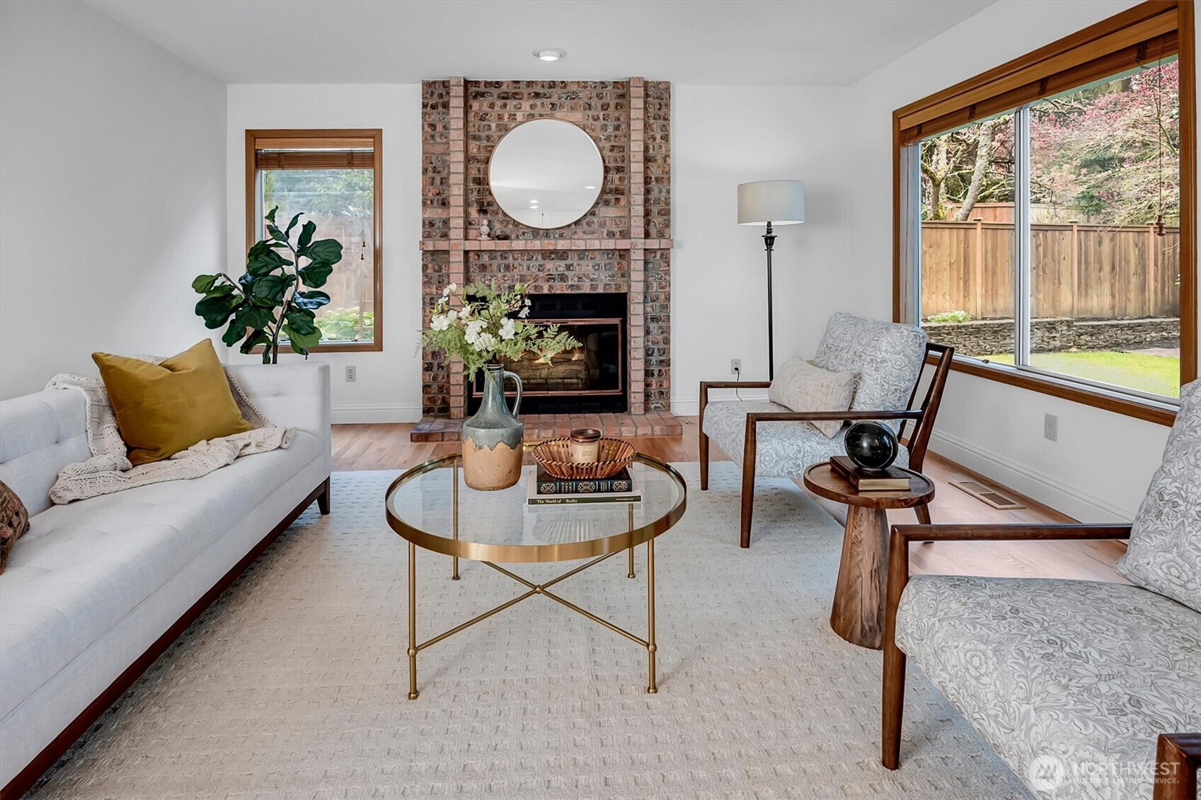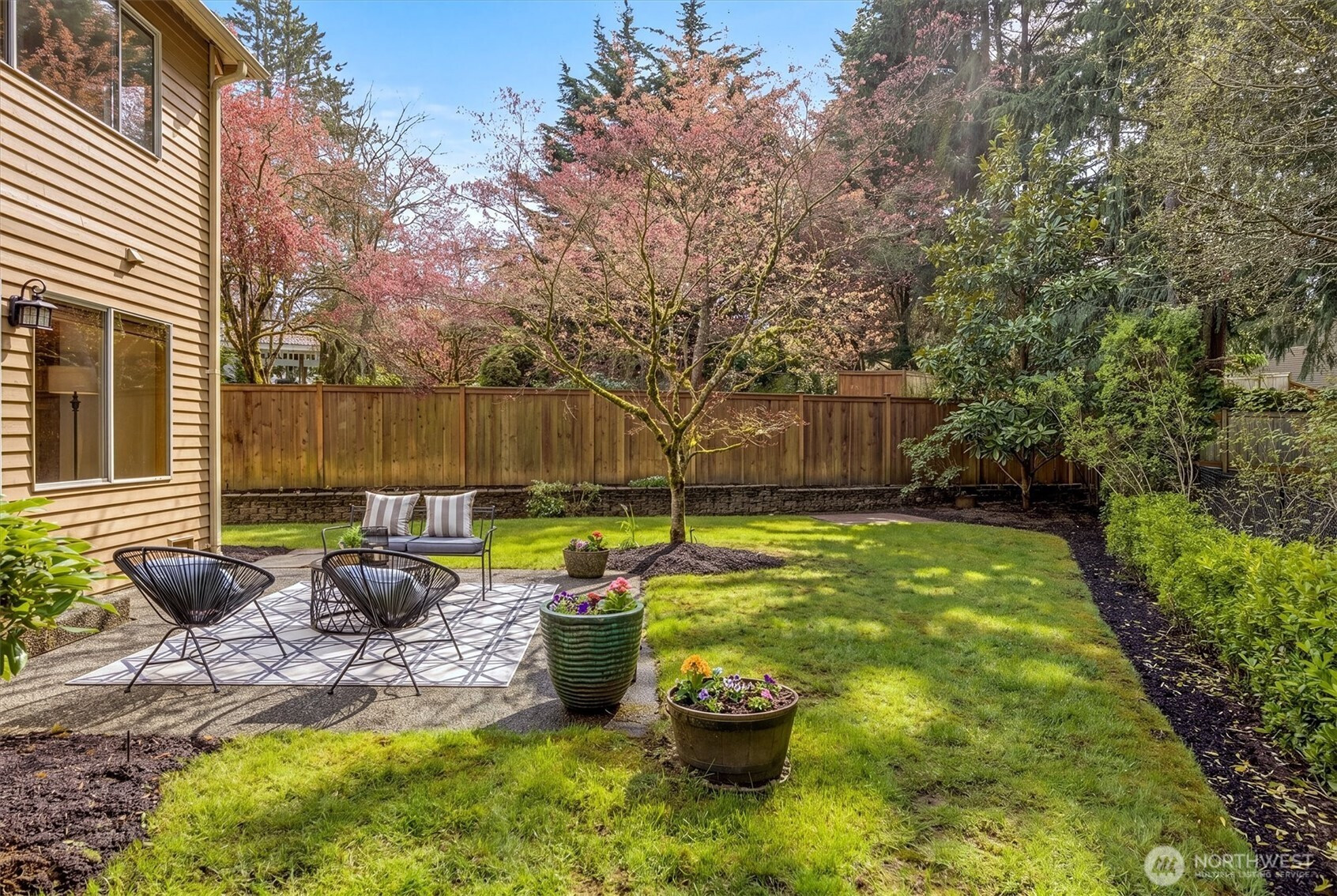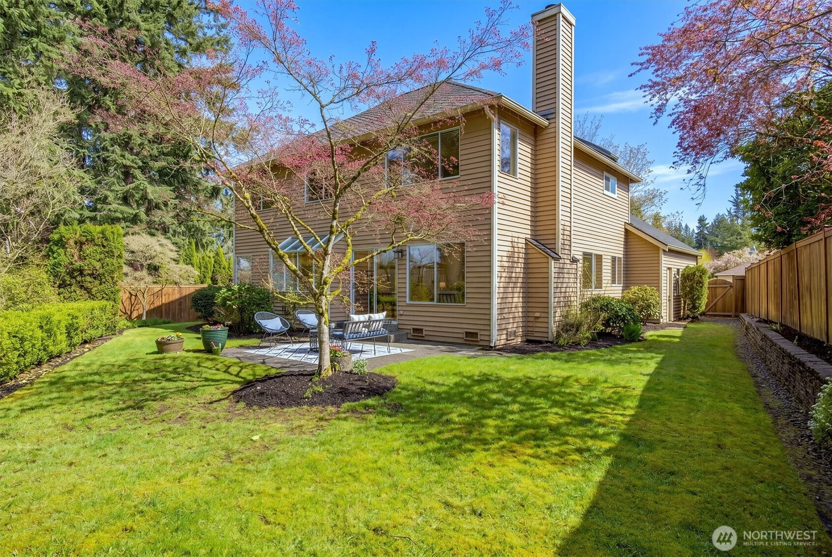 Thoughtfully updated Sammamish home tucked on a quiet cul-de-sac, offering 4 bedrooms plus a main floor office and 2.5 baths. A vaulted entry welcomes you in with a sense of space and light, while hardwood floors carry through the entry, kitchen, and great room. The kitchen features custom quartz counters and a built-in desk—perfect for homework, study, or everyday organization—and opens naturally to the surrounding living spaces with easy connection to the backyard, creating a comfortable flow for both daily life and gatherings. Two gas fireplaces add warmth and flexibility throughout. Fresh interior paint and new carpet provide a crisp, move-in ready feel. Upstairs, the primary suite is light-filled with a skylight and includes a 5-piece bath and walk-in closet for a comfortable, functional retreat. Additional bedrooms are generously sized. Set on a 7,567 sq ft lot, a true gardener's delight with beautiful trees and year round blooms as your backdrop, offering privacy and a peaceful outdoor setting. Central A/C, a 2-car garage, and quiet cul-de-sac location make it easy for settling in. Coveted Issaquah school district, close to Pine Lake parks, shopping, the Microsoft connector, and I-90. One year AHS warranty included for peace of mind.
