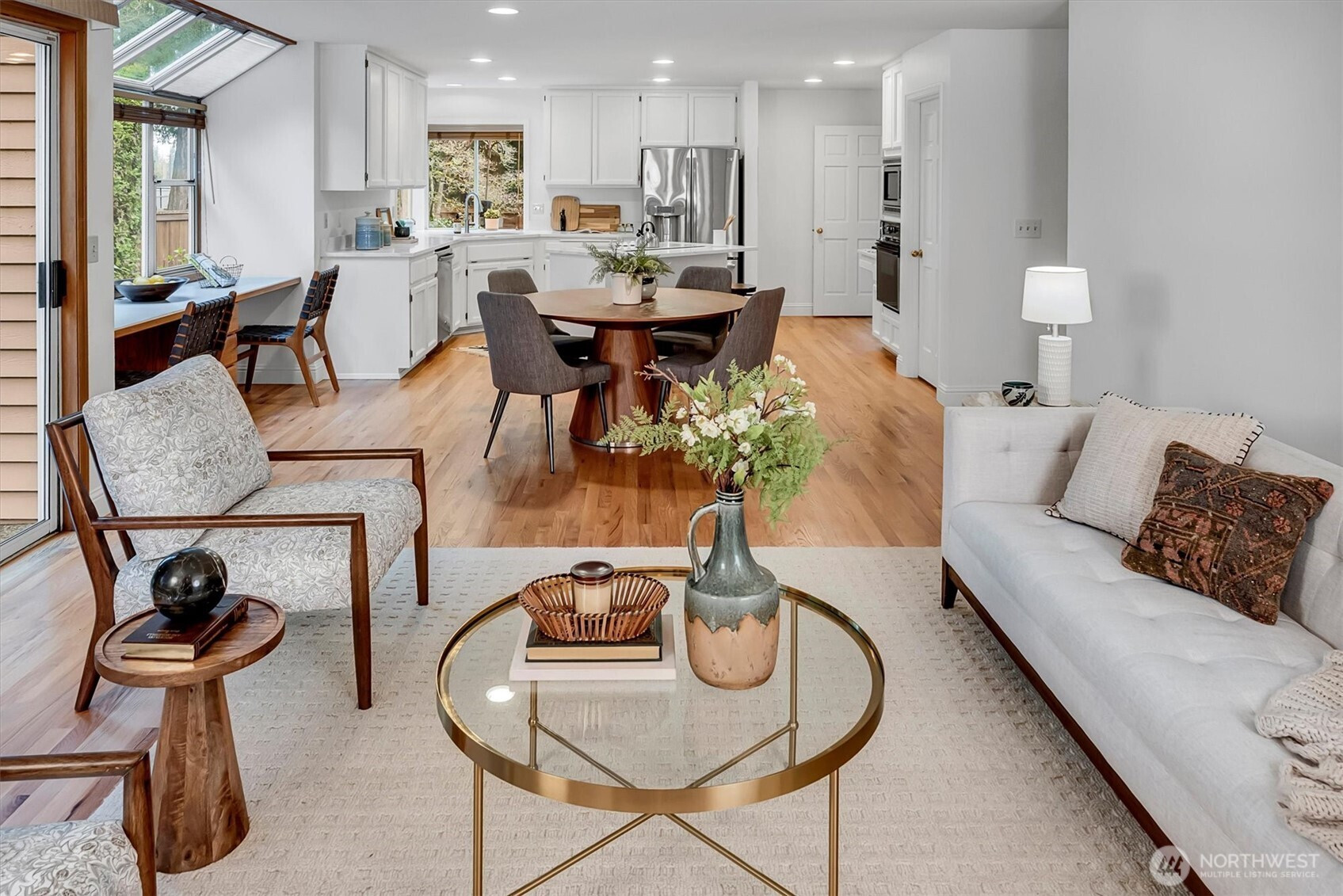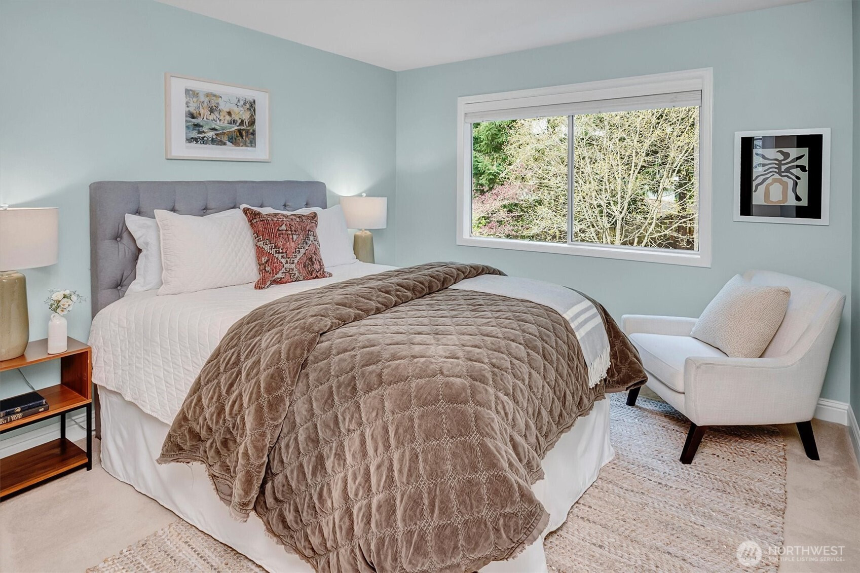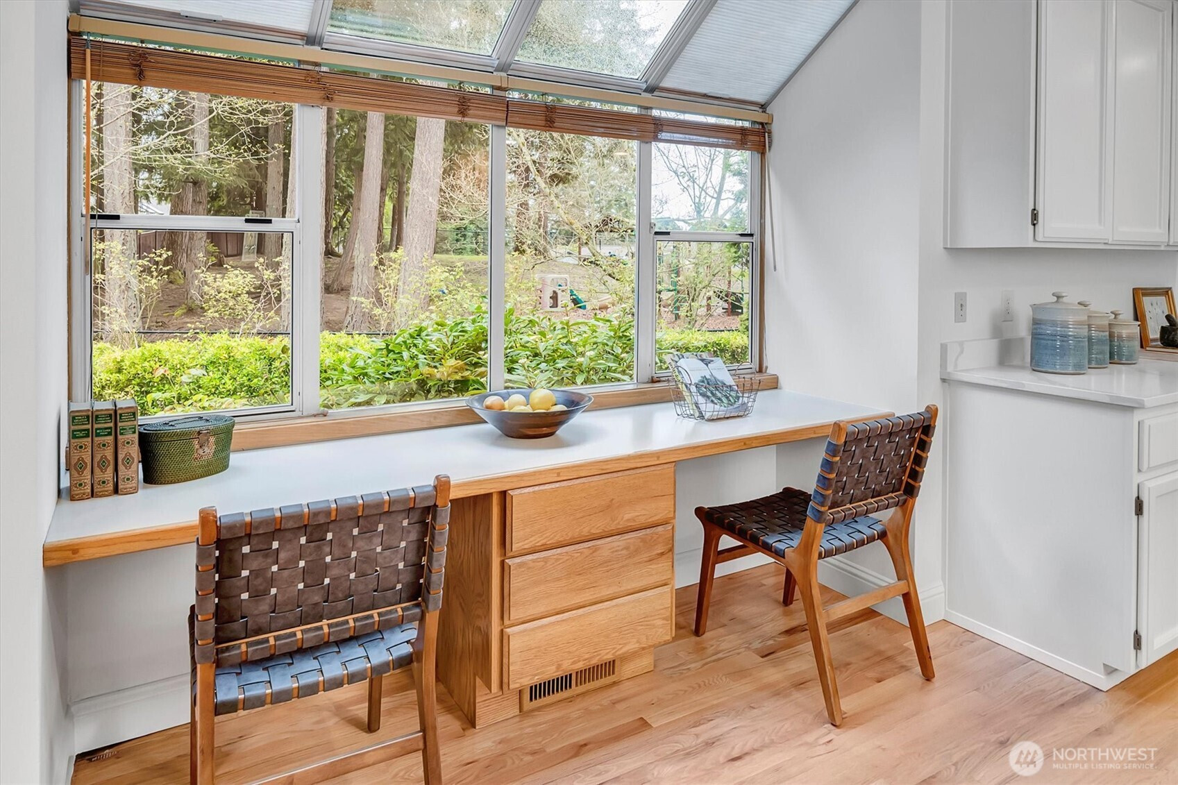 Thoughtfully updated Sammamish home tucked on a quiet cul-de-sac, offering 4 bedrooms plus a main floor office and 2.5 baths. A vaulted entry welcomes you in with a sense of space and light, while hardwood floors carry through the entry, kitchen, and great room. The kitchen features custom quartz counters and a built-in desk—perfect for homework, study, or everyday organization—and opens naturally to the surrounding living spaces with easy connection to the backyard, creating a comfortable flow for both daily life and gatherings. Two gas fireplaces add warmth and flexibility throughout. Fresh interior paint and new carpet provide a crisp, move-in ready feel. Upstairs, the primary suite is light-filled with a skylight and includes a 5-piece bath and walk-in closet for a comfortable, functional retreat. Additional bedrooms are generously sized. Set on a 7,567 sq ft lot, a true gardener's delight with beautiful trees and year round blooms as your backdrop, offering privacy and a peaceful outdoor setting. Central A/C, a 2-car garage, and quiet cul-de-sac location make it easy for settling in. Coveted Issaquah school district, close to Pine Lake parks, shopping, the Microsoft connector, and I-90. One year AHS warranty included for peace of mind.
