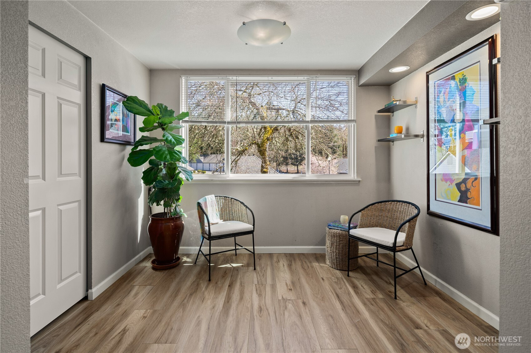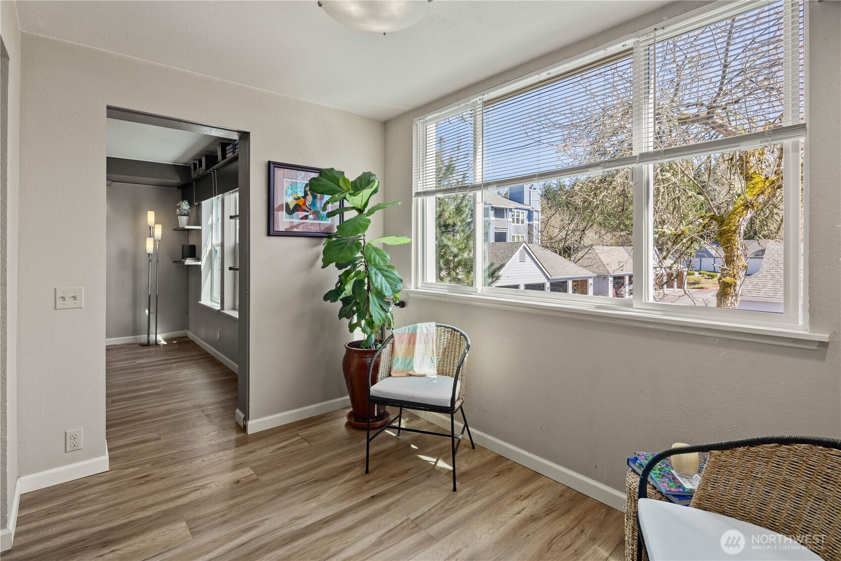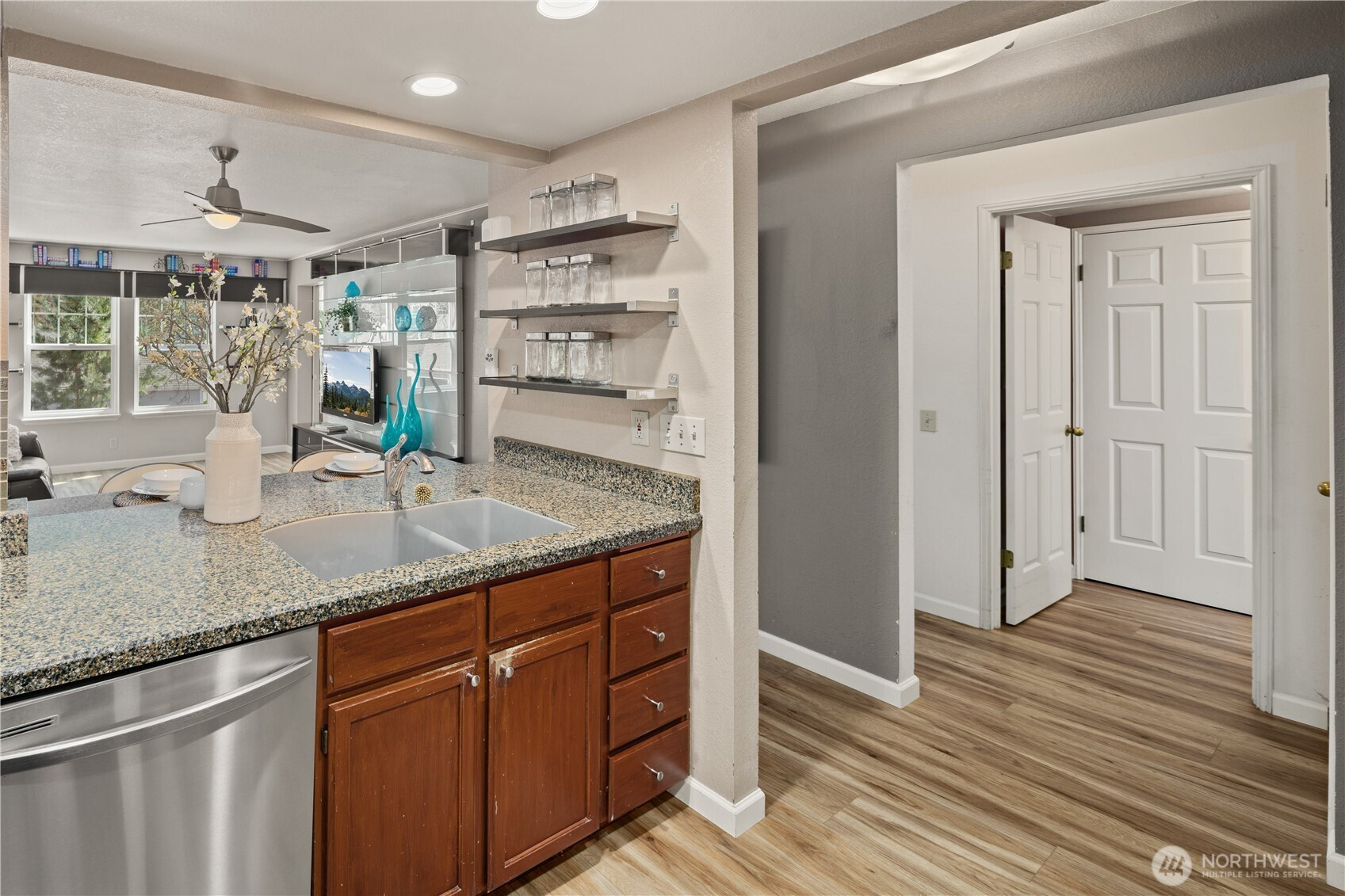 This charming 1-bedroom, 1-bath condo blends comfort, convenience, and effortless living in premier 55+ Providence Point. Step inside to luxury vinyl plank flooring throughout, a modern kitchen with stainless steel appliances (all under two years old), stone countertops, under-cabinet task lighting and an open living–dining layout ideal for everyday living. An enclosed sunroom extends the living space, offering a bright, versatile retreat perfect for lounging, hobbies, or a dedicated workspace. A pocket door allows you to close it off for added privacy. The spacious bedroom includes a walk-in closet, and the bathroom features a step-in shower for easy access. Additional perks include a private storage room just steps from the unit, an elevator close by, and an assigned parking space. The Winthrop Building enhances daily life with guest parking, inviting gathering areas on every floor, and a west-facing patio ideal for soaking up afternoon sun or enjoying friendly conversation. Residents enjoy a vibrant independent-living community with exceptional amenities: an indoor pool, clubhouse, fitness classes, tennis and pickleball courts, putting green, pea-patch gardens, scenic walking trails, and a full calendar of social, cultural, and recreational events.