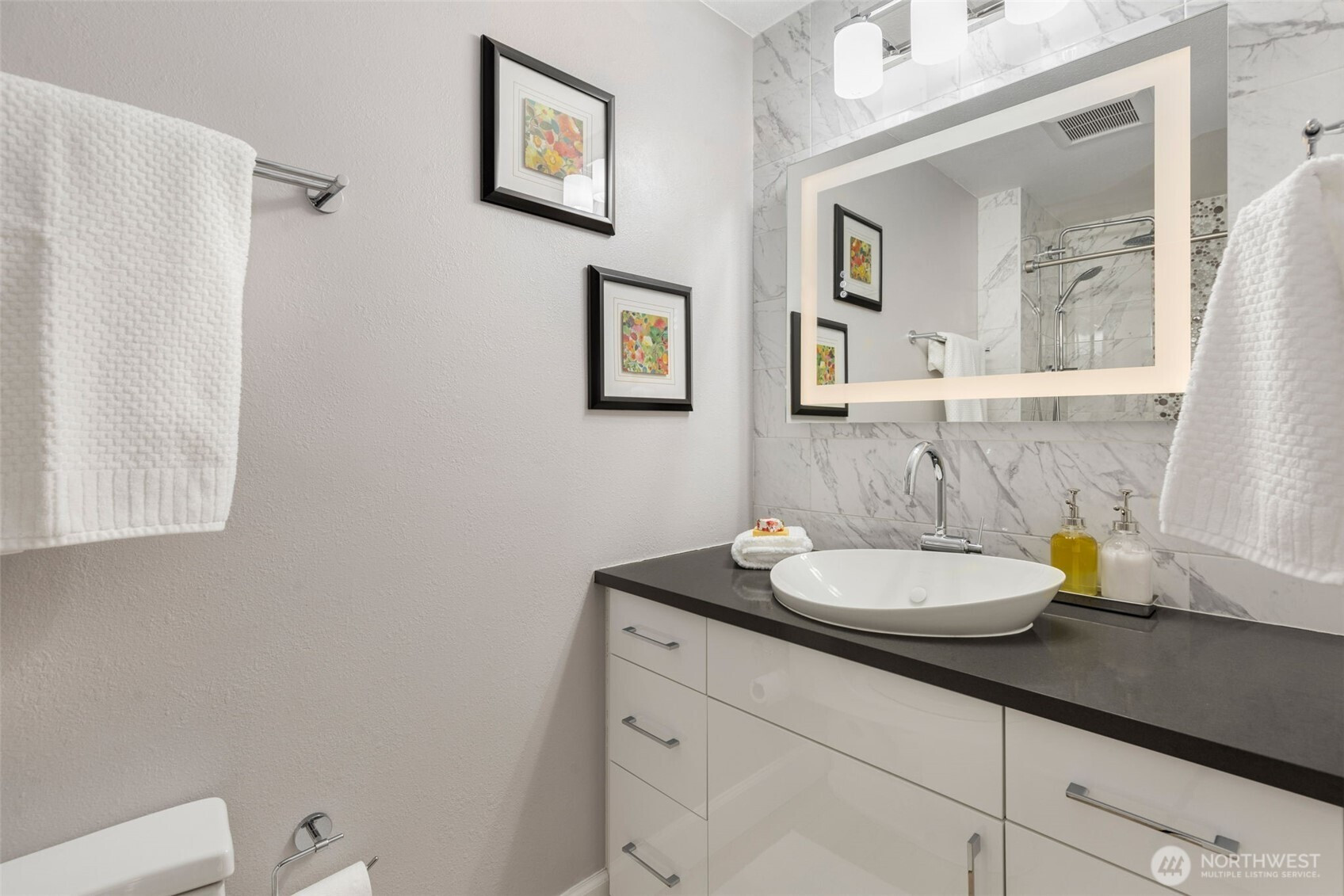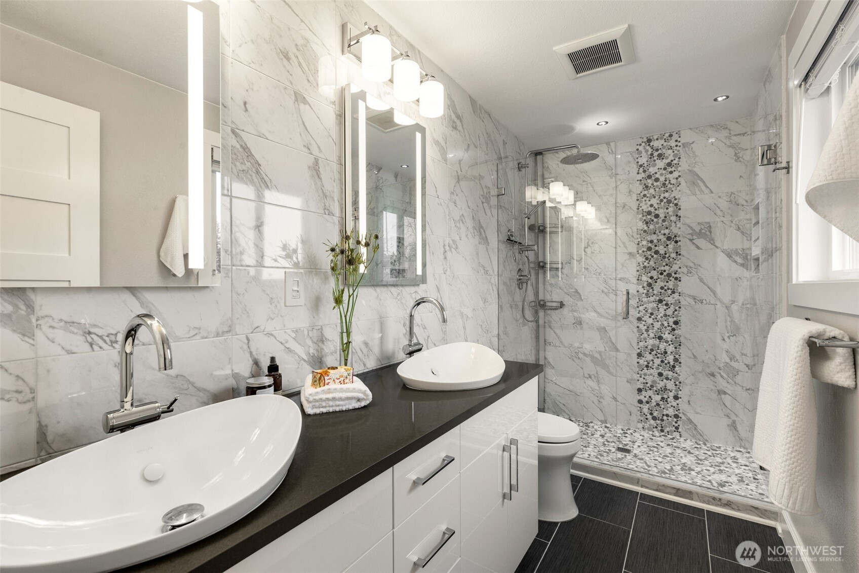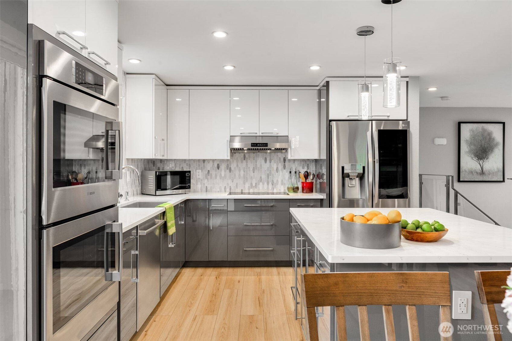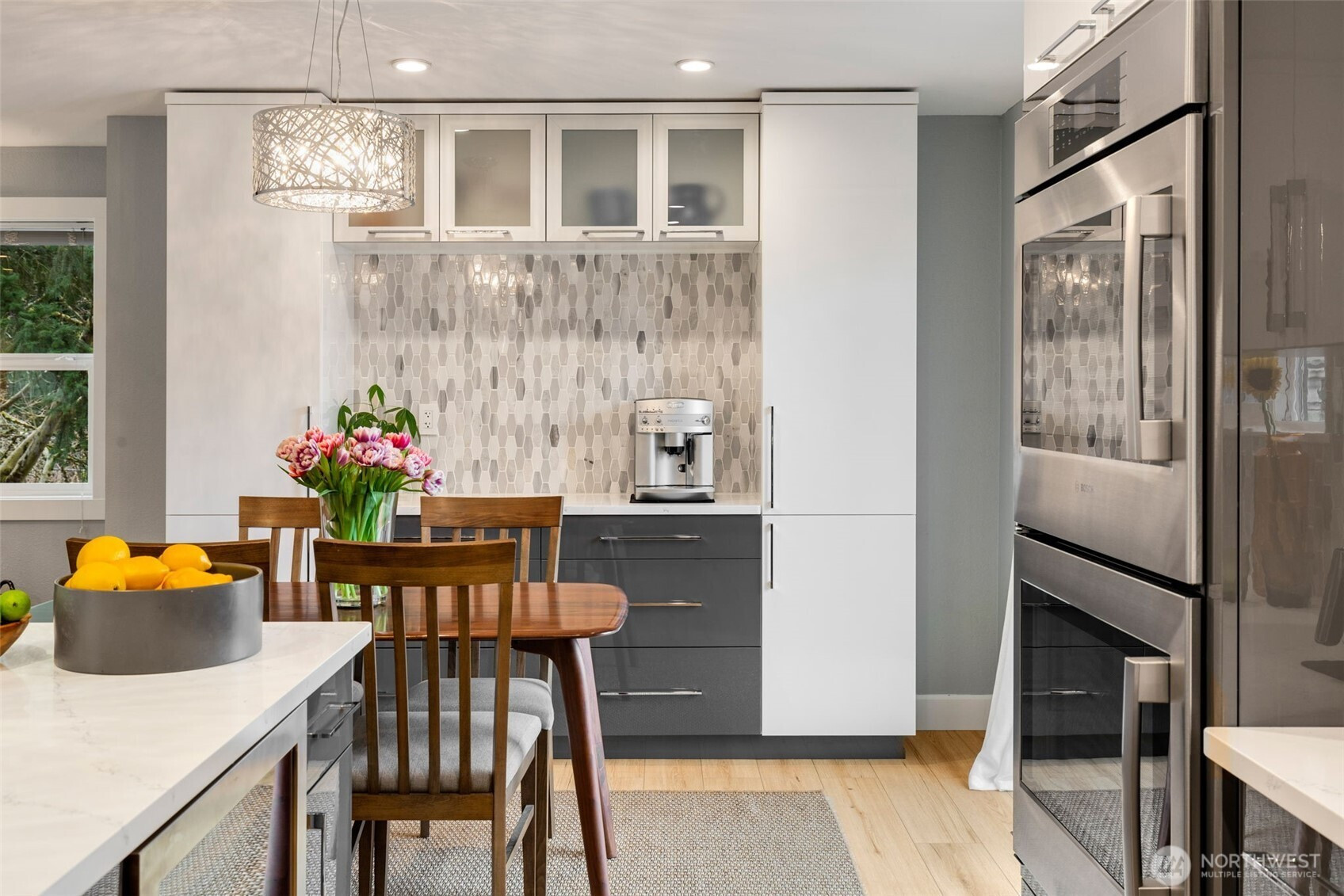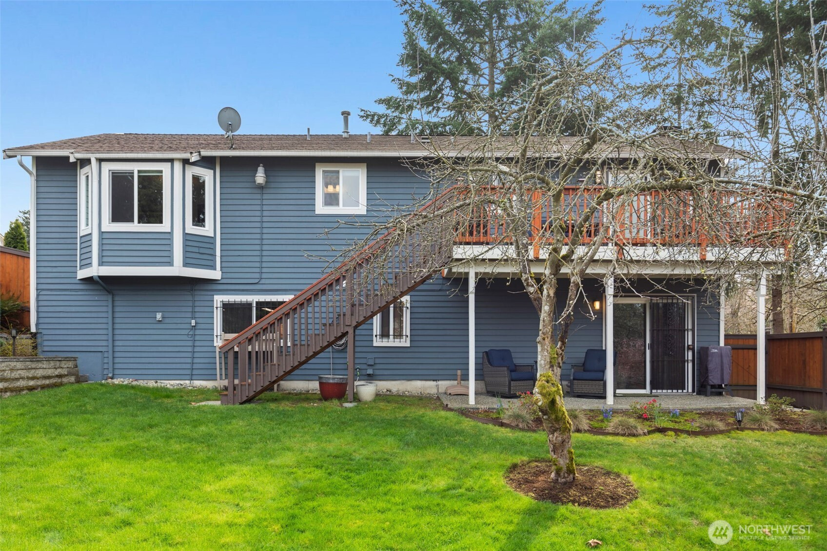 Immaculate split-level on a corner lot in a stellar location. Just minutes from I-405 and The Landing, this home offers easy access to everything—yet lives quietly tucked away from it all. Meticulously maintained inside and out, it delivers effortless living with thoughtful updates throughout. Light-filled great room style living spaces center around a welcoming living room with fireplace. An expansive, fully equipped kitchen with generous island flows seamlessly to the dining area and out to a spacious deck—ideal for summer entertaining—with filtered northwest-facing lake views beyond. Three bedrooms on the main level feature excellent closet space with built-in systems.En-suite primary with luxe bathroom, showcasing extensive tile work. Downstairs, impressive ceiling height elevates the rec room with a second fireplace, while a versatile flex space with patio access easily serves as a home office, guest room, or fourth bedroom. A three-quarter bath and utility room add function. Oversized attached two-car garage with shop area. Level, fully fenced backyard with low-maintenance landscaping, shed, and gated access with room for RV parking. Central A/C and smart features throughout. Move-in ready and perfectly dialed for everyday living.