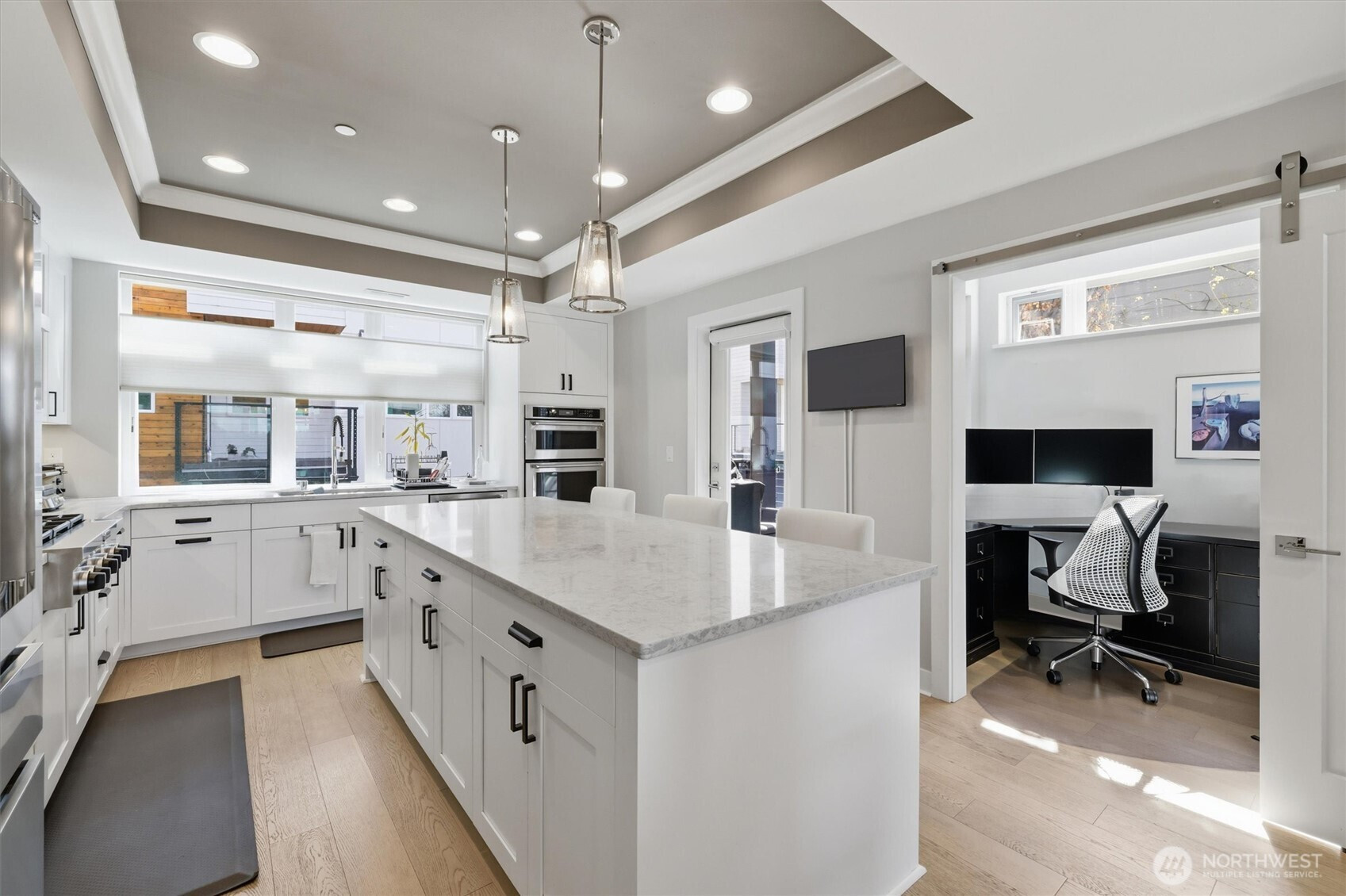 Welcome to Newport Commons—where thoughtful design meets unbeatable convenience. This beautifully crafted 2019 townhome offers a light-filled, open-concept main level with rich hardwoods, crown molding, shiplap accents, and a kitchen enhanced with custom pull-out shelving for effortless access and organization. Three spacious bedrooms each feature private ensuite baths, creating a rare and highly functional layout. A dedicated office supports today’s work-from-home needs, while the lower-level flex space is ideal for a media room, playroom, or guest retreat. Custom built-ins in the foyer and garage maximize storage, complemented by a 2-car garage for everyday ease. Ideally located within walking distance to Factoria Mall, T&M Superstore, dining, and daily amenities, with seamless access to I-90 and I-405 for quick commutes to Bellevue and Seattle. Walking distance to Tyee Middle and Newport High, this home delivers comfort, versatility, and long-term value.