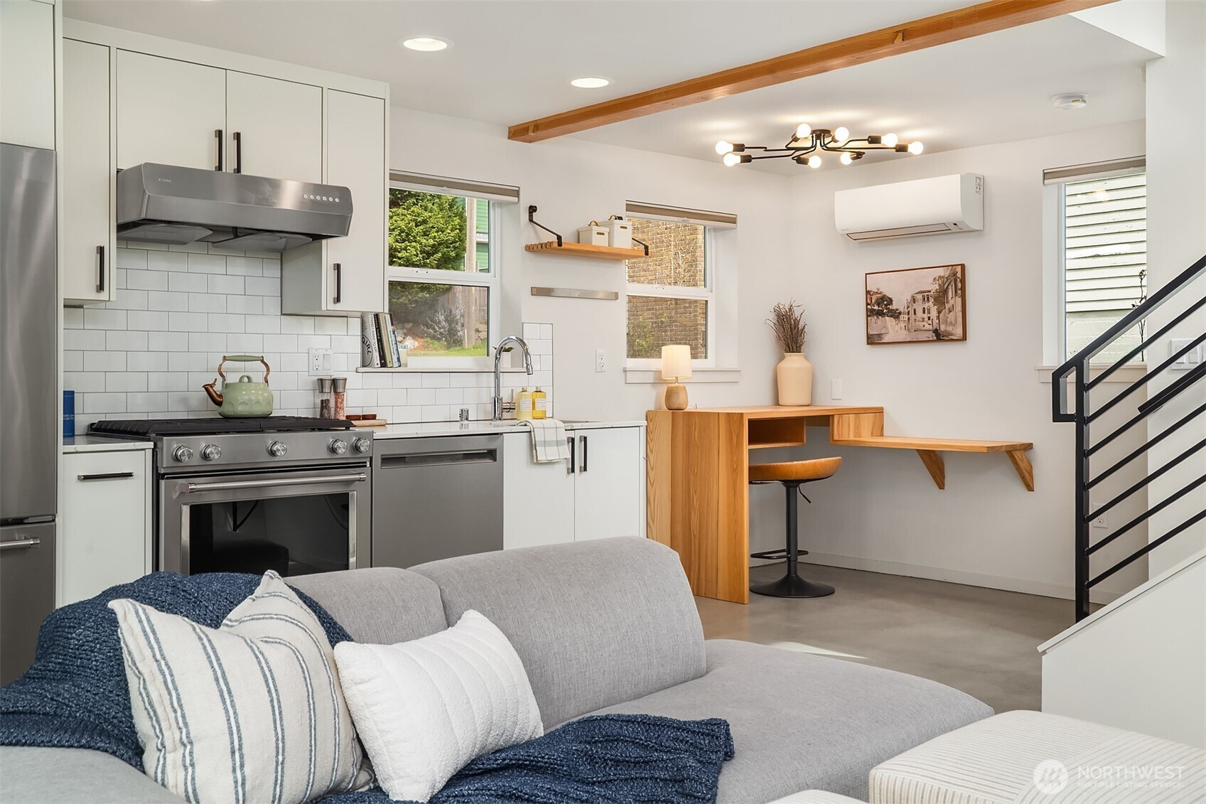 Maple Leaf standalone cottage built 2019 by Ashworth Homes - modern finishes and a layout that just works. Tucked off the main street, the main level features concrete floors, a gas range and fireplace, quartz counters and custom hickory built-in that doubles as a standing desk - warm, functional, and beautifully crafted. Enjoy outdoor living with a fully fenced private patio and garden space. Upstairs, tall windows pour light into the stairwell before opening into a stunning bedroom with vaulted ceilings, walk-in closet, and a full bath. At golden hour, the bedroom glows. Tankless water heater, ductless mini-splits, washer/dryer, custom blinds and designated parking with EV charging hook-up. No HOA, no rental restrictions - perfect as a primary residence or investment property for short-term or long-term rentals. Minutes from Green Lake, PCC, Amazing cafes and restaurants and freeways for commuting. The condo alternative you've been waiting for!