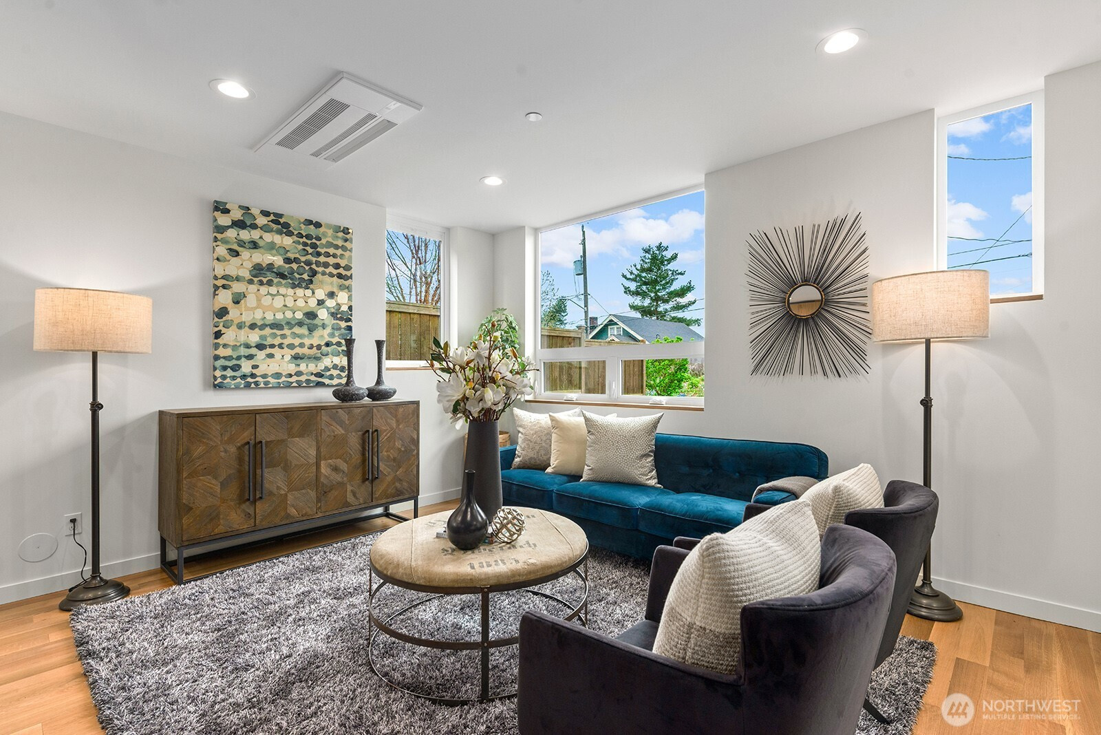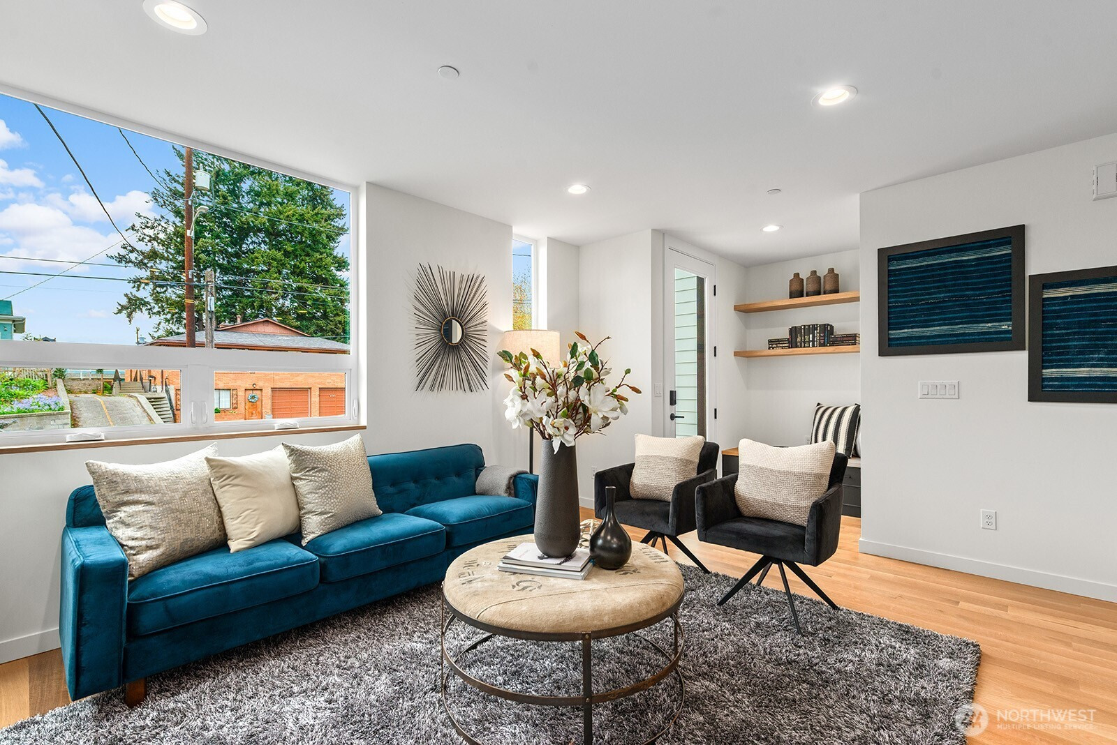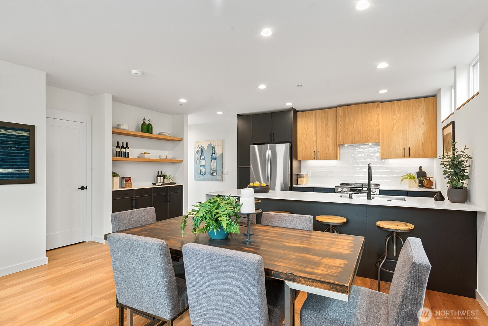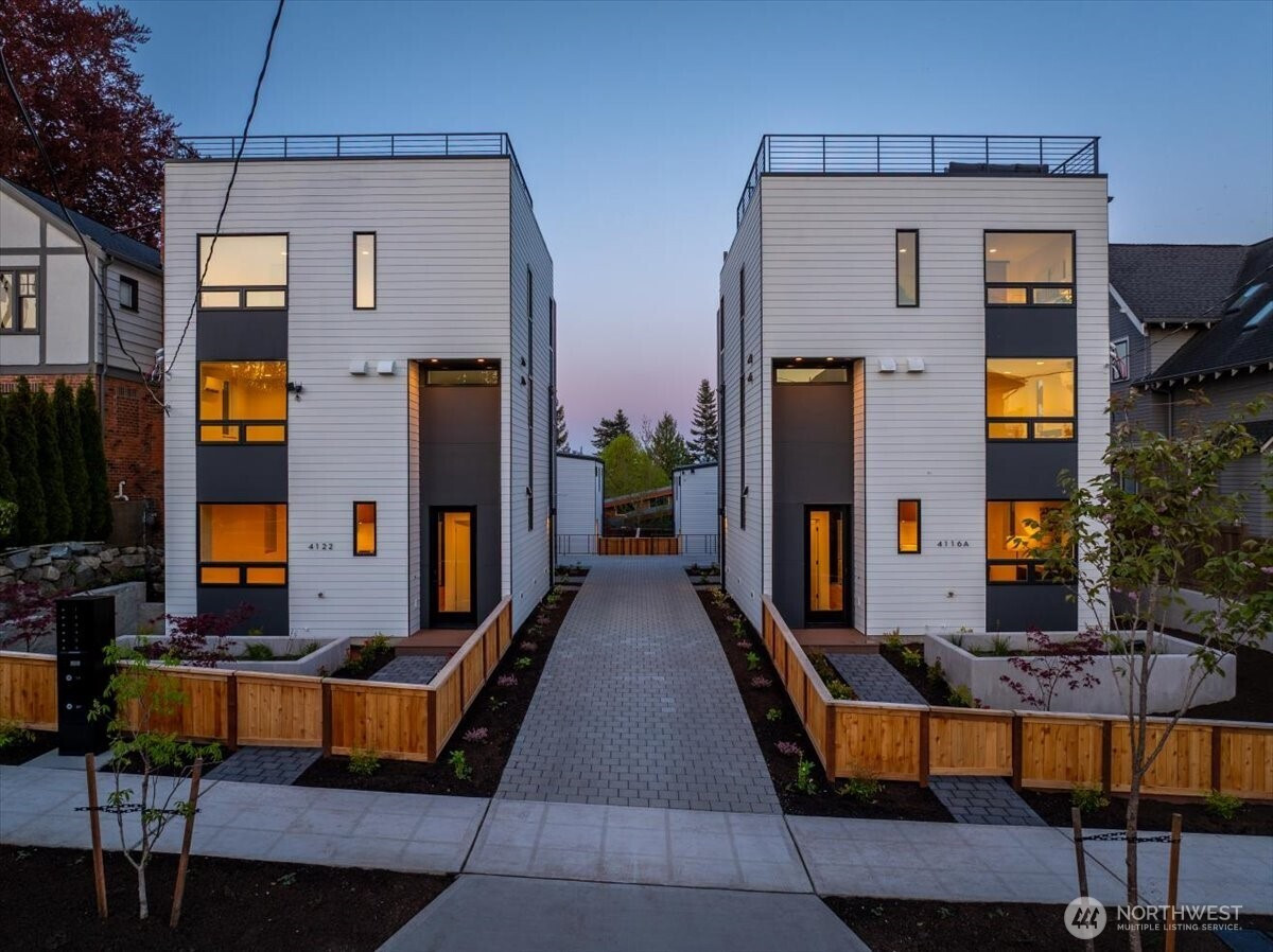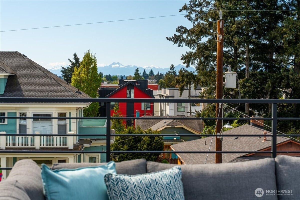 Stunning new construction by Build Sound, ideally positioned in the heart of Wallingford. This thoughtfully executed 3-bedroom + OFFICE, 2.25 bath home showcases crisp modern architecture, clean lines, REAL hardwood floors, elevated finish quality, and picturesque Seattle views. The main level features an open-concept kitchen designed for entertaining, complete with sleek custom cabinetry, a generous island, and high-end stainless steel appliances. The expansive windows flood the living and dining areas with natural light and the built-ins deliver custom-level detailing. On the second floor, you’ll find two bedrooms, a full laundry room, and a stylish shared bath. The third level is a true primary retreat, offering a walk-in closet, a luxurious ensuite bathroom, and a versatile bonus space ideal for a home office, den, nursery, or additional closet space. Top it all off with a spectacular rooftop deck showcasing sweeping views of the Olympic + Cascade Mountains and the Space Needle and cityscape —an entertainer’s dream and a serene escape. With a Walk Score of 91, enjoy effortless access to Wallingford’s vibrant lineup of shops, restaurants, cafes, parks, and more. Additional highlights include dedicated EV ready off-street parking, mini-splits for efficient heating and cooling, fully fenced + landscaped front yard, and easy access to I-5 and Highway 99. If you’re looking for well-located new construction built to last, this exceptional home checks every box.