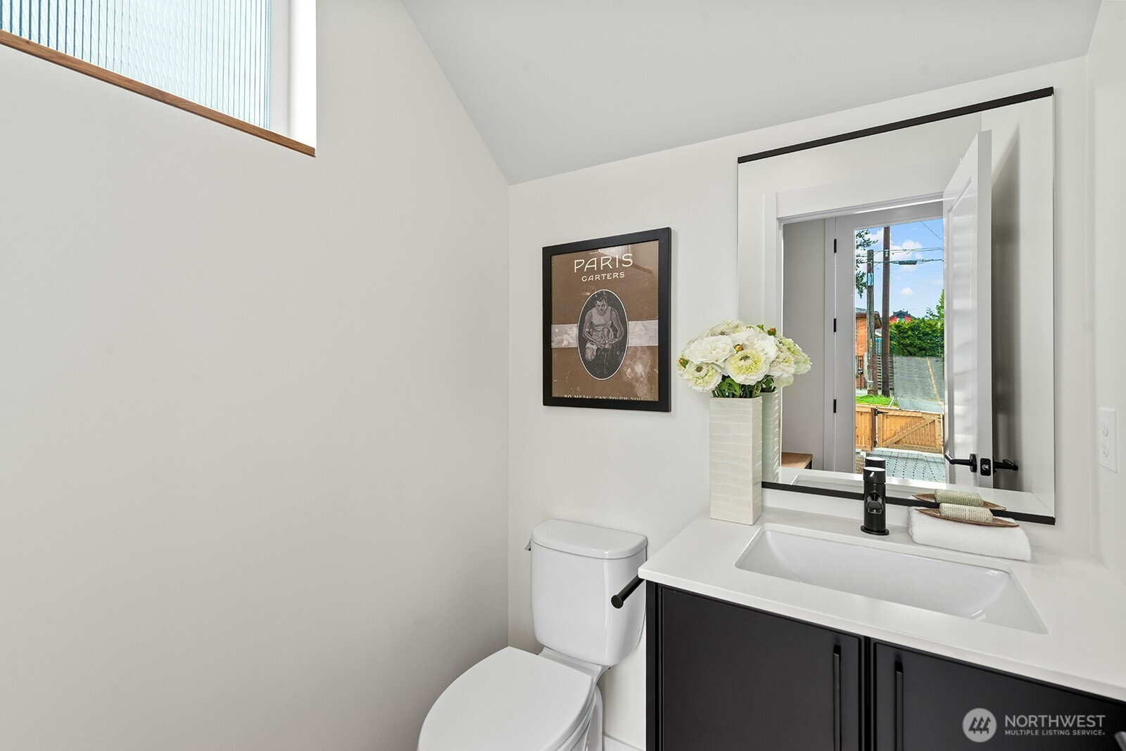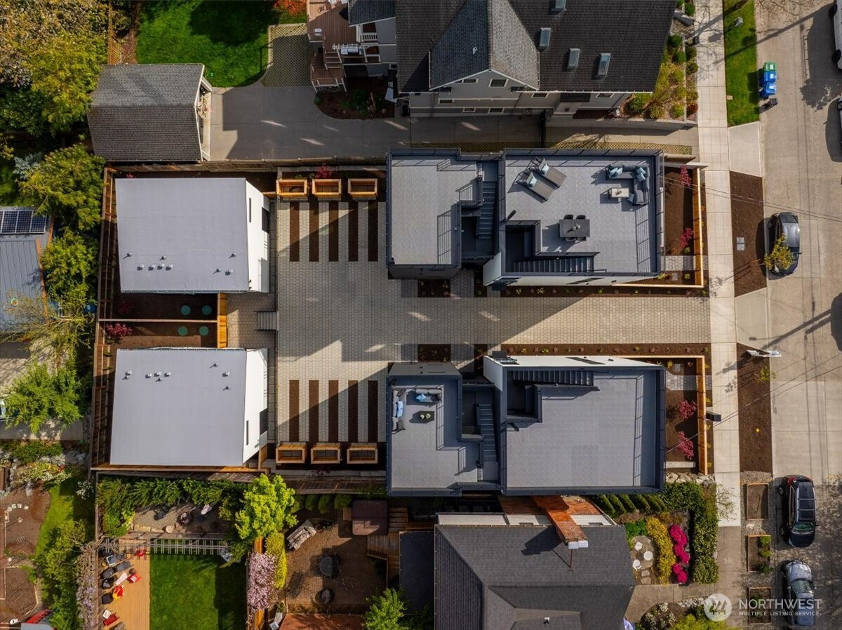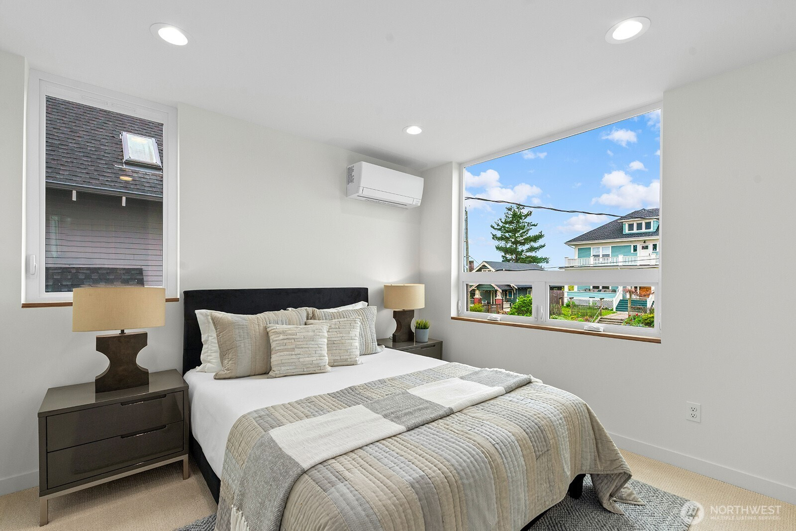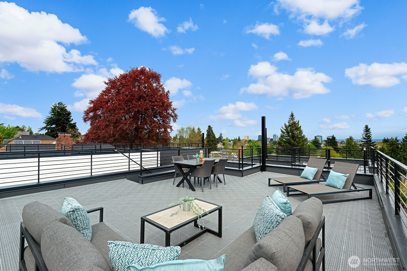 Stunning new construction by Build Sound, ideally positioned in the heart of Wallingford. This thoughtfully executed 3-bedroom + OFFICE, 2.25 bath home showcases crisp modern architecture, clean lines, REAL hardwood floors, elevated finish quality, and picturesque Seattle views. The main level features an open-concept kitchen designed for entertaining, complete with sleek custom cabinetry, a generous island, and high-end stainless steel appliances. The expansive windows flood the living and dining areas with natural light and the built-ins deliver custom-level detailing. On the second floor, you’ll find two bedrooms, a full laundry room, and a stylish shared bath. The third level is a true primary retreat, offering a walk-in closet, a luxurious ensuite bathroom, and a versatile bonus space ideal for a home office, den, nursery, or additional closet space. Top it all off with a spectacular rooftop deck showcasing sweeping views of the Olympic + Cascade Mountains and the Space Needle and cityscape —an entertainer’s dream and a serene escape. With a Walk Score of 91, enjoy effortless access to Wallingford’s vibrant lineup of shops, restaurants, cafes, parks, and more. Additional highlights include dedicated EV ready off-street parking, mini-splits for efficient heating and cooling, fully fenced + landscaped front yard, and easy access to I-5 and Highway 99. If you’re looking for well-located new construction built to last, this exceptional home checks every box.