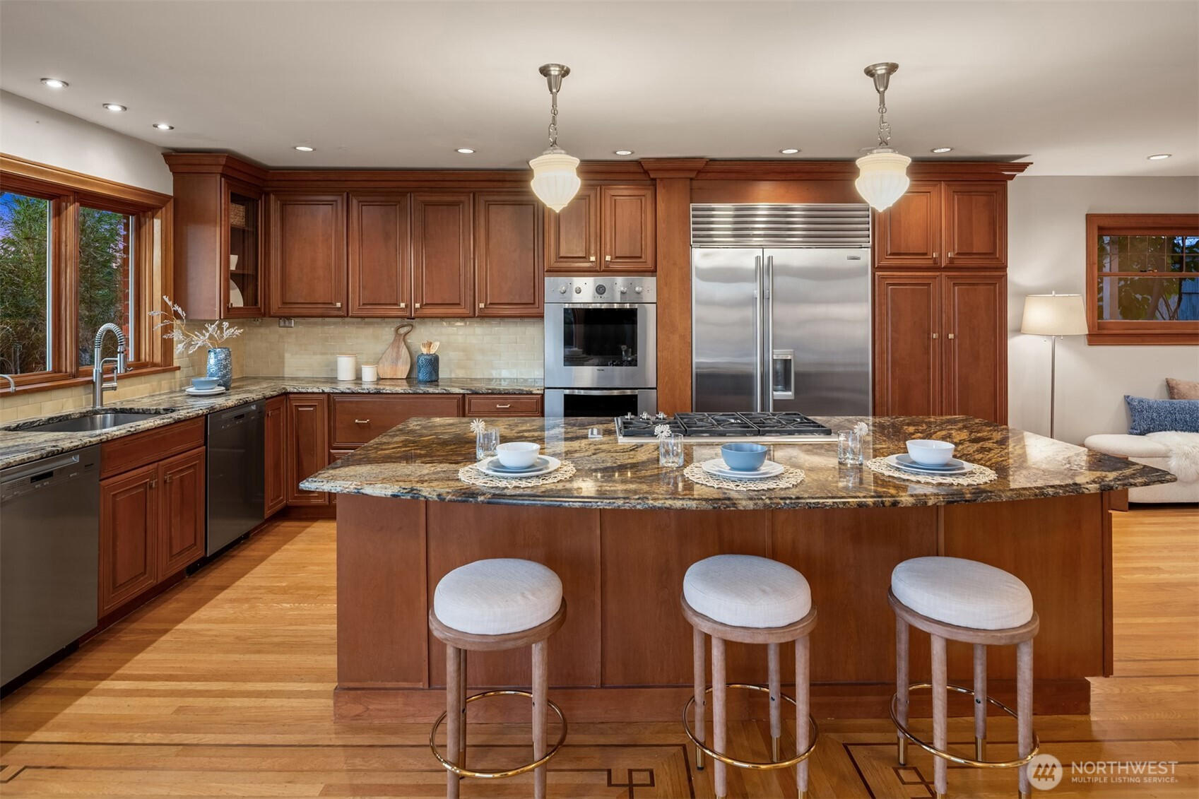 An idyllic nod to Laurelhurst living with lake views and modern conveniences on the coveted “Boulevard”. A rare offering, blending the soul of Tudor architecture with grand spaces, an open-chef’s kitchen featuring two Miele dishwashers, Wolf cooktop, Viking range and SubZero refrigerator. The main level also features a versatile office with built-ins, bath, dining room, grand living room, and view terrace spanning the kitchen/great room. Enviable upper level with four bedrooms and two baths highlighted by a primary bedroom with spa bath, walk-in closet, laundry with double washers and dryers, spacious attic, and view deck to enjoy brilliant sunsets. The lower level leaves nothing to chance with a rec. room, guest bed, bath, gym, storage, and wine room. Expansive back yard is a canvas for entertaining, athletic endeavors, and gardening. Located in Laurelhurst Beach Club boundary with ample off-street parking and a garage with ADU capability. This is the one!