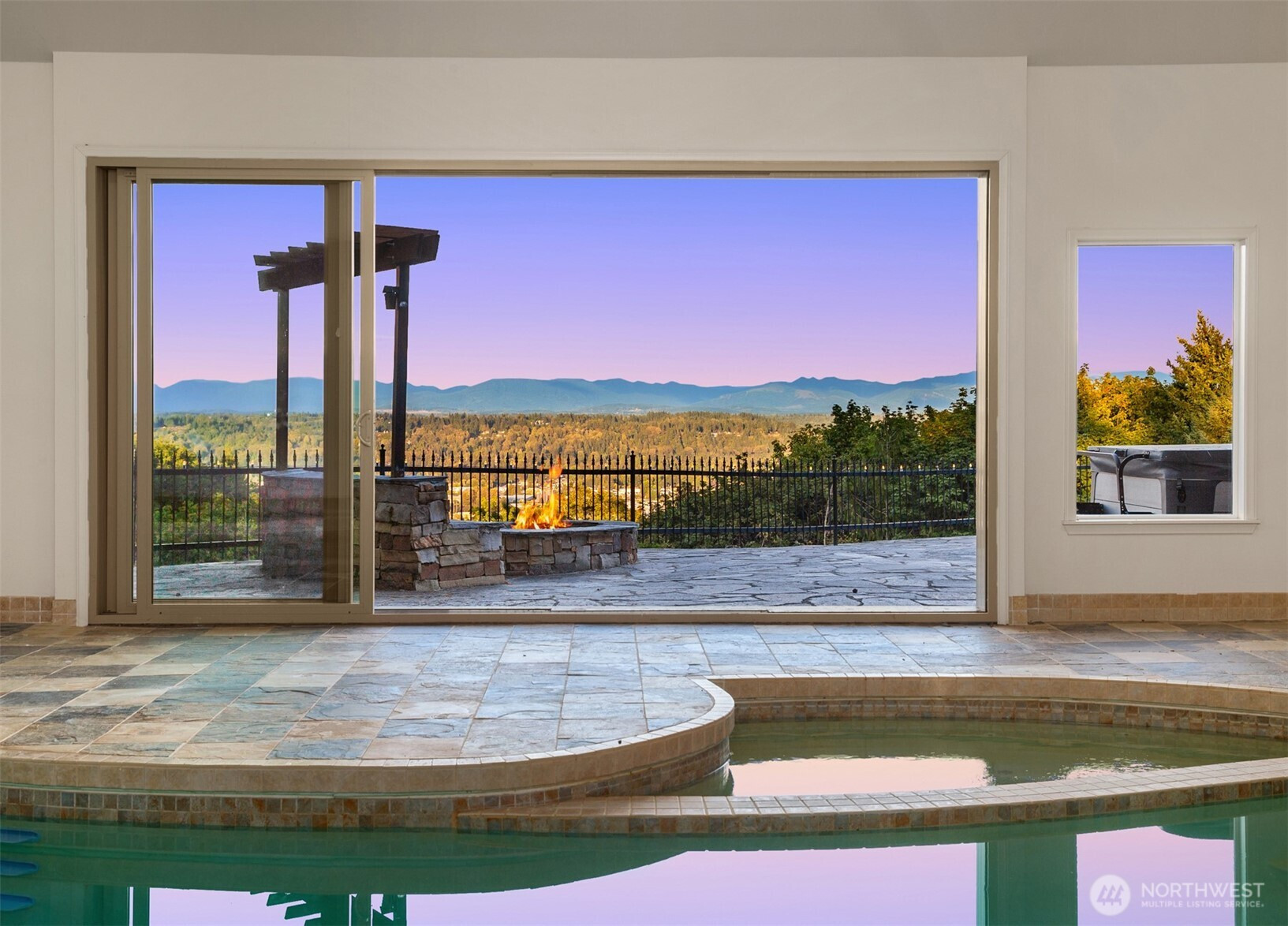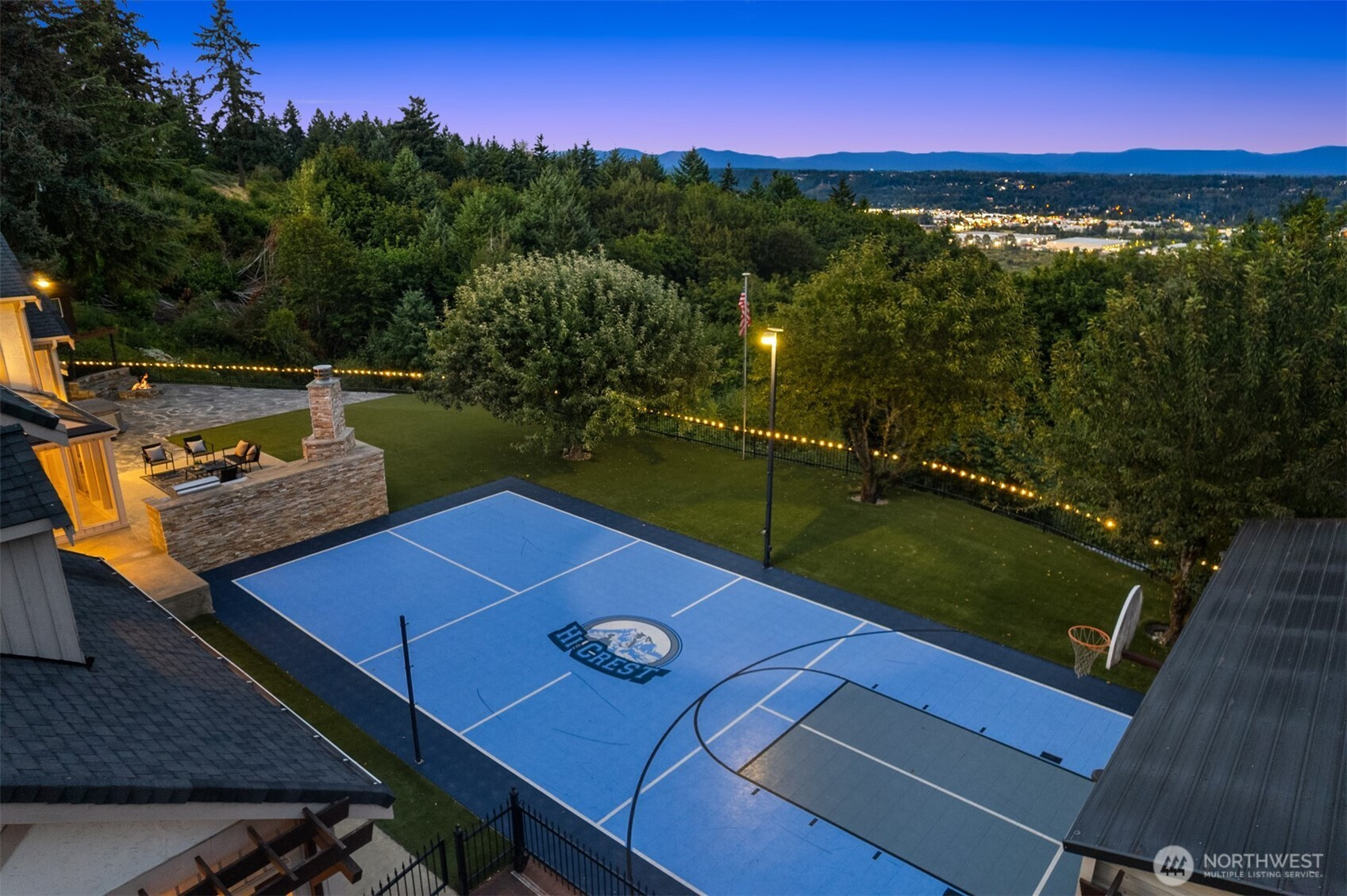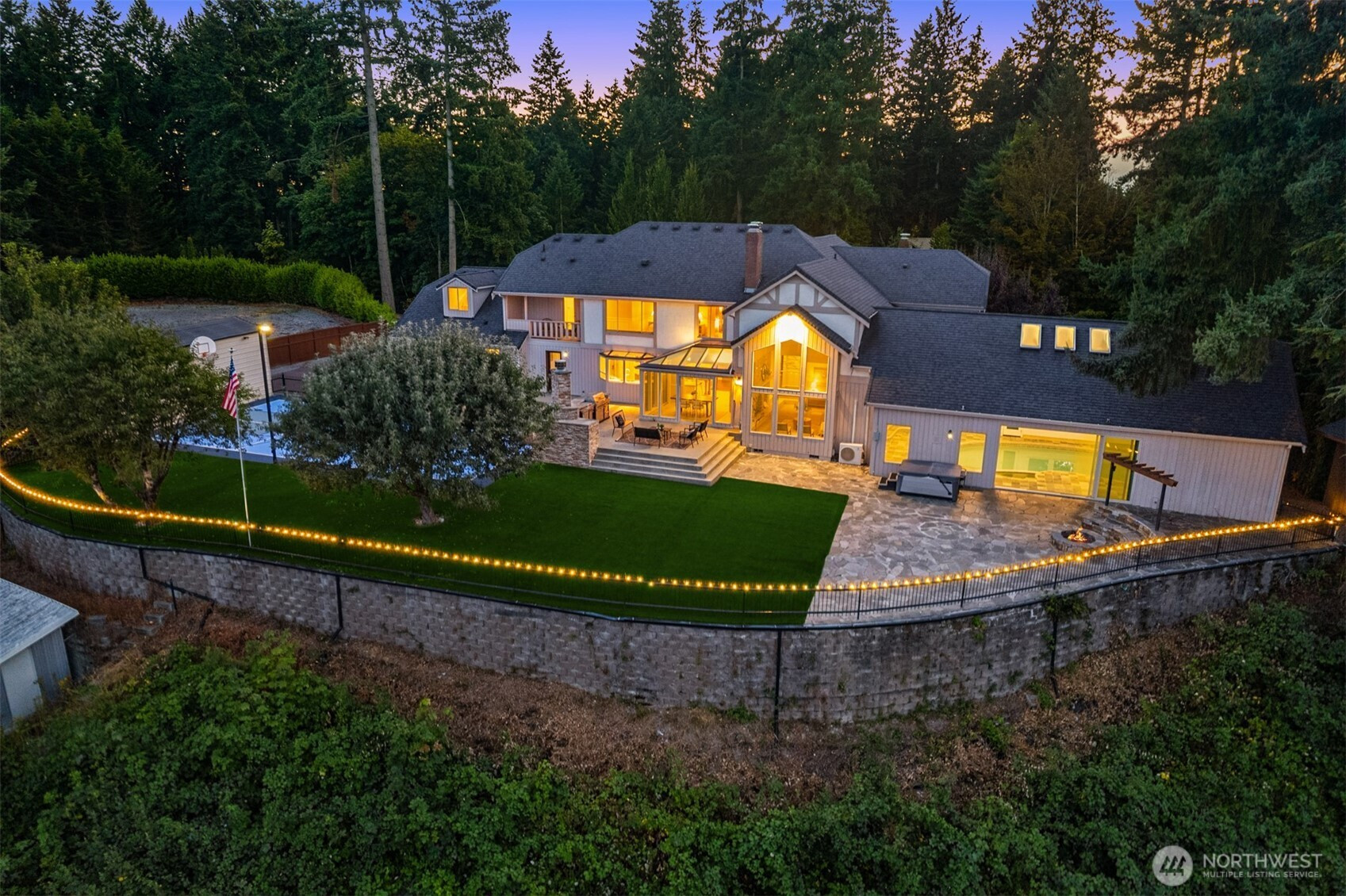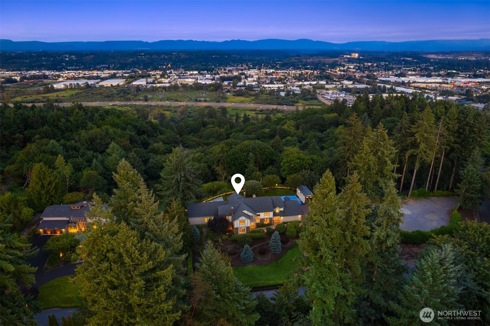 Beautiful Tudor Estate with Cascade Views. Enjoy stunning sunrises over the Cascades and sparkling city lights from this exceptional home in an exclusive 7-home gated community. This elegant home features soaring ceilings and thoughtful updates including new carpet, fresh paint, and updated lighting throughout. The indoor swimming pool room offers a 4-panel sliding glass wall for seamless indoor-outdoor living. A guest apartment with kitchen and bath, outdoor kitchen, sport court, and hot tub provides wonderful entertaining options. The additional 600 SF detached garage offers plenty of storage space. Located minutes from I-5, Hwy 18, and Hwy 167 while maintaining complete privacy - the perfect blend of luxury and accessibility.
