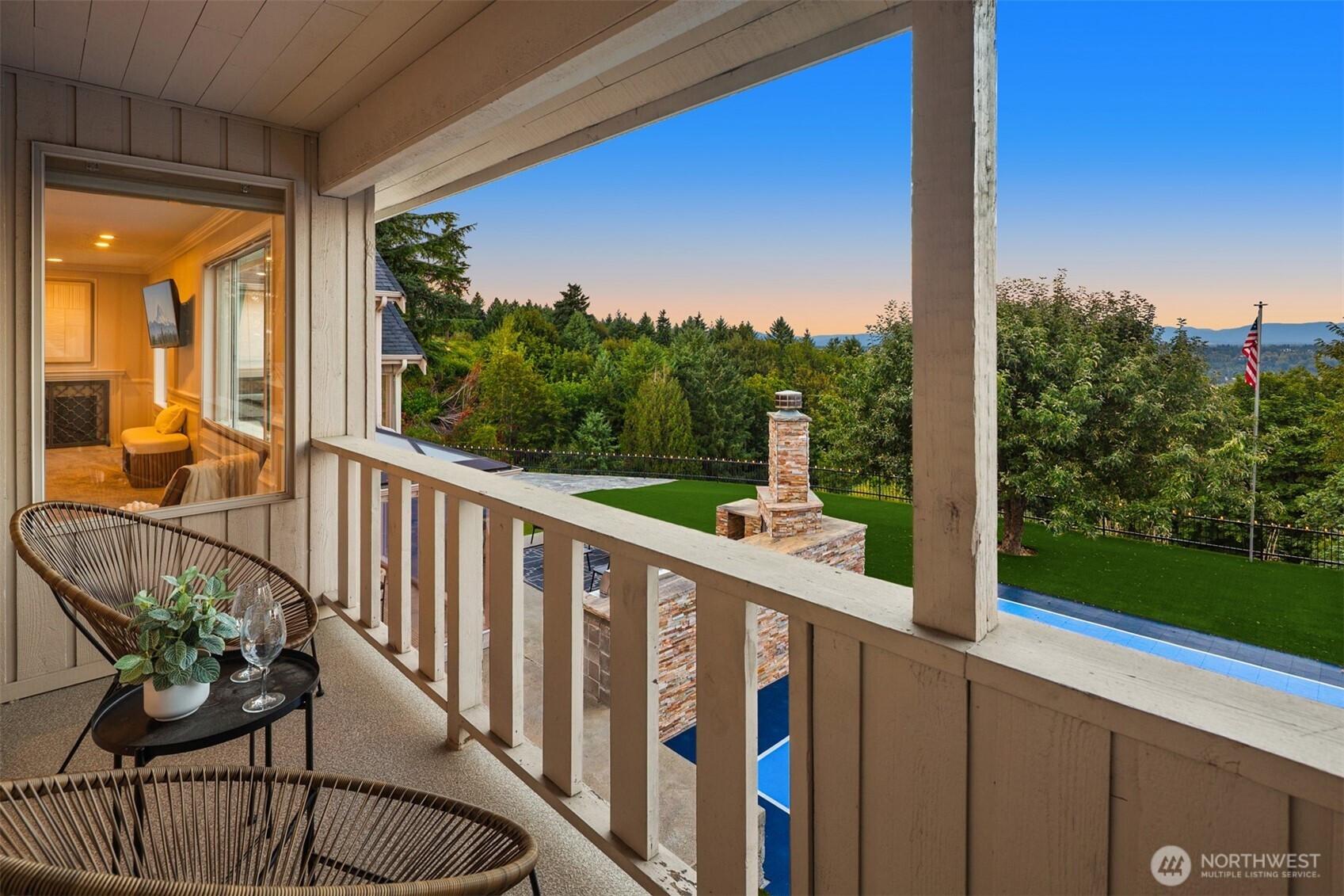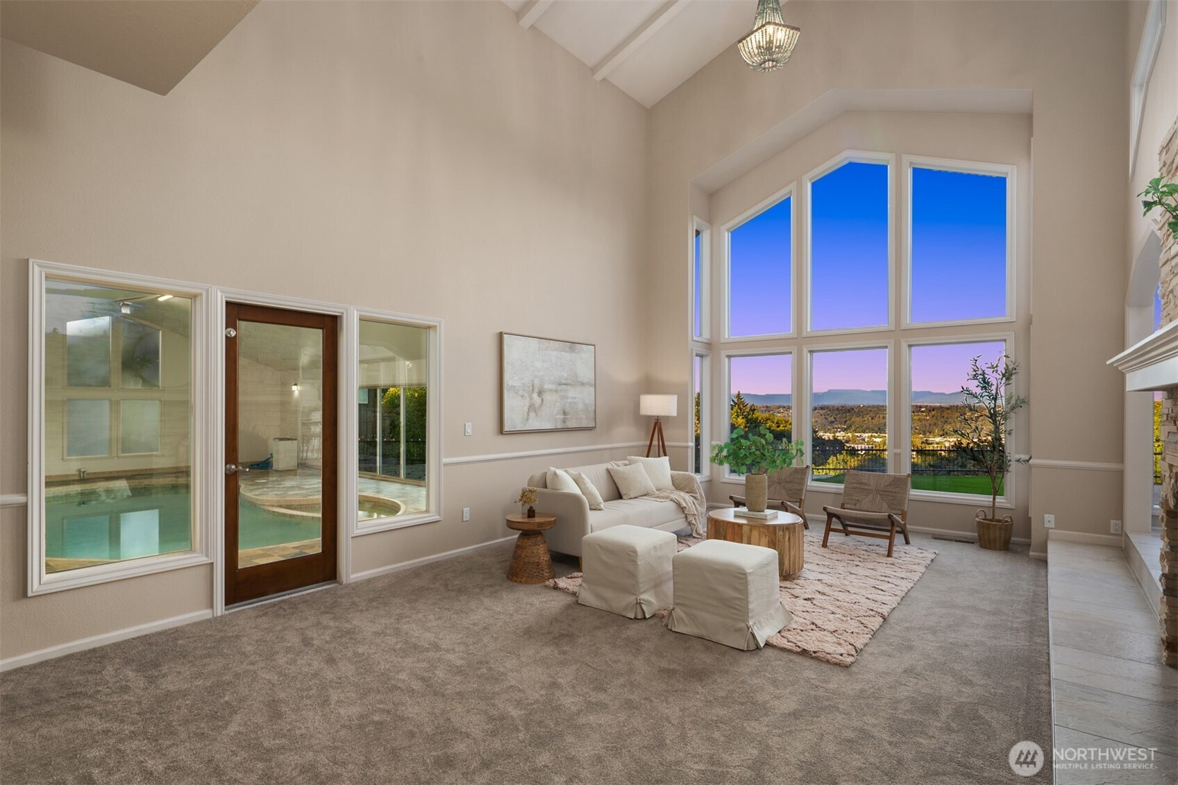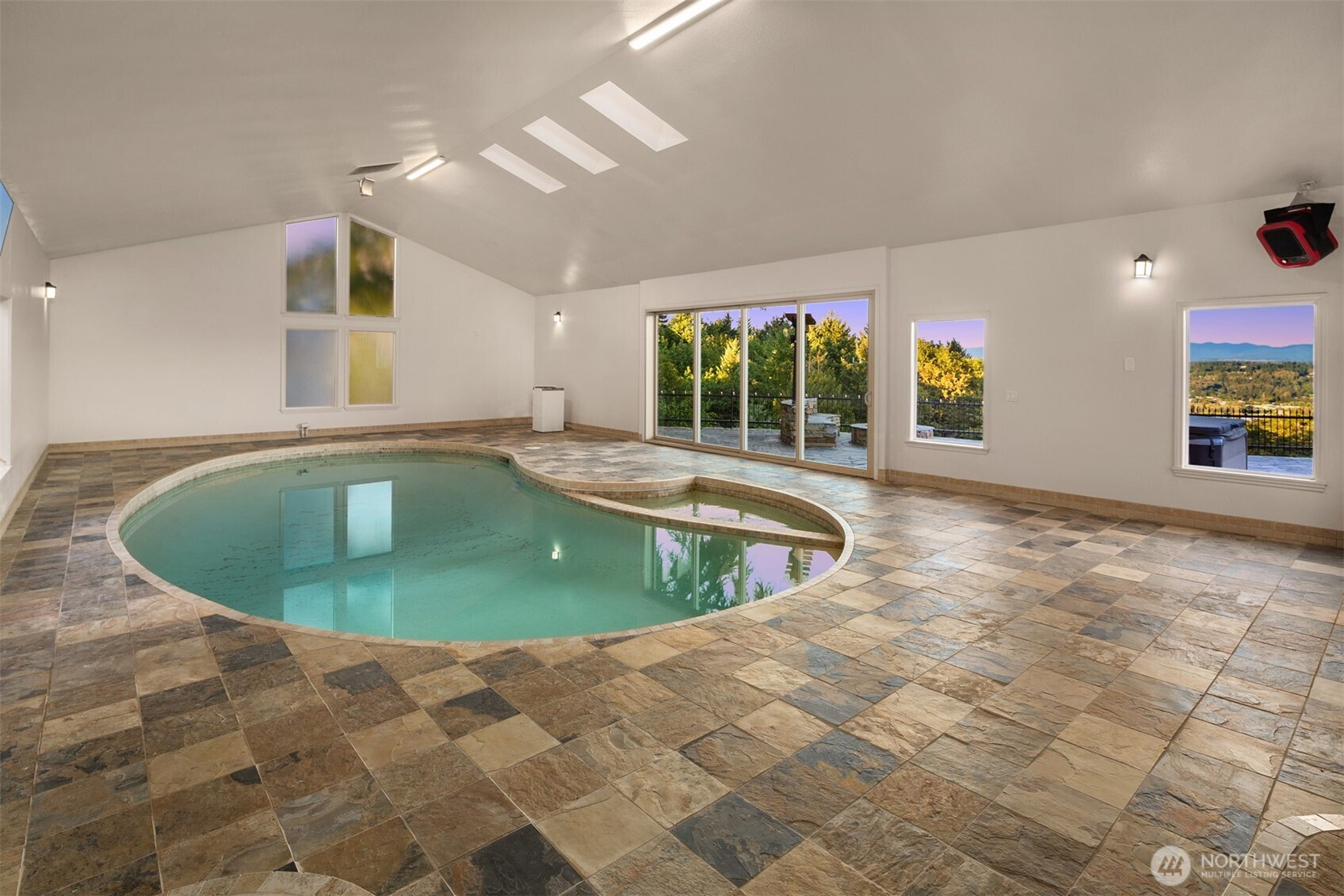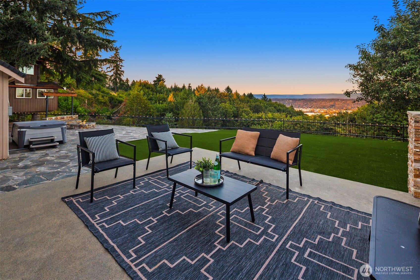 Beautiful Tudor Estate with Cascade Views. Enjoy stunning sunrises over the Cascades and sparkling city lights from this exceptional home in an exclusive 7-home gated community. This elegant home features soaring ceilings and thoughtful updates including new carpet, fresh paint, and updated lighting throughout. The indoor swimming pool room offers a 4-panel sliding glass wall for seamless indoor-outdoor living. A guest apartment with kitchen and bath, outdoor kitchen, sport court, and hot tub provides wonderful entertaining options. The additional 600 SF detached garage offers plenty of storage space. Located minutes from I-5, Hwy 18, and Hwy 167 while maintaining complete privacy - the perfect blend of luxury and accessibility.