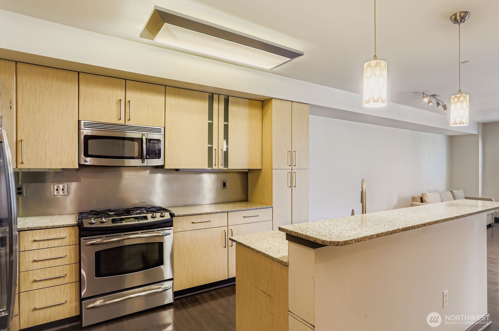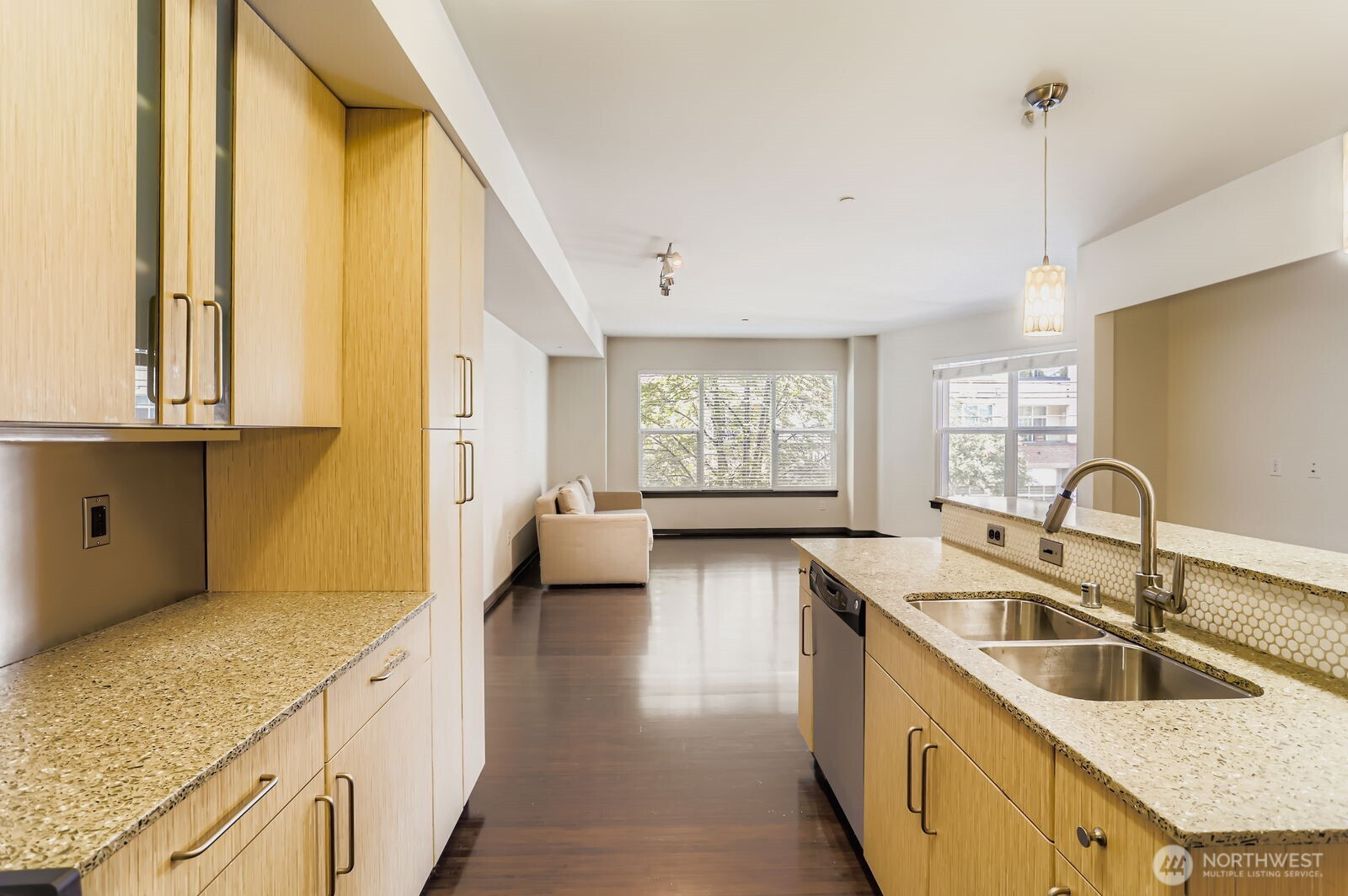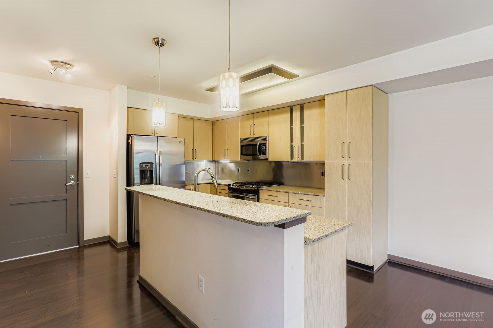 Experience luxury and convenience in this move-in ready condo located in the heart of Green Lake! Unit 207 features a functional, spacious kitchen with stainless steel appliances, gas stove, and breakfast bar—ideal for both cooking and entertaining. The open layout includes easy maintenance flooring, a bright living/dining area, in-unit washer/dryer, and generous storage throughout. The building offers secure entry, a community room, rooftop deck, and garage parking. Just steps to Green Lake, PCC, cafes, shops, and light rail—this location truly has it all. No rental cap and up to 2 pets allowed. Don’t wait—this one won’t last! Future update project fully funded.