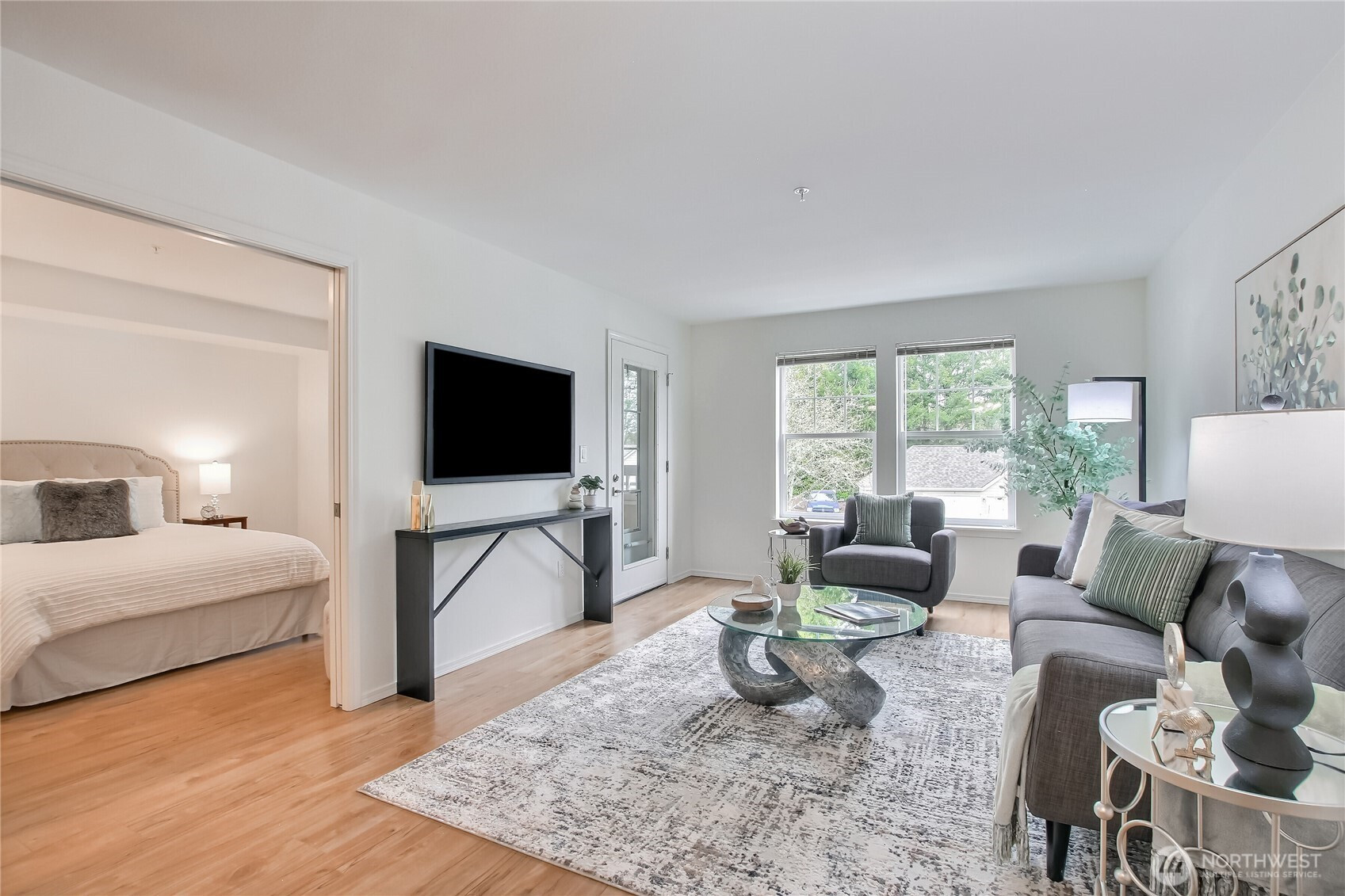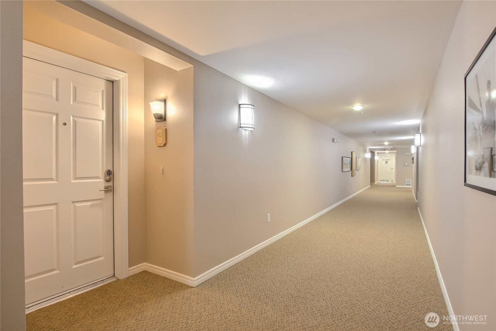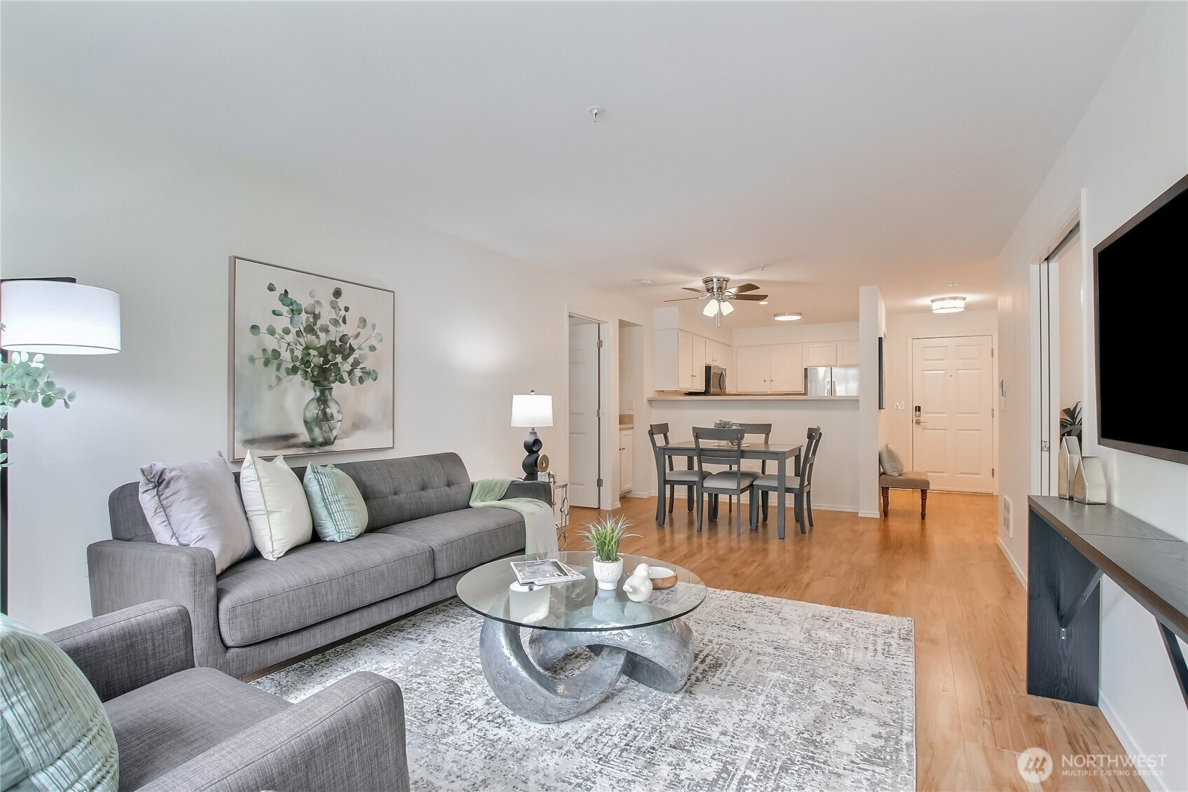 Move in ready, 2 bed 1.75 bath home in the desirable Pacific Building in Washington Village at Providence Point in Issaquah. Spacious open floor plan flows nicely between the living, dining room with built in dish cabinet and kitchen with solid surface countertops and new stainless appliances. Easy access from the light filled living room to the spacious balcony. Primary suite with two windows and walk out to private balcony has walk in closet and ensuite bathroom. Second bedroom has pocket doors, nice sized closet, two windows that look out to covered balcony. Freshly painted condo, with solid surface flooring, 2 spacious covered balconies to enjoy a book or coffee, or alfresco dining. Space saving stacking washer and dryer tucked away in utility closet. Storage unit #202, covered garage space #15, plus your own storage closet in hall. Providence Point 55 plus active living, fenced, gated with on site staff community. Fitness classes, Pickleball, indoor swimming pool, cards, crafts, clubs, walking trails on 161 lush landscaped acres to enjoy, Clubhouse, Town Hall, Library, Communiversity online and in person learning, Pea Patch. HOA Dues includes water, sewer, garbage, internet, cable, full time landscapers, outdoor maintenance, snow removal and more.