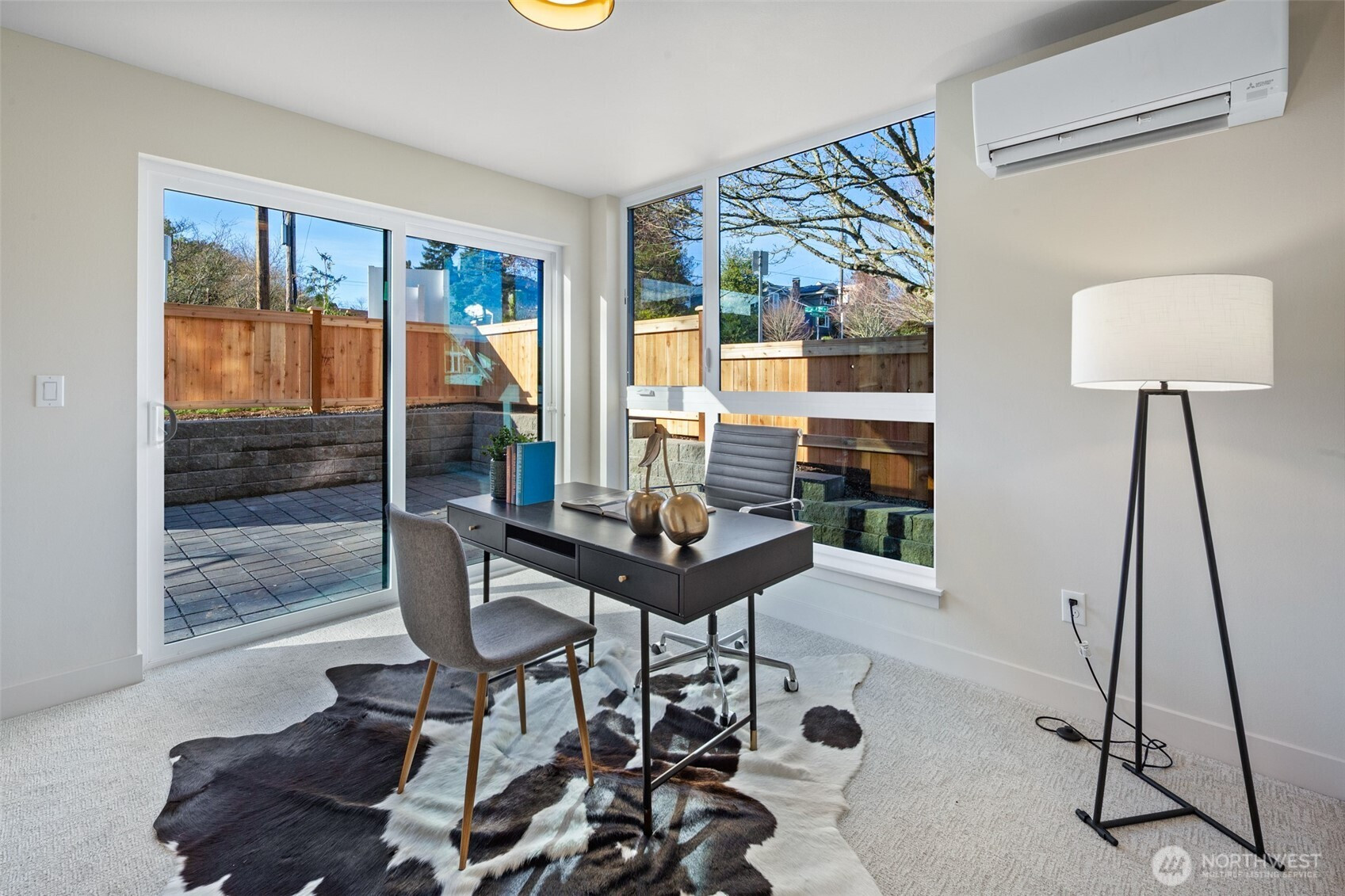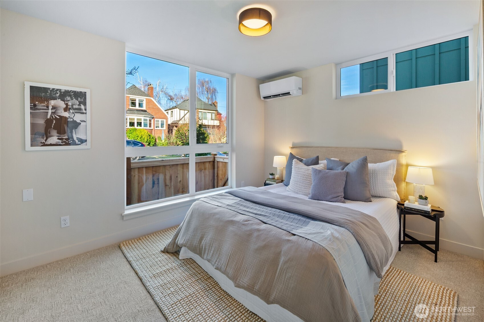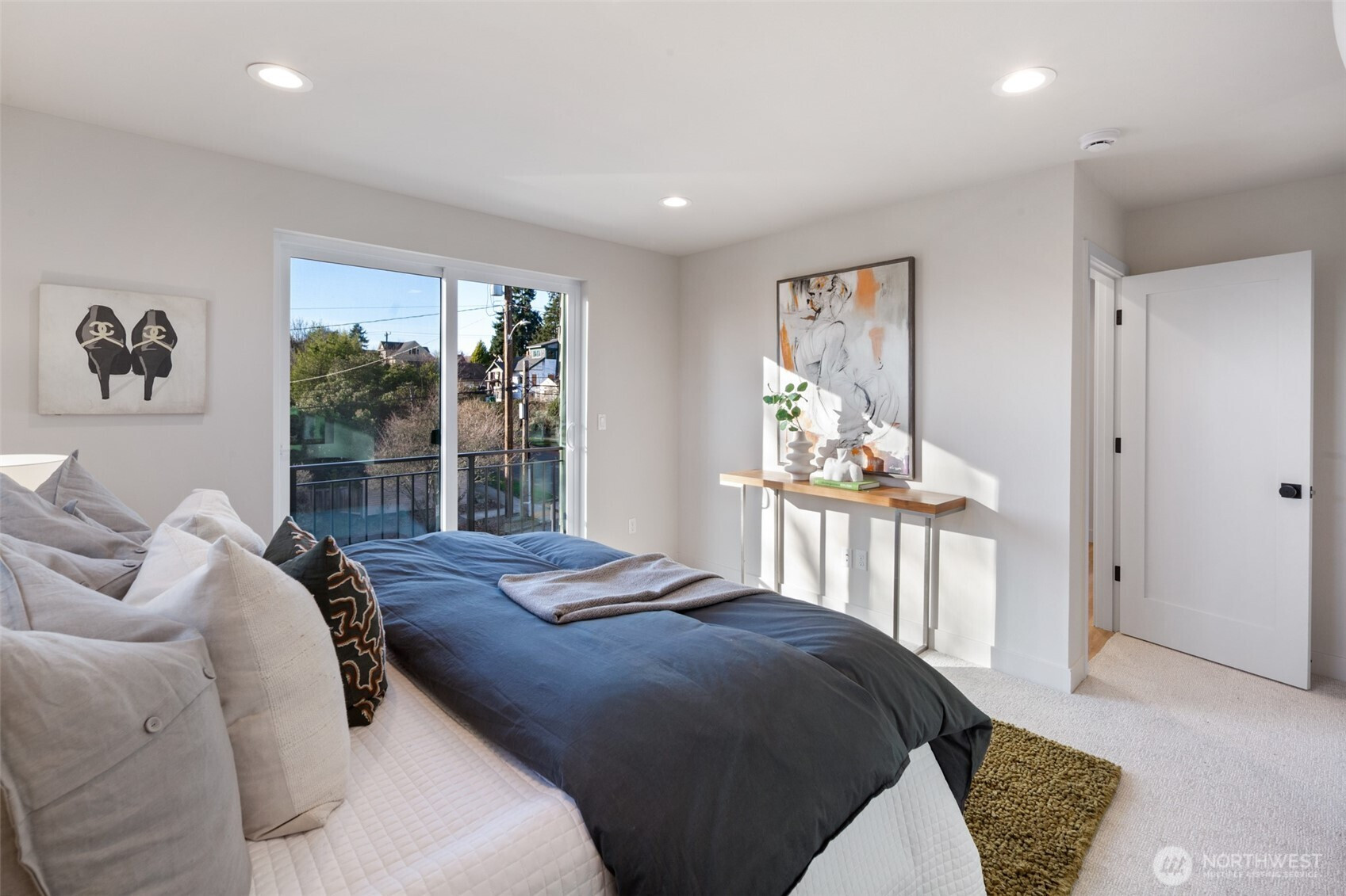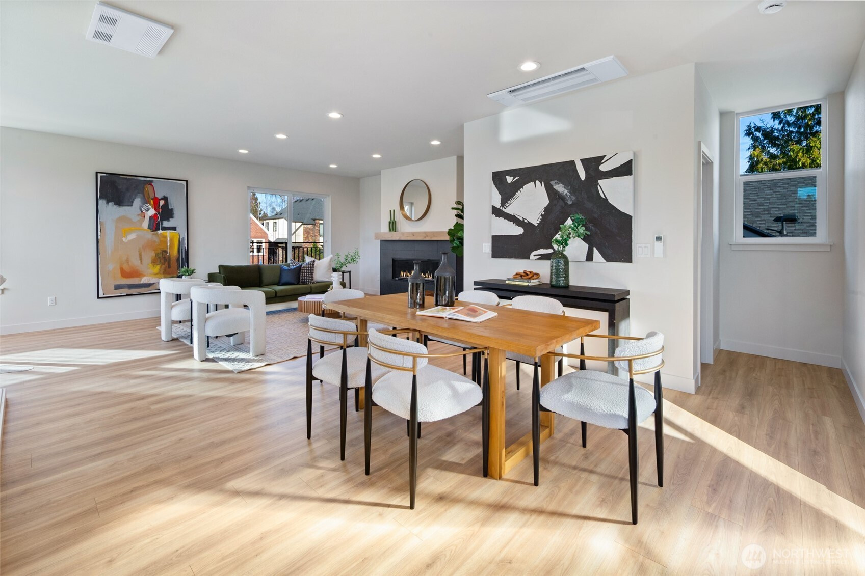 Positioned on a prominent corner lot in the heart of Wallingford, this exceptional standalone home captures panoramic views of the Seattle skyline, Lake Union, the Cascade Mountains, and Mount Rainier, with a rooftop deck to take it all in. Balancing architectural presence with daily livability, the entry level offers a double-height foyer, private office with patio access, guest bedroom, full bath, and a laundry/mud room leading to an oversized EV-ready garage. The second floor living level centers around a spacious chef’s kitchen with a large island, custom Abodian cabinetry with deep drawers, and quartz counters with a full-height quartz backsplash, opening to living and dining spaces with a fireplace. A Butler’s pantry keeps entertaining effortless, giving you space to prep and store so the main kitchen stays clean and guest ready. The upper level features three bedrooms on one floor, including the primary suite with a Juliet balcony and an appointed bath framing skyline and Mount Rainier views. Two secondary bedrooms feature vaulted ceilings and share a double-vanity bath. A staircase rises to an opening skylight and rooftop deck access with sweeping skyline and mountain views. Thoughtfully designed on its own lot, this brand new residence is not subject to an HOA or condominium. Located just moments from Gas Works Park, the Burke-Gilman Trail, Stone Way retail, UW, and Lake Union, plus positioned within John Stanford International School’s geo zone, this is a must see!