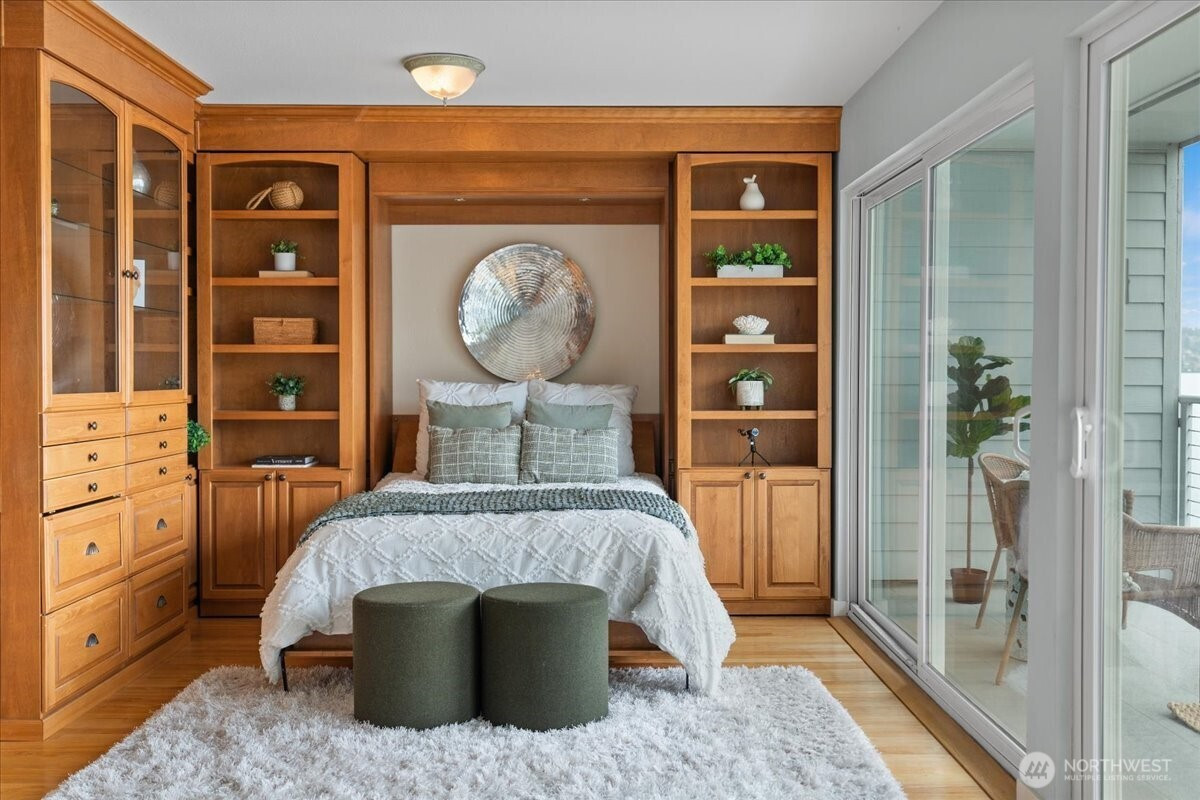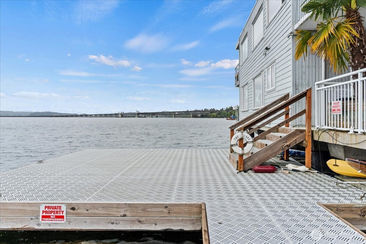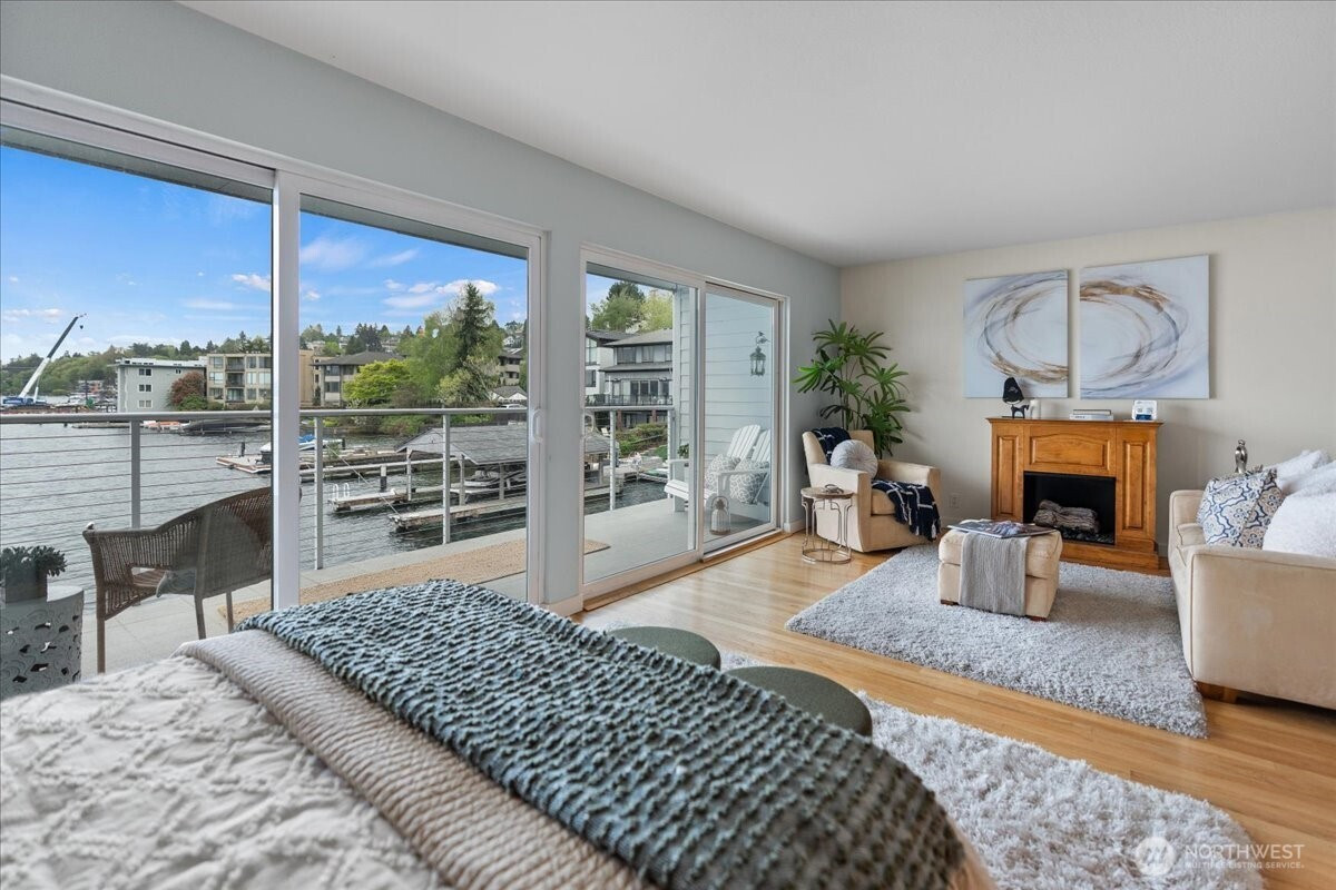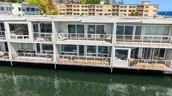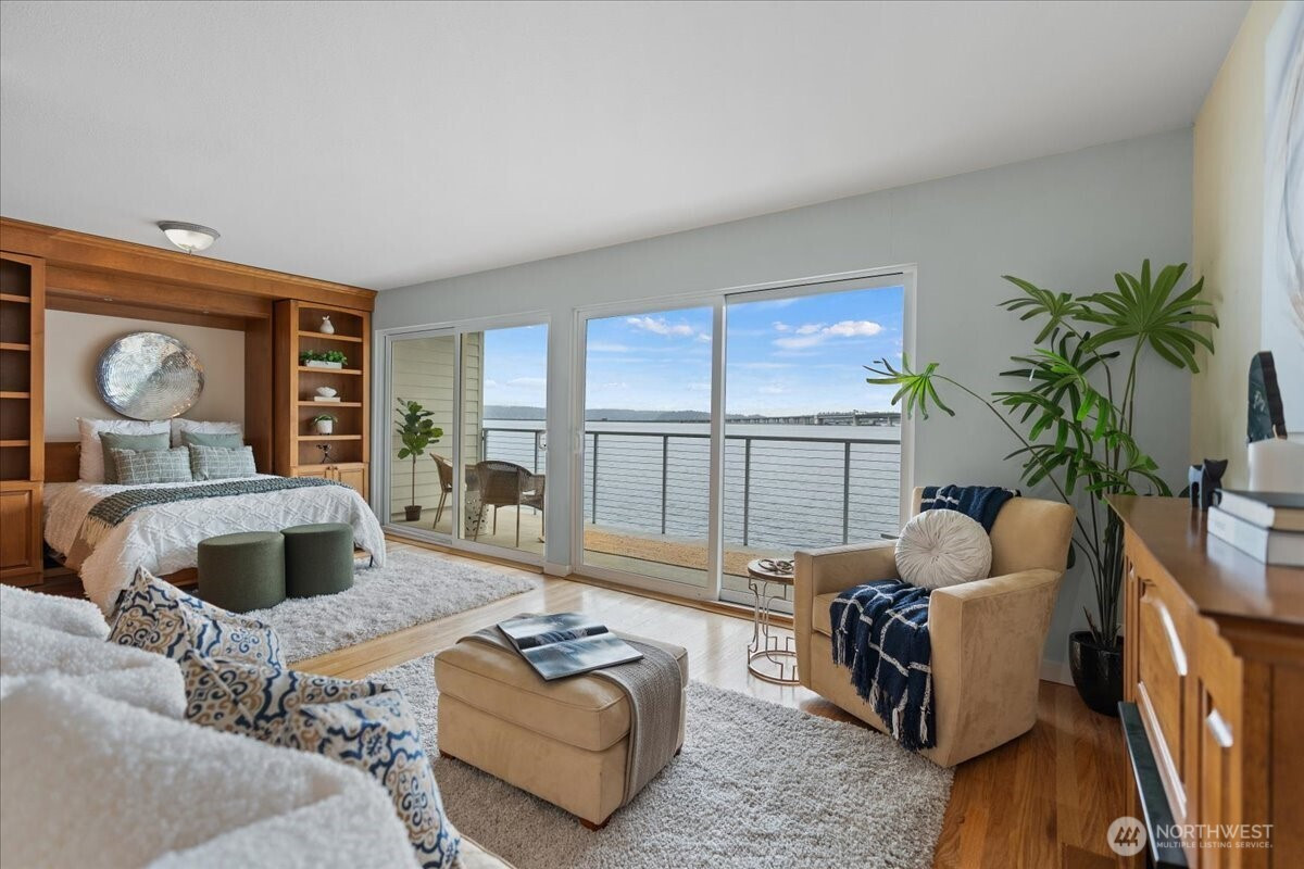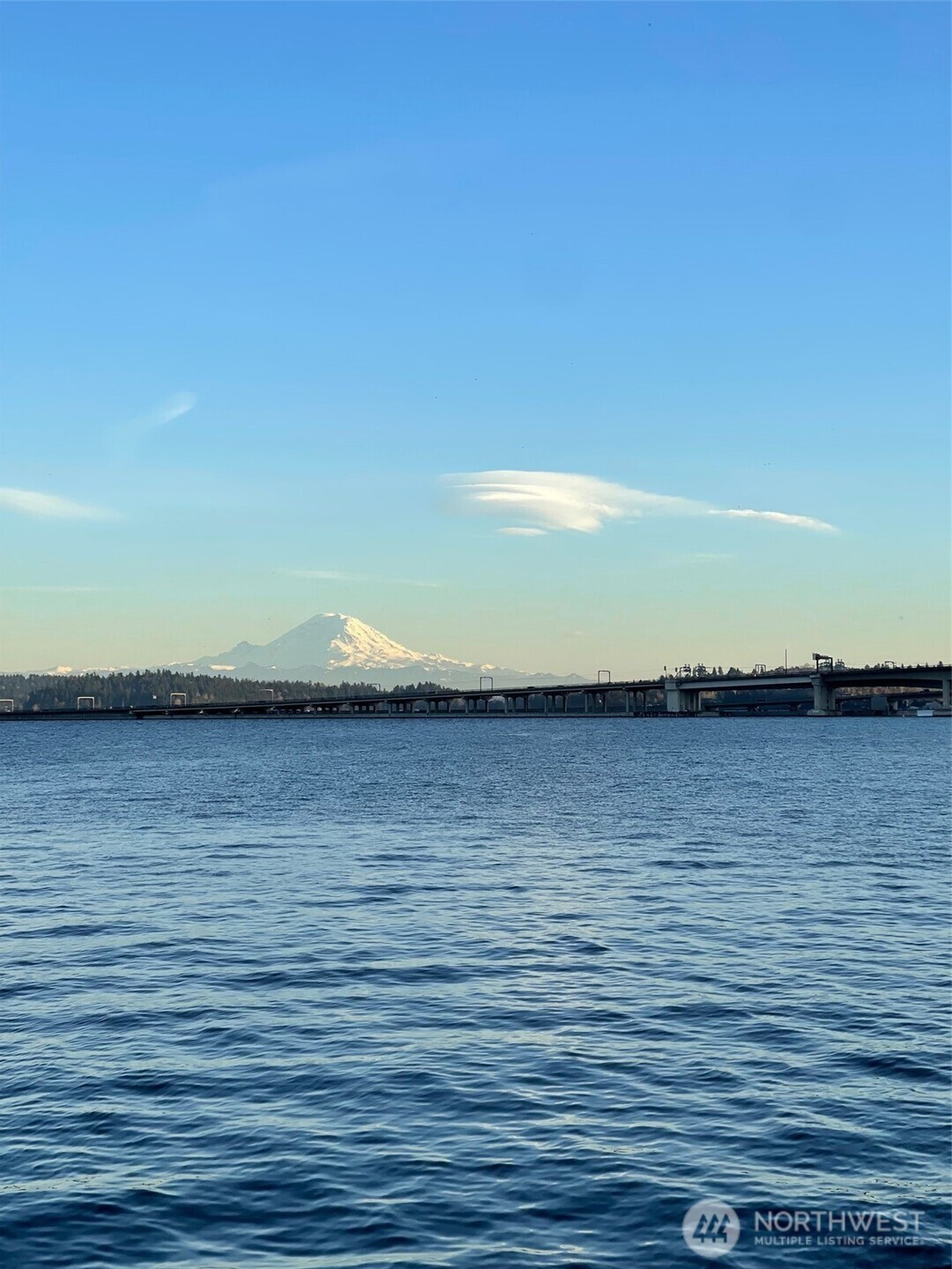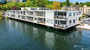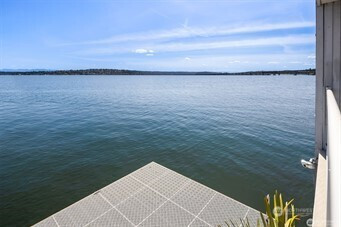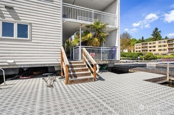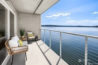 Lakefront living at its finest! Stunning unobstructed views of Lake WA & Mt Rainier from top floor. Seafair + Blue Angels fly overhead. Light-filled rooms, hardwoods throughout, & exquisite custom built-ins & cabinetry. Second open bedroom w/ Murphy bed for convenience, easily convertible w/ built-in flat screen, perfect for entertainment & extended living space. Beautiful kitchen w/ breakfast counter & SS appliances. Love the sliding glass doors onto large deck, great for relaxation, watching boats pass by &soaking in city &sound views. Cool off on hot days w/ SUP , kayaking or swimming off private dock. In-unit laundry. Controlled access entry. 1 dedicated parking space. Prime location, steps from Leschi Market, BluWater, & Daniel's Broiler. No Rental Cap. Welcome Home!