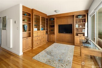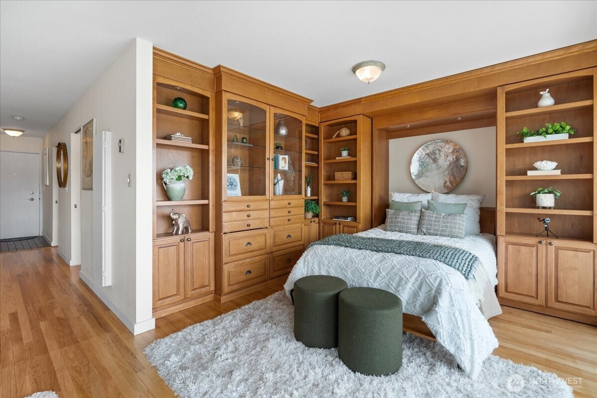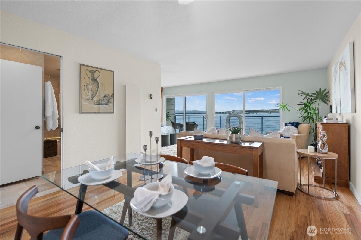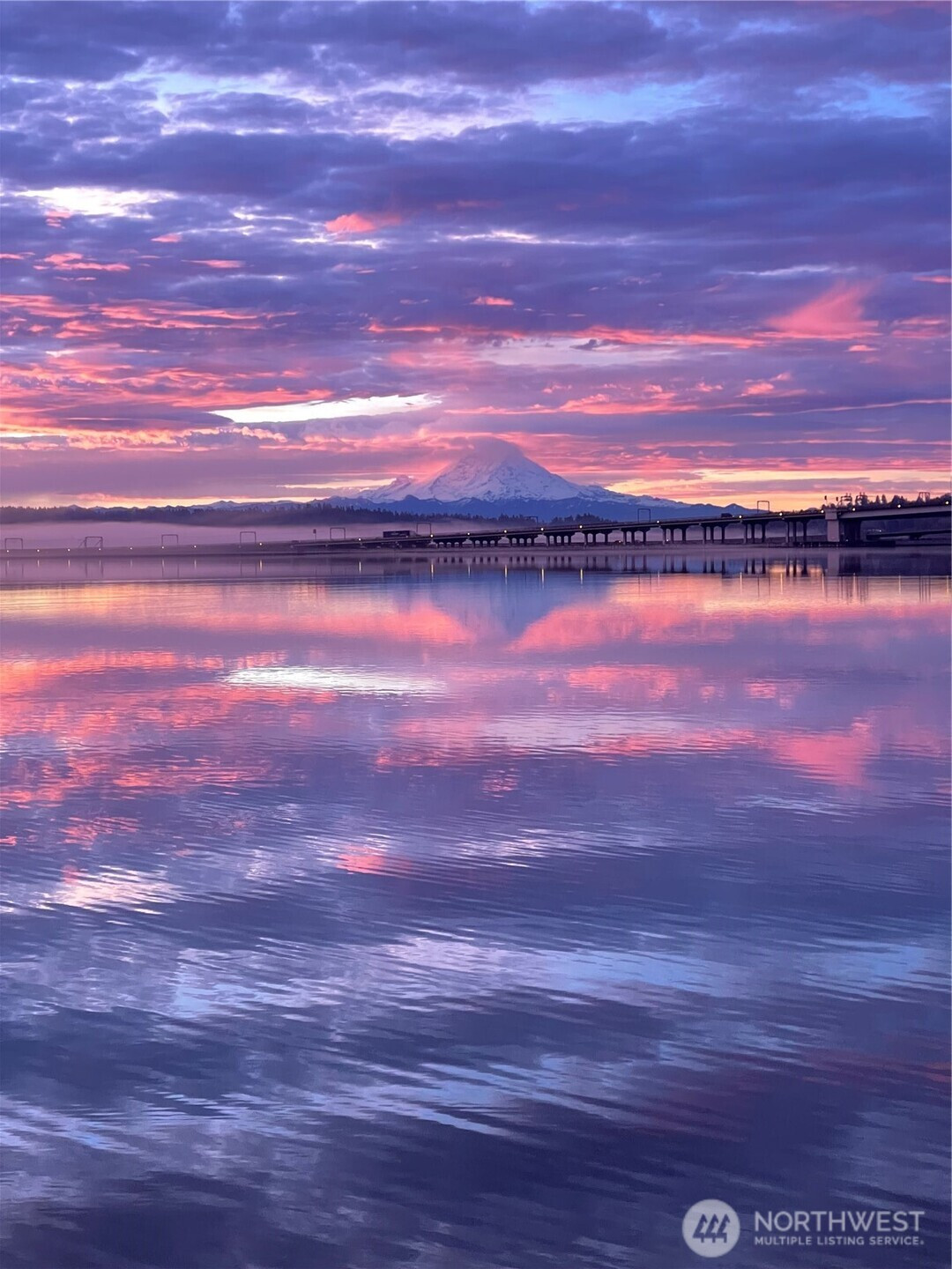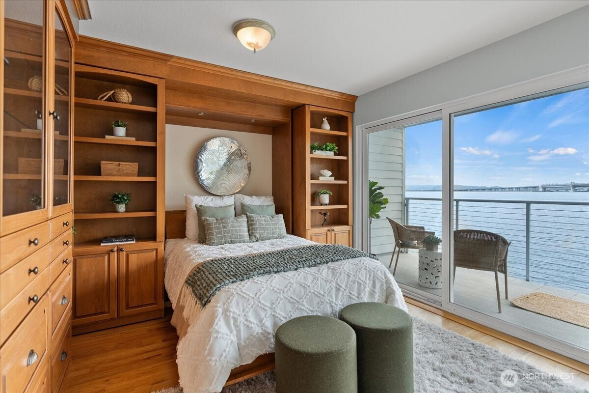 Lakefront living at its finest! Stunning unobstructed views of Lake WA & Mt Rainier from top floor. Seafair + Blue Angels fly overhead. Light-filled rooms, hardwoods throughout, & exquisite custom built-ins & cabinetry. Second open bedroom w/ Murphy bed for convenience, easily convertible w/ built-in flat screen, perfect for entertainment & extended living space. Beautiful kitchen w/ breakfast counter & SS appliances. Love the sliding glass doors onto large deck, great for relaxation, watching boats pass by &soaking in city &sound views. Cool off on hot days w/ SUP , kayaking or swimming off private dock. In-unit laundry. Controlled access entry. 1 dedicated parking space. Prime location, steps from Leschi Market, BluWater, & Daniel's Broiler. No Rental Cap. Welcome Home!