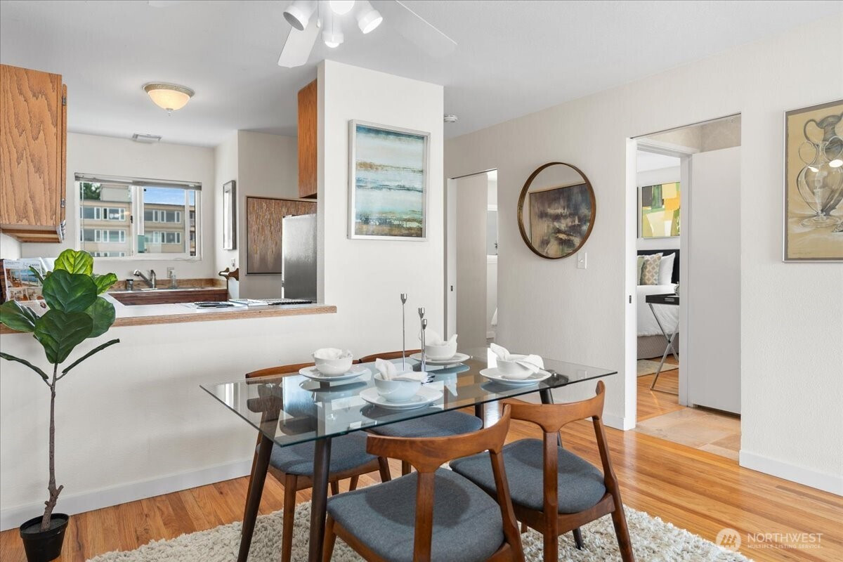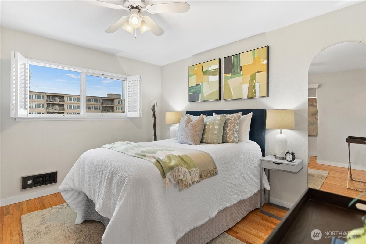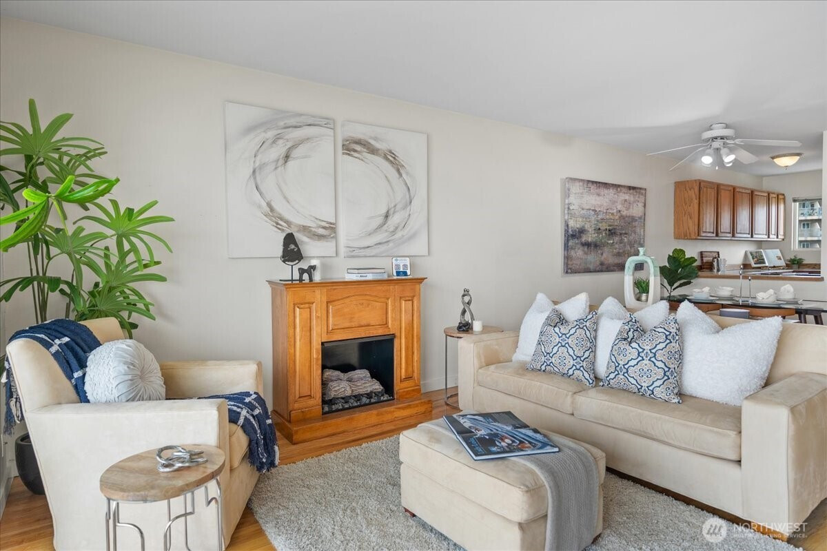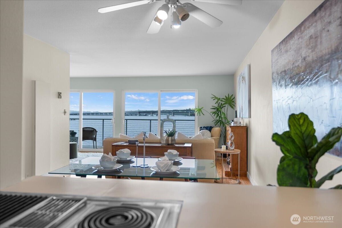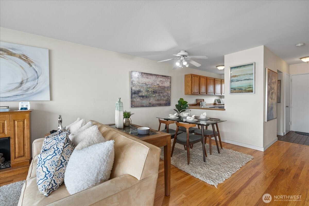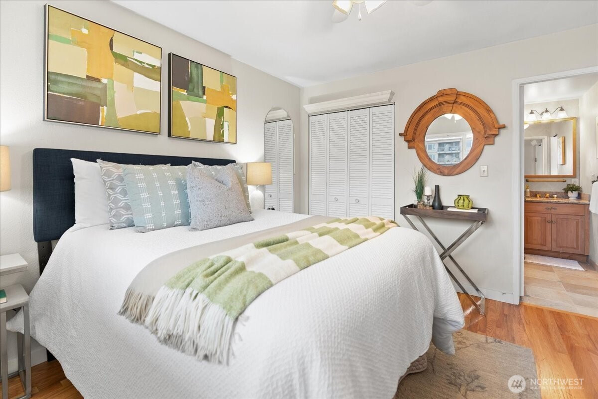 Lakefront living at its finest! Stunning unobstructed views of Lake WA & Mt Rainier from top floor. Seafair + Blue Angels fly overhead. Light-filled rooms, hardwoods throughout, & exquisite custom built-ins & cabinetry. Second open bedroom w/ Murphy bed for convenience, easily convertible w/ built-in flat screen, perfect for entertainment & extended living space. Beautiful kitchen w/ breakfast counter & SS appliances. Love the sliding glass doors onto large deck, great for relaxation, watching boats pass by &soaking in city &sound views. Cool off on hot days w/ SUP , kayaking or swimming off private dock. In-unit laundry. Controlled access entry. 1 dedicated parking space. Prime location, steps from Leschi Market, BluWater, & Daniel's Broiler. No Rental Cap. Welcome Home!