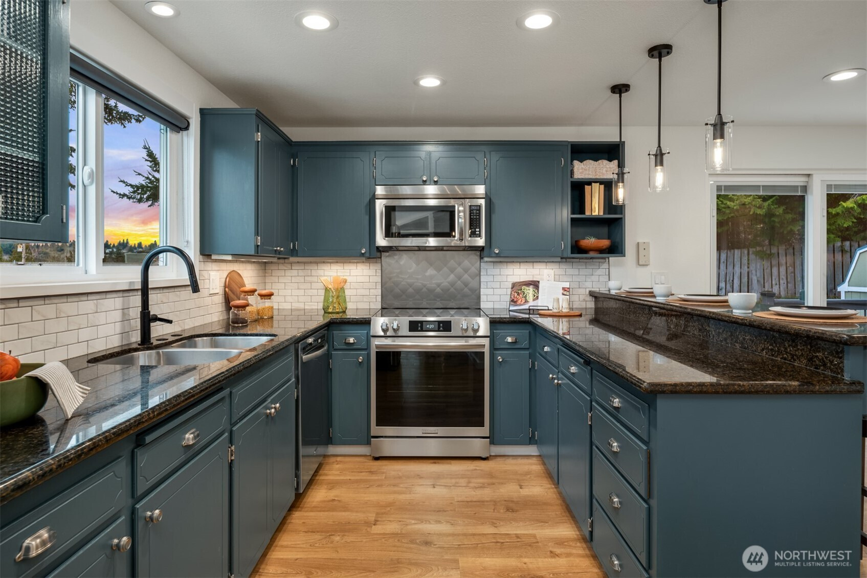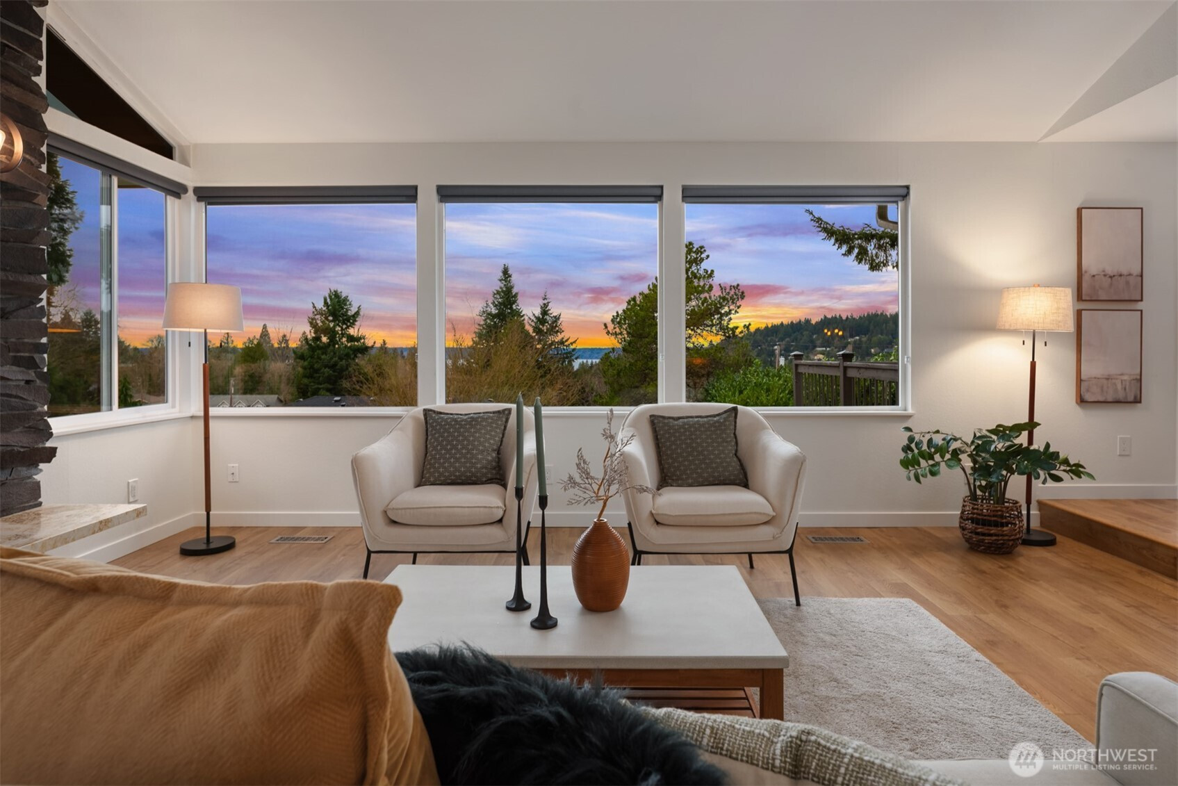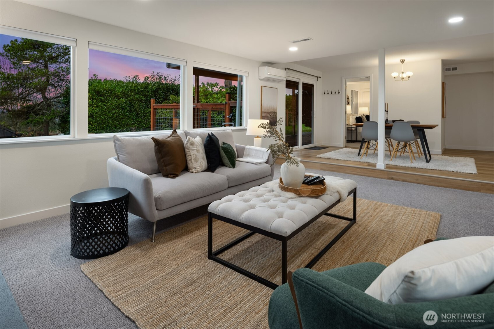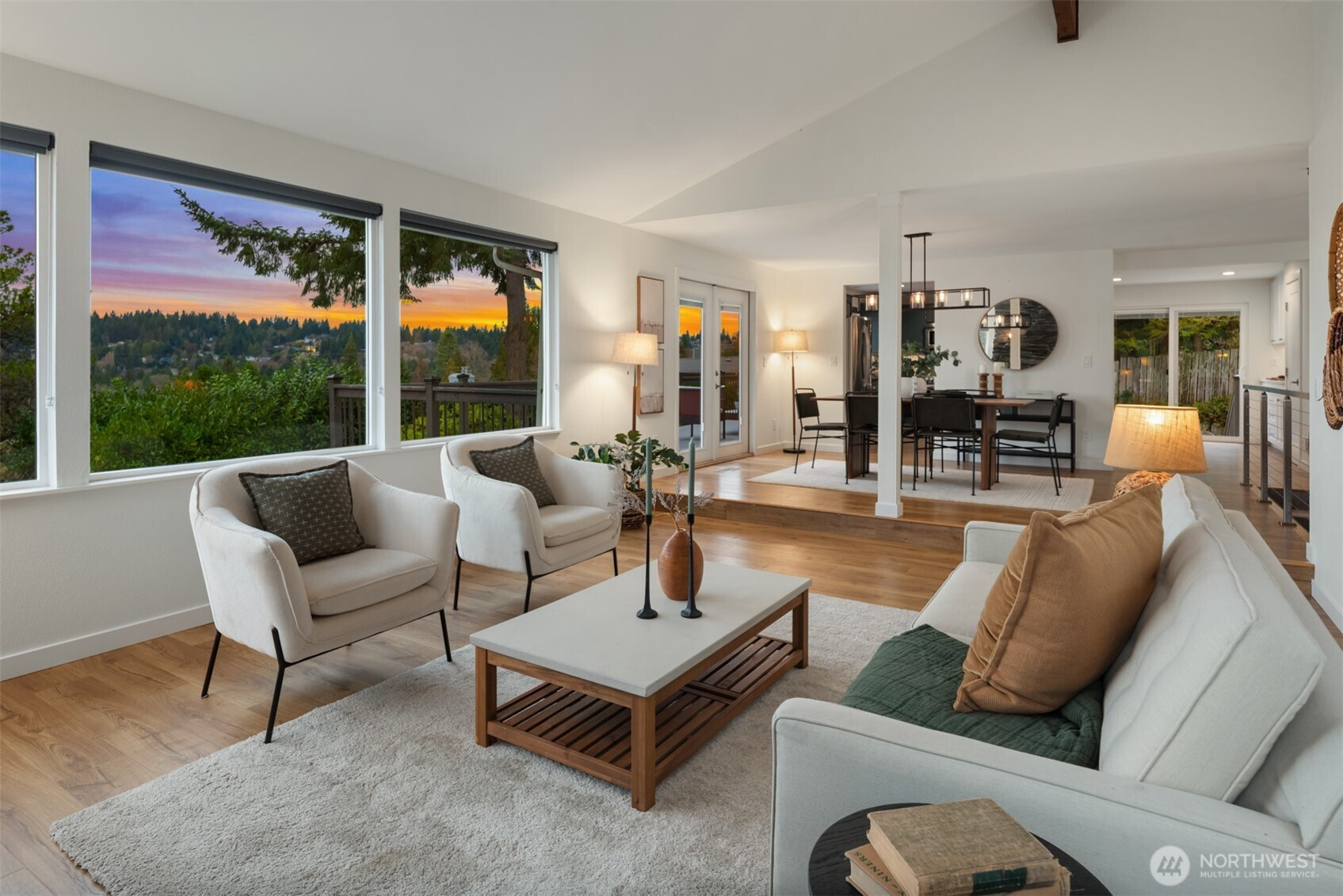 Set on a sunny 15,000 SF lot in Normandy Park, this inviting home offers westerly views of the Olympic Mountains & Puget Sound. The open living room features generous vaulted ceilings, a gas fireplace, & south- & west-facing windows that brighten even the dreariest PNW days. The updated kitchen offers ample storage, granite counters, & stainless appliances. The open dining area enjoys sunset views & French doors to the deck. The main-floor primary bedroom includes a walk-in closet plus a second full closet, along with an expanded en suite bath featuring double sinks & a curbless shower. Two additional bedrooms & a full bath round out the spacious main floor. The lower level offers exceptional flexibility with a remodeled second kitchen, bedroom, full bath, dining area, & family room—all with its own exterior access, an ideal setup for long-term guests or multigenerational (MIL) living. Laundry is conveniently located on the main floor with a second laundry downstairs. Outside, enjoy a roomy deck built for sunsets & summer dinners, plus a large fenced yard made for play, gardening, or dogs on the run. Updates include Hardi siding, newer windows, new water line, updated flooring & baths, interior paint, a heat pump with A/C, & EV charging, plus ample parking with a two-car garage & large gravel pad with lower-level access. A special home in a special pocket of Normandy Park, with Nist Park just kiddie-corner. Pre-inspected.