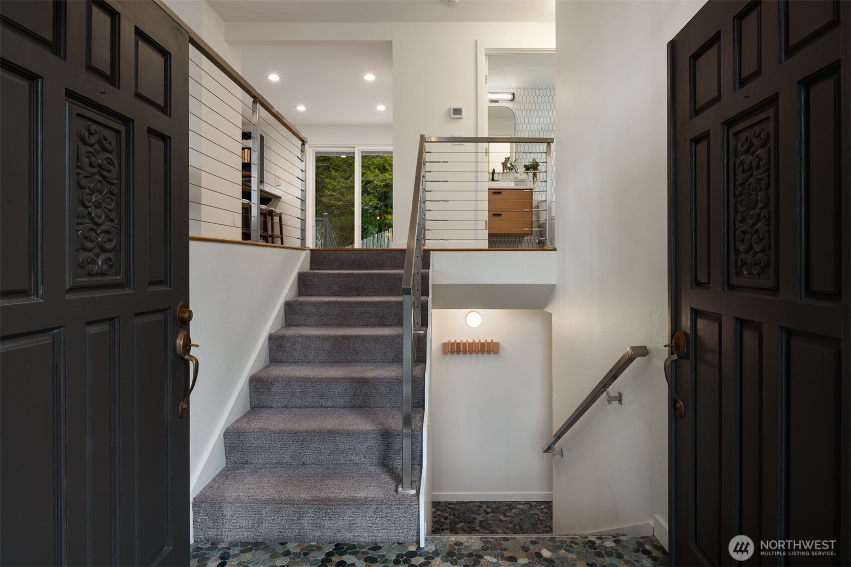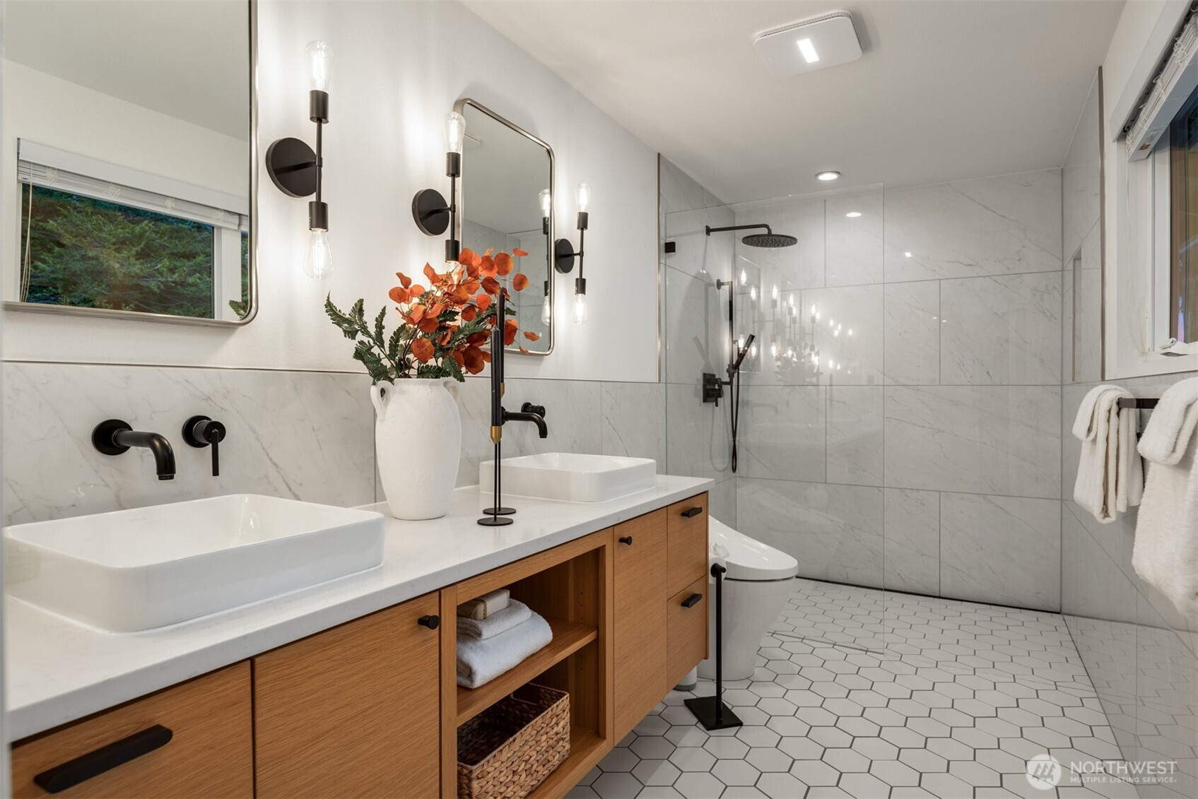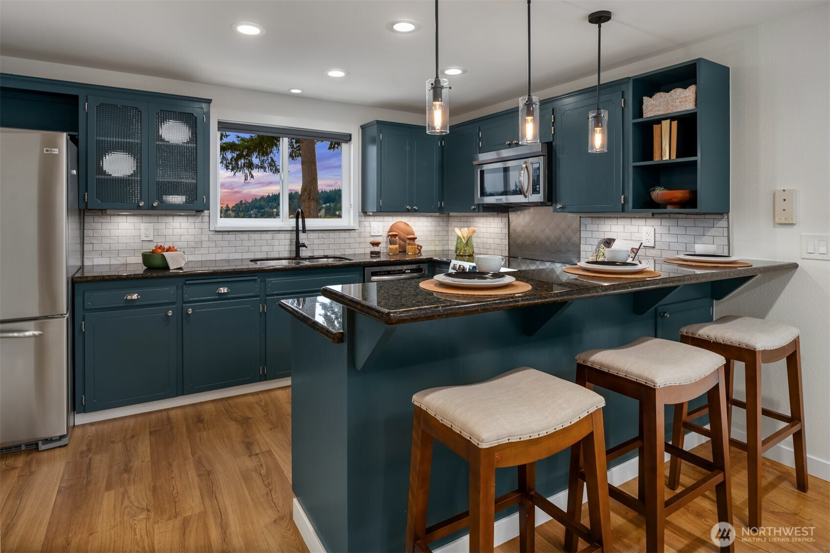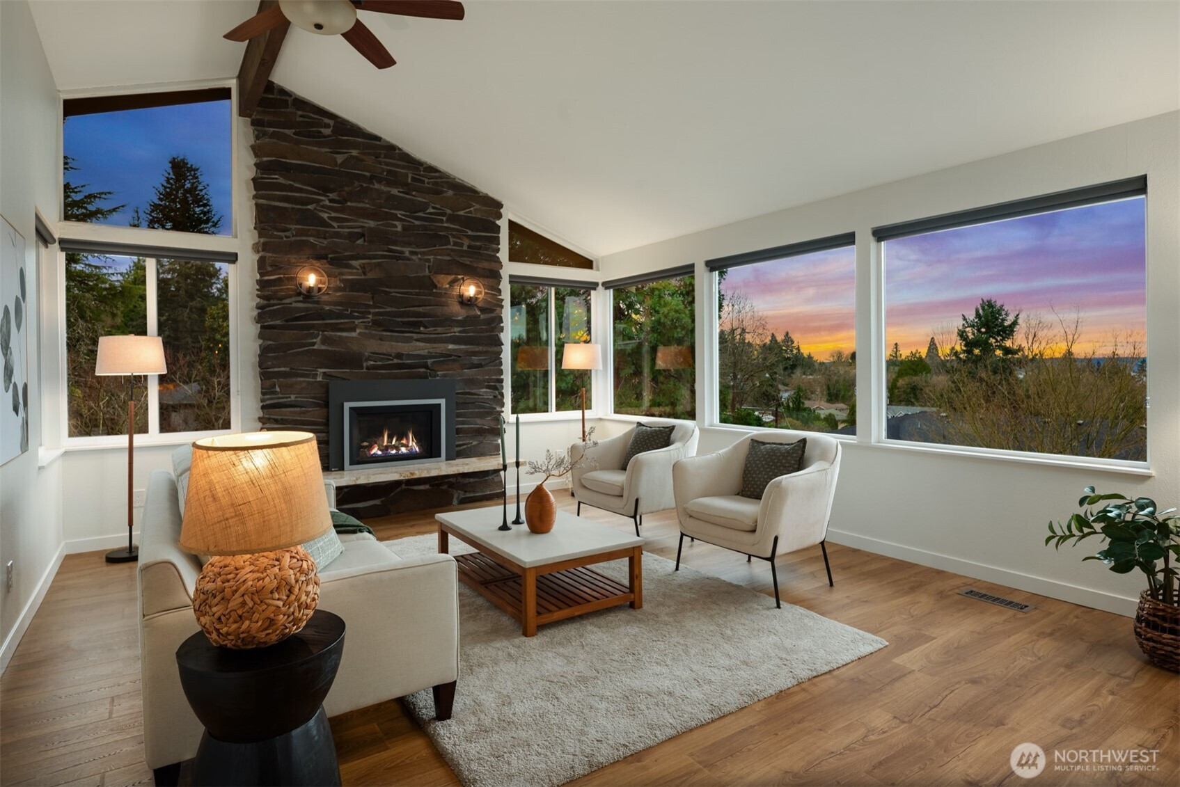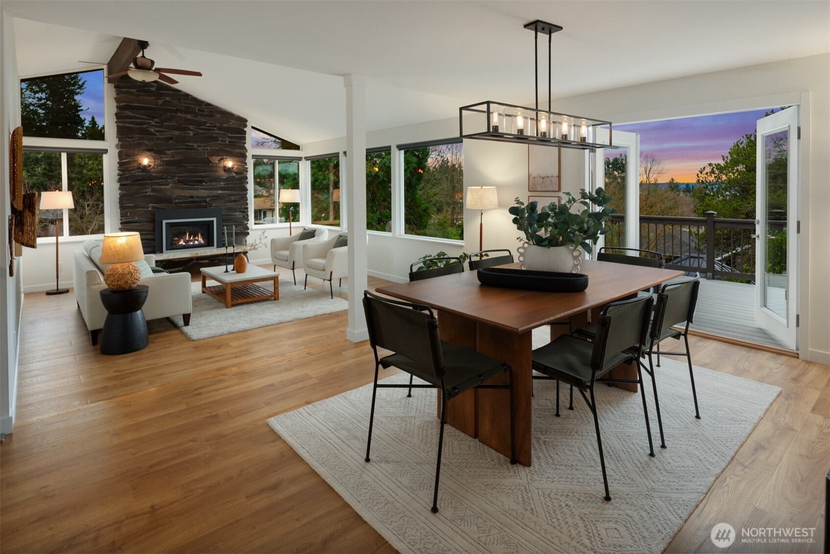 Set on a sunny 15,000 SF lot in Normandy Park, this inviting home offers westerly views of the Olympic Mountains & Puget Sound. The open living room features generous vaulted ceilings, a gas fireplace, & south- & west-facing windows that brighten even the dreariest PNW days. The updated kitchen offers ample storage, granite counters, & stainless appliances. The open dining area enjoys sunset views & French doors to the deck. The main-floor primary bedroom includes a walk-in closet plus a second full closet, along with an expanded en suite bath featuring double sinks & a curbless shower. Two additional bedrooms & a full bath round out the spacious main floor. The lower level offers exceptional flexibility with a remodeled second kitchen, bedroom, full bath, dining area, & family room—all with its own exterior access, an ideal setup for long-term guests or multigenerational (MIL) living. Laundry is conveniently located on the main floor with a second laundry downstairs. Outside, enjoy a roomy deck built for sunsets & summer dinners, plus a large fenced yard made for play, gardening, or dogs on the run. Updates include Hardi siding, newer windows, new water line, updated flooring & baths, interior paint, a heat pump with A/C, & EV charging, plus ample parking with a two-car garage & large gravel pad with lower-level access. A special home in a special pocket of Normandy Park, with Nist Park just kiddie-corner. Pre-inspected.