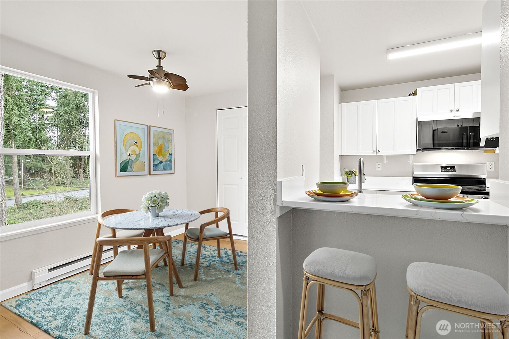 Top-floor single-level condominium offering privacy, comfort, and an exceptional value - ideal for first time buyers. This move-in ready home features a beautifully updated kitchen with quartz countertops, new stainless steel appliances, undermount sink with pull down faucet, pantry and convenient eating bar. Engineered hardwood floors enhance the kitchen and dining areas, while brand new carpet and fresh interior paint create a fresh, modern Northwest feel. The spacious primary bedroom includes a walk-in closet, and the in-unit washer and dryer provide everyday convenience. Enjoy peaceful territorial views of surrounding trees from your private deck. Community amenities include a pool, hot tub, clubhouse and sport court for recreation and relaxation. Conveniently located near the new Federal Way light rail station, with easy access to shopping, dining, and major commuting routes, making this home excellent opportunity for affordable home ownership in south King County.