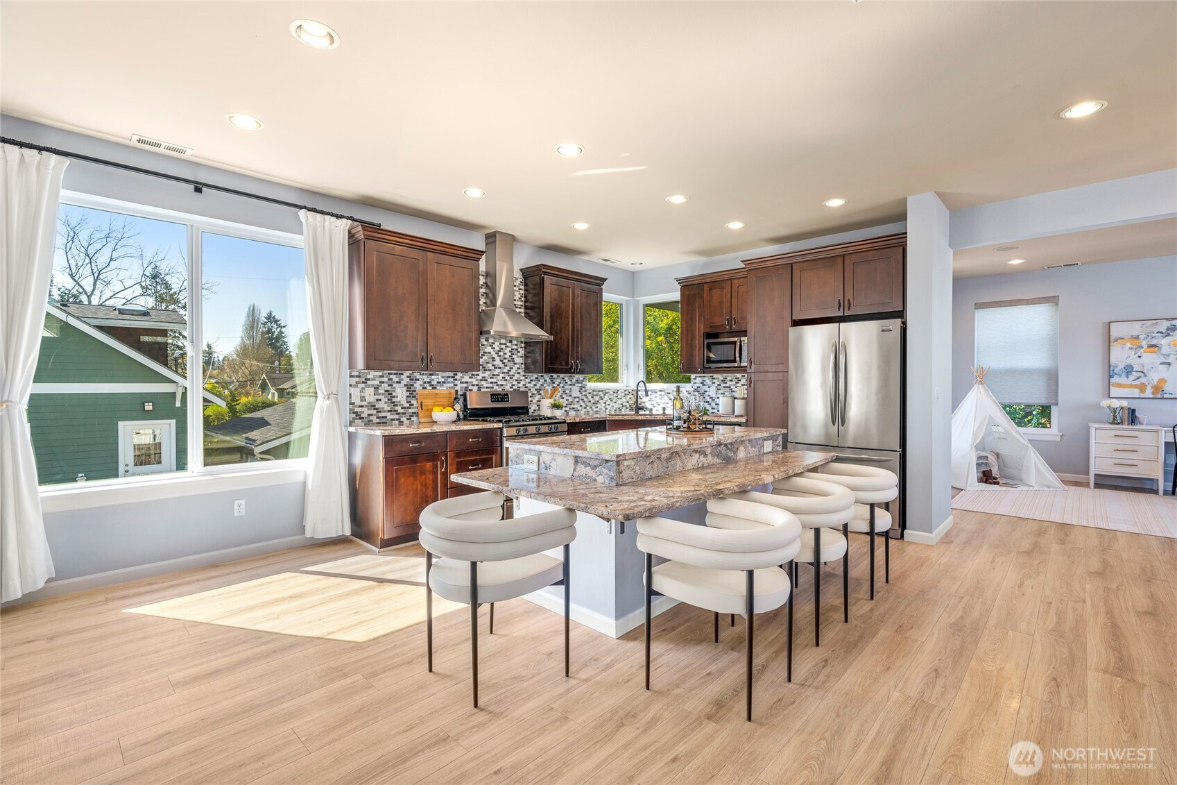 This sophisticated spacious 3,010sf, is a well-maintained newer 2013 construction situated in the highly sought-after Green Lake community. The versatile entry main level features a fifth bedroom, a three-quarter bath, and flexible spaces perfectly suited for a media center, and professional home office, or private gym. The second floor is defined by an expansive great room, high ceilings, a gas fireplace, and an abundance of natural light. Residents may enjoy panoramic mountain views from the interior or transition to the private deck—complete with a gas BBQ hookup—for seamless alfresco dining. The adjoining gourmet kitchen serves as the home's culinary heart, anchored by a substantial central island and complemented by nice cabinetry and extensive counter space. The upper level is thoughtfully configured for privacy, 4 bedrooms including a primary suite with a 5-piece spa-inspired bath and a generous walk-in closet. This floor also includes a laundry room and an additional full bath. Other features include heat pump with AC as well as a Furnace. The exterior offers a beautifully landscaped, fully fenced backyard and an attached two-car garage. Positioned for an unparalleled urban lifestyle, this home is just steps from Green Lake Park, PCC, and Whole Foods. With close proximity to the University of Washington and McDonald International Elementary, and easy access to the Light Rail and major highways, commuting to Downtown or South Lake Union is effortless.