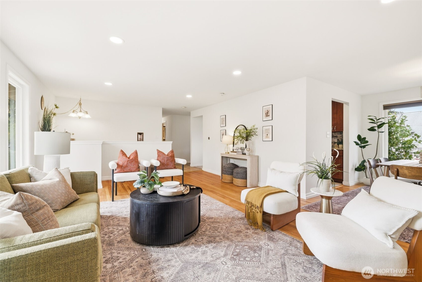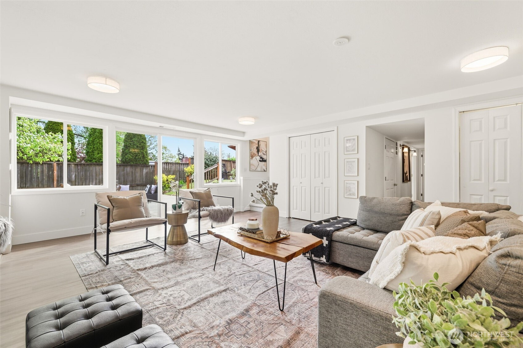 Light and bright daylight rambler in a sought-after Bellevue location with 4 bedrooms, 2.75 baths, and a layout that lives comfortably on both levels. Fresh interior paint and new carpet give the home a crisp, move-in ready feel. The main floor features hardwood floors in great condition, spacious living areas, a beautiful kitchen, and nicely finished baths. Downstairs, a generous family room opens directly to the patio, while a large bedroom with en suite access offers great flexibility for guests, work-from-home, or additional living space. Outside, the fully fenced yard and expansive patio create a private setting for relaxing or entertaining. Beautifully maintained, pre-inspected, and conveniently located near parks, shopping, dining, and easy access to major commuter routes