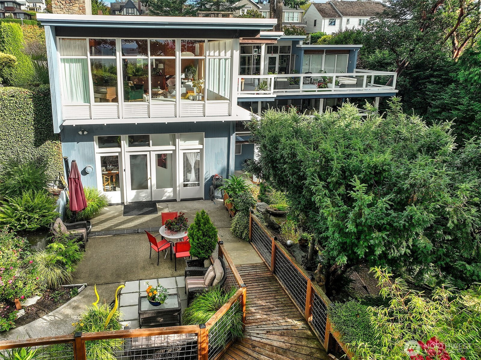 Perched high atop Magnolia in the highly regarded Carleton Park neighborhood, this architect-designed mid-century residence by Seattle firm Tucker & Shields invites rediscovery. Built in 1963 and thoughtfully set into Magnolia Bluff, the building spans more than 7,600 square feet on a wooded 13,350-square-foot corner parcel, where mature trees, layered decks and private garden spaces create a rare sense of seclusion. Behind its understated façade, a light-filled gallery introduces generous interior volumes shaped by floor-to-ceiling windows, exposed beams and natural materials emblematic of Pacific Northwest Modernism. A grand gathering space anchors the home, its wall of glass drawing in filtered light and quiet views through the surrounding landscape. The residence unfolds across three distinct levels with ten existing bedrooms, offering natural separation and versatility well suited to multi-generational households living under one roof, shared living arrangements, guest accommodations or live-in support. Long recognized as one of Carleton Park’s most sought-after Adult Family Homes, the property is licensed for six residents with the ability to support additional bedrooms. The business benefits from a strong reputation, consistent demand and a long-standing waiting list. An existing lower-level apartment with private access provides additional income and operational flexibility. Whether continued as a thriving care operation or held as a combined business and real estate.