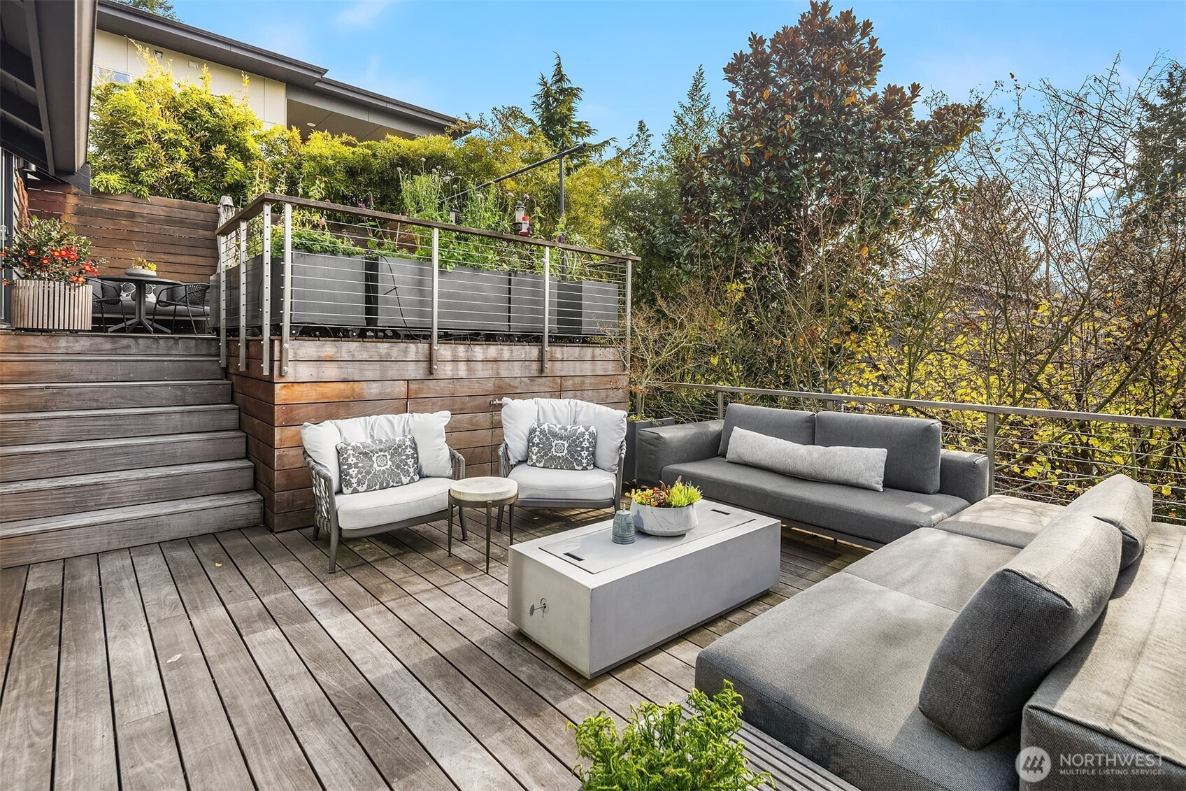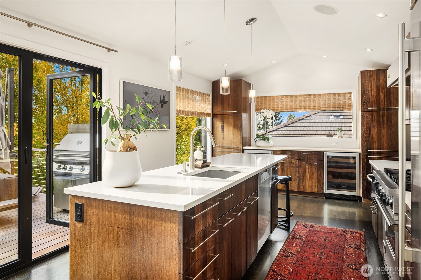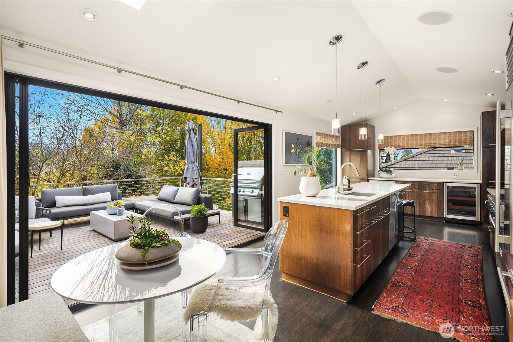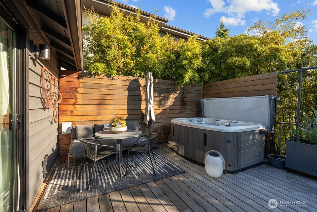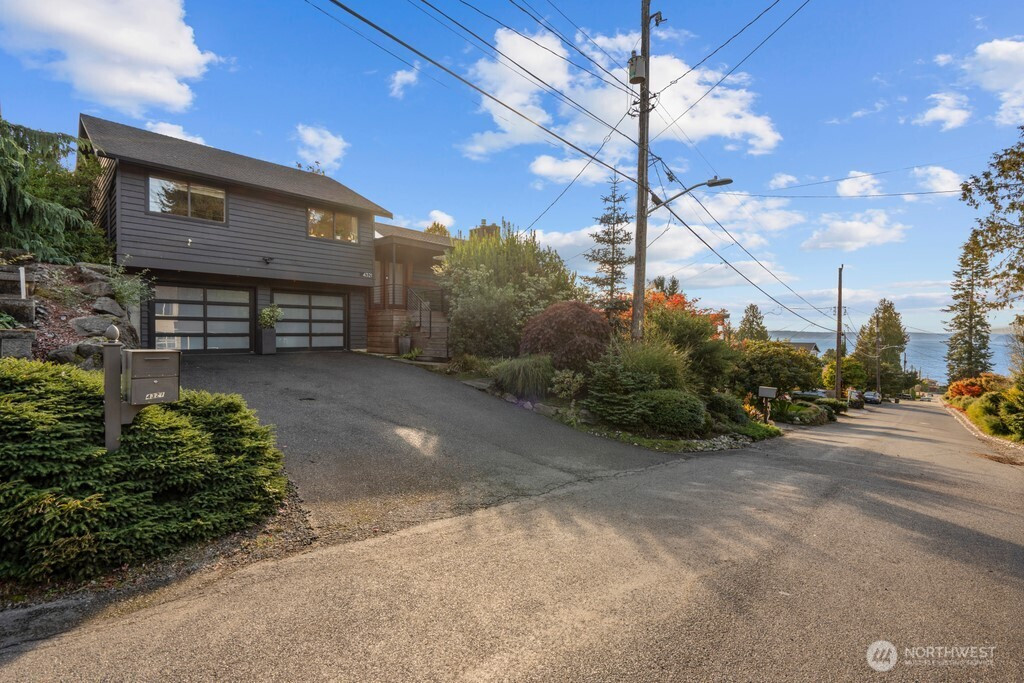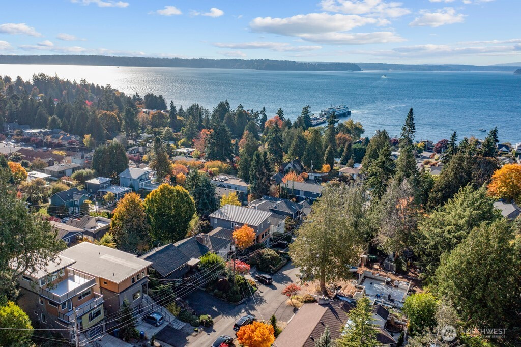 Seamless Indoor/Outdoor Living: Stunning NW Contemporary located above Ferry & Lincoln Park w/beautiful Sound & Mtn views. Light floods open-concept living space w/vaulted ceilings & dark hardwoods. Spacious living rm w/gas frplc flows to Chef's kit w/top-of-the-line appls, beautiful cabs & inviting eating area-perfect for culinary enthusiasts who appreciate views while cooking. Nanawalls lead you to private Ipe deck for alfresco dining & relaxation. Luxurious primary suite w/3/4 bath & 2nd deck w/hot tub-for unwinding. 2 more bdrms & a full bath w/jetted tub. Versatile lower level boasts rec room w/2nd gas frplc, bar area w/wine fridge, addl bath & utility rm. Landscaped yard w/patio & greenhouse. A/C, 2-car gar w/workshop on quiet street