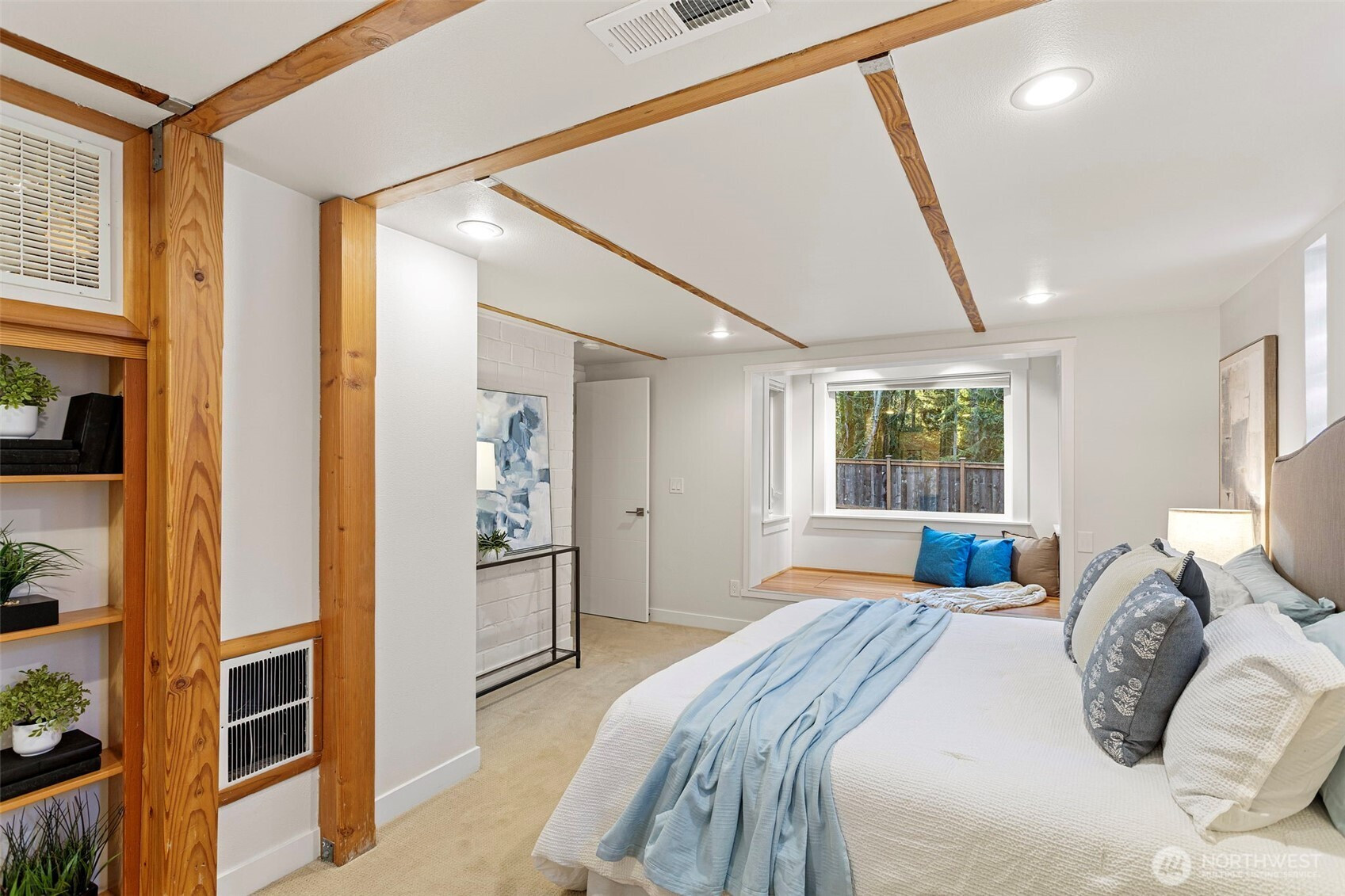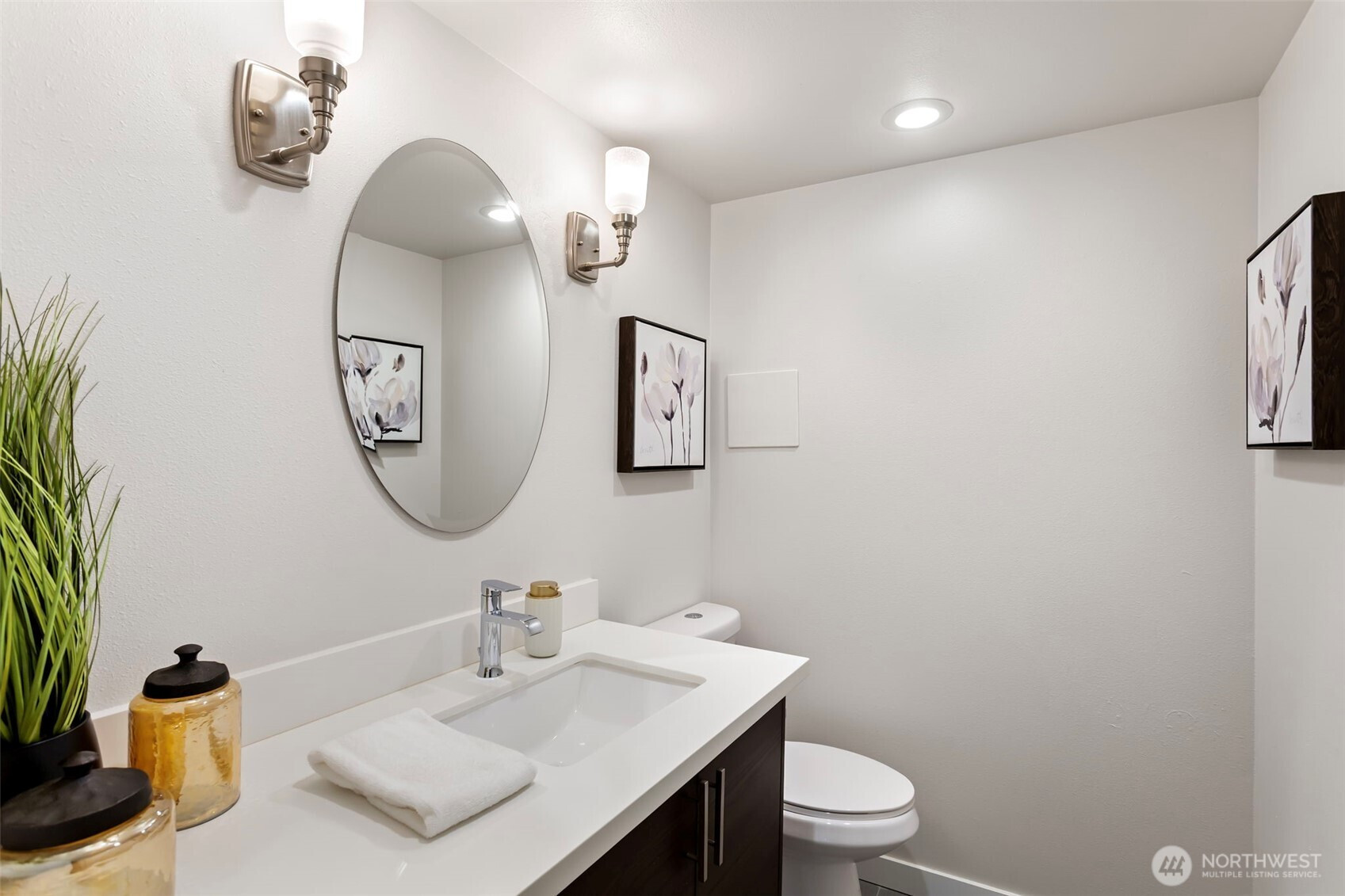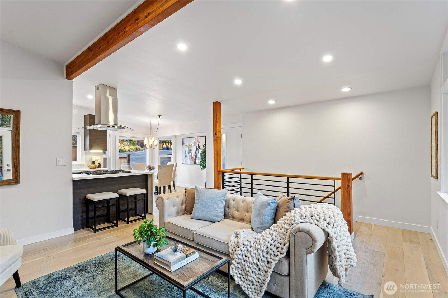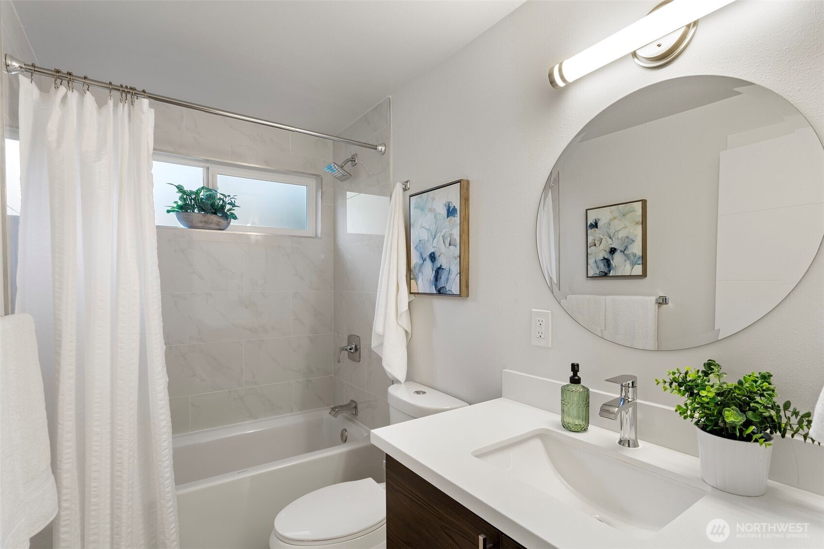 This nicely updated 3-bedroom, 2.25-bath home is ideally located in the highly sought-after Bellevue School District. The home features beautifully remodeled bathrooms and a modern kitchen with quartz countertops, stainless steel appliances, and a gas cooktop, offering thoughtful design and high-end finishes throughout. Additional highlights include a heat pump, living room with a gas fireplace, and a spacious primary suite with a walk-in closet and large en-suite bathroom featuring heated floors. A wet bar downstairs provides a perfect space for entertaining or relaxing. Outdoor and functional features include a brand-new front yard fence, spacious deck overlooking the private backyard and greenbelt, electric car charging, attached carport, RV parking, and a detached 16’ x 24’ garage/shop—perfect for storage, hobbies, or workspace. Conveniently located just minutes to I-90 and I-405, with easy access to shopping, dining, and everyday amenities.