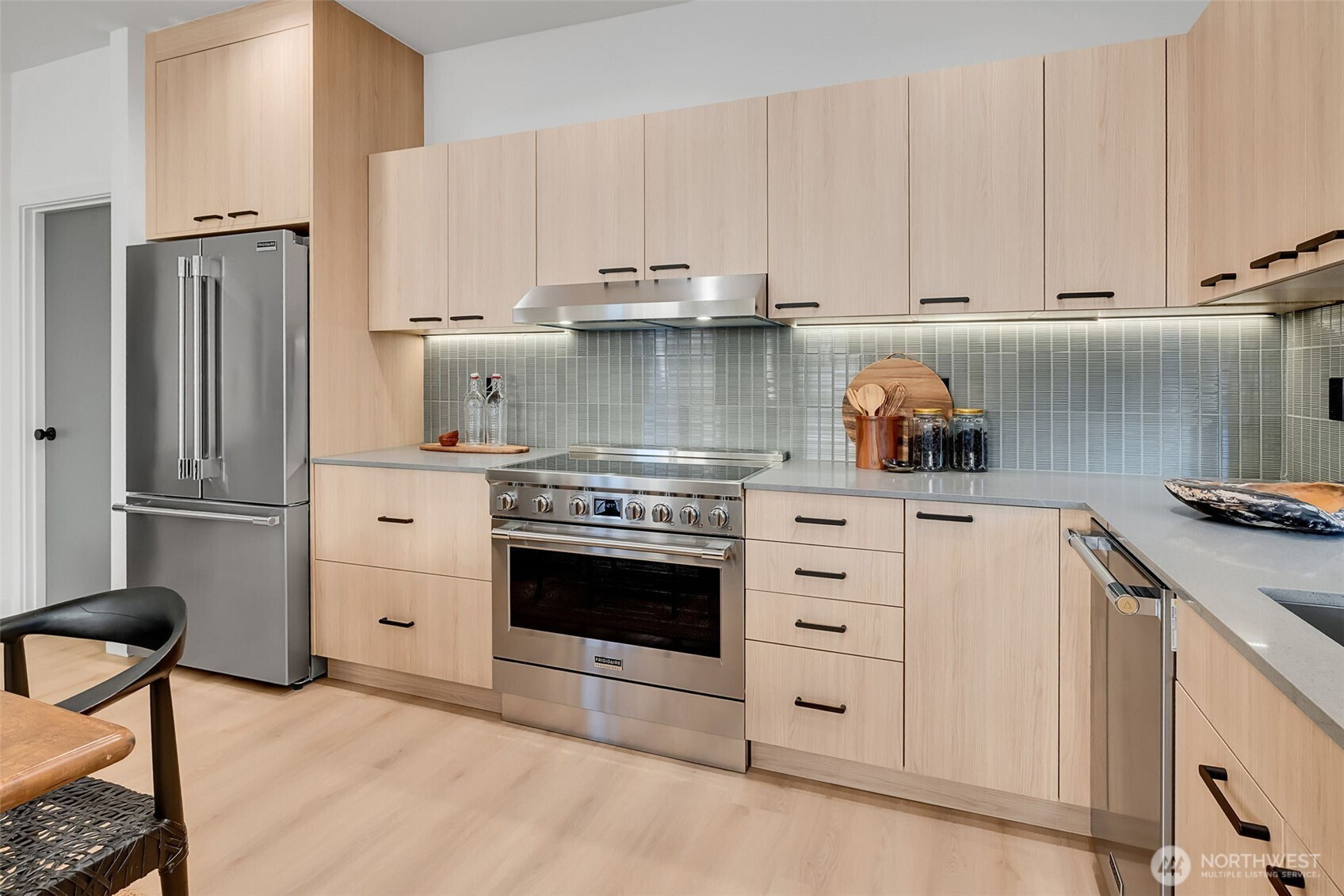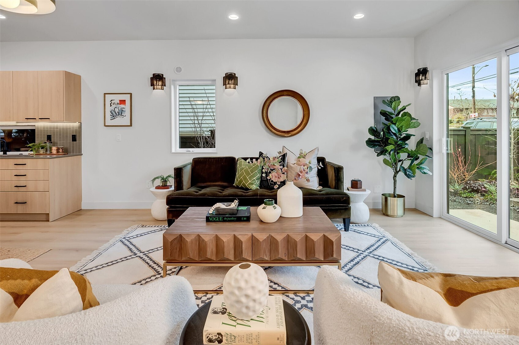 An architectural study in modern living, this residence balances form & function with precision. Clean lines, curated materials & custom lighting define a palette of intentional design. Expansive windows orchestrate light, shaping interiors that invite connection while framing nature as part of the composition. The main floor flows seamlessly- living, dining & streamlined kitchen unified in clarity. Upstairs, two restful bedrooms & an elevated full bath establish rhythm, while the primary ensuite offers a retreat with a walk-in shower & dual vanity. Adaptable office, studio, or nursery space rounds off the top level. Expert landscaping frames the site, with dedicated parking & proximity to transit, adds practical balance. A/C & efficient.