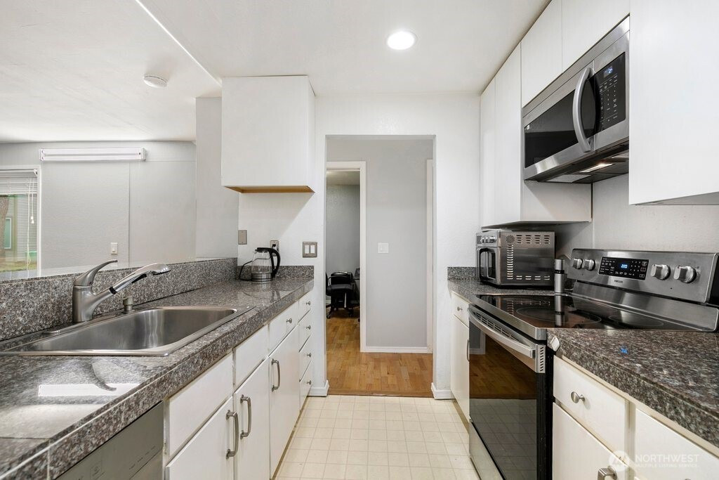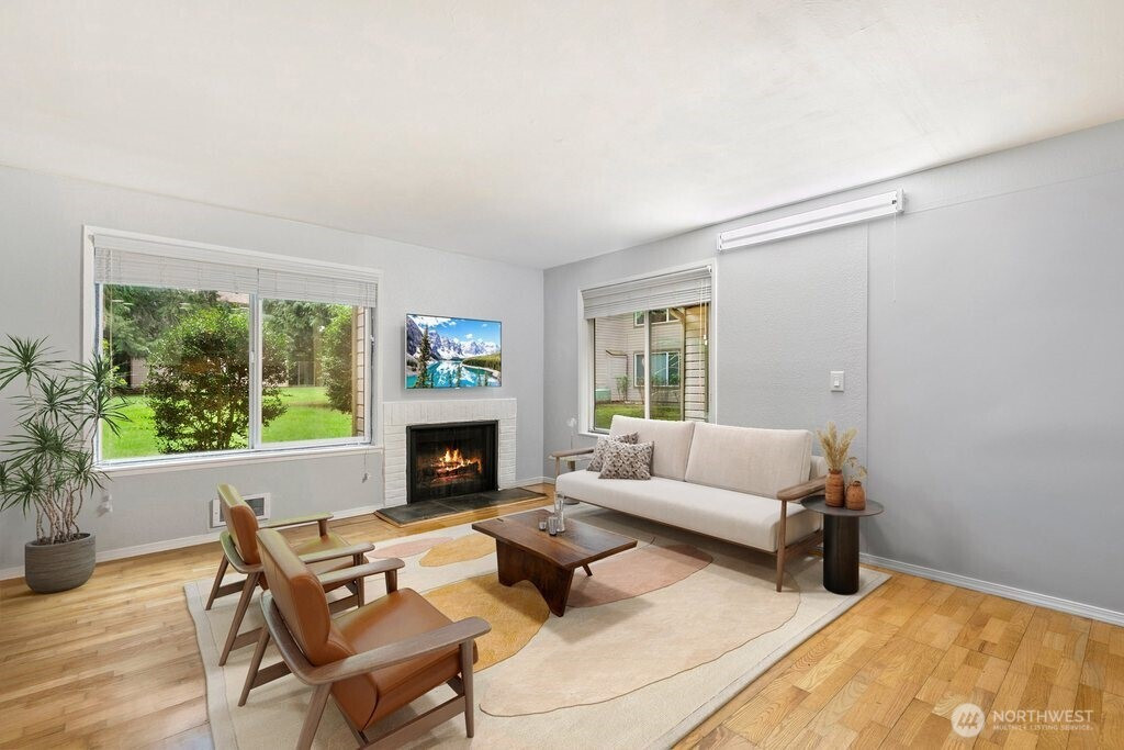 Welcome to this beautifully refreshed ground-floor corner-unit condo—bright, inviting, and ideally located just minutes from Microsoft. Fresh interior paint and great natural light highlight the open living and dining areas, anchored by a cozy fireplace. The kitchen features new stainless-steel appliances for a clean, modern feel. A spacious primary suite offers excellent storage, while the versatile office/bonus room provides the perfect spot for work or creative use. Enjoy in-unit laundry, two storage units, and a covered patio off the dining area—perfect for relaxing or summer BBQs. One covered parking spot plus plenty of guest parking ensures easy day-to-day convenience. With quick access to shopping, restaurants, transit, and freeway connections, this updated condo delivers a fantastic blend of comfort, location, and lifestyle on the Eastside. The well-maintained community offers an outdoor swimming pool open during the summer months, no rental cap, and a 50% neighborhood discount at PRO Club.