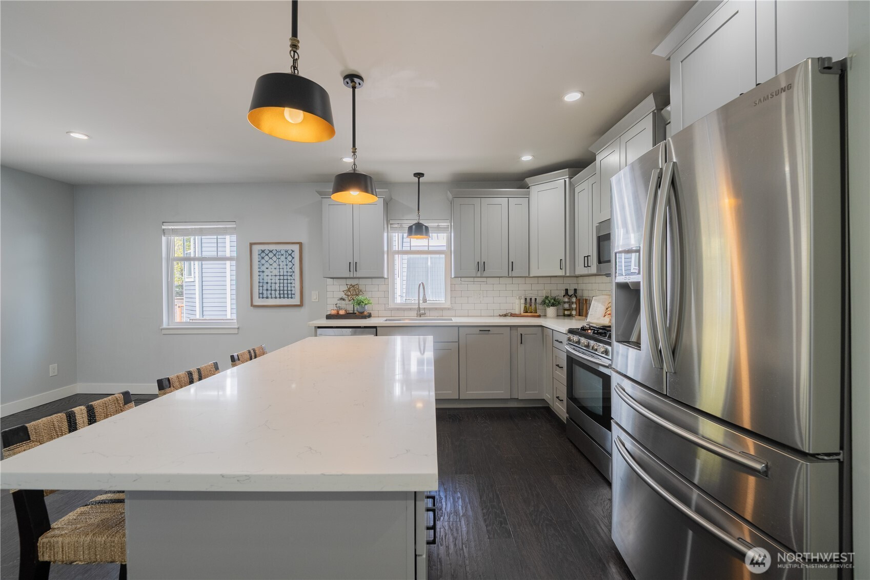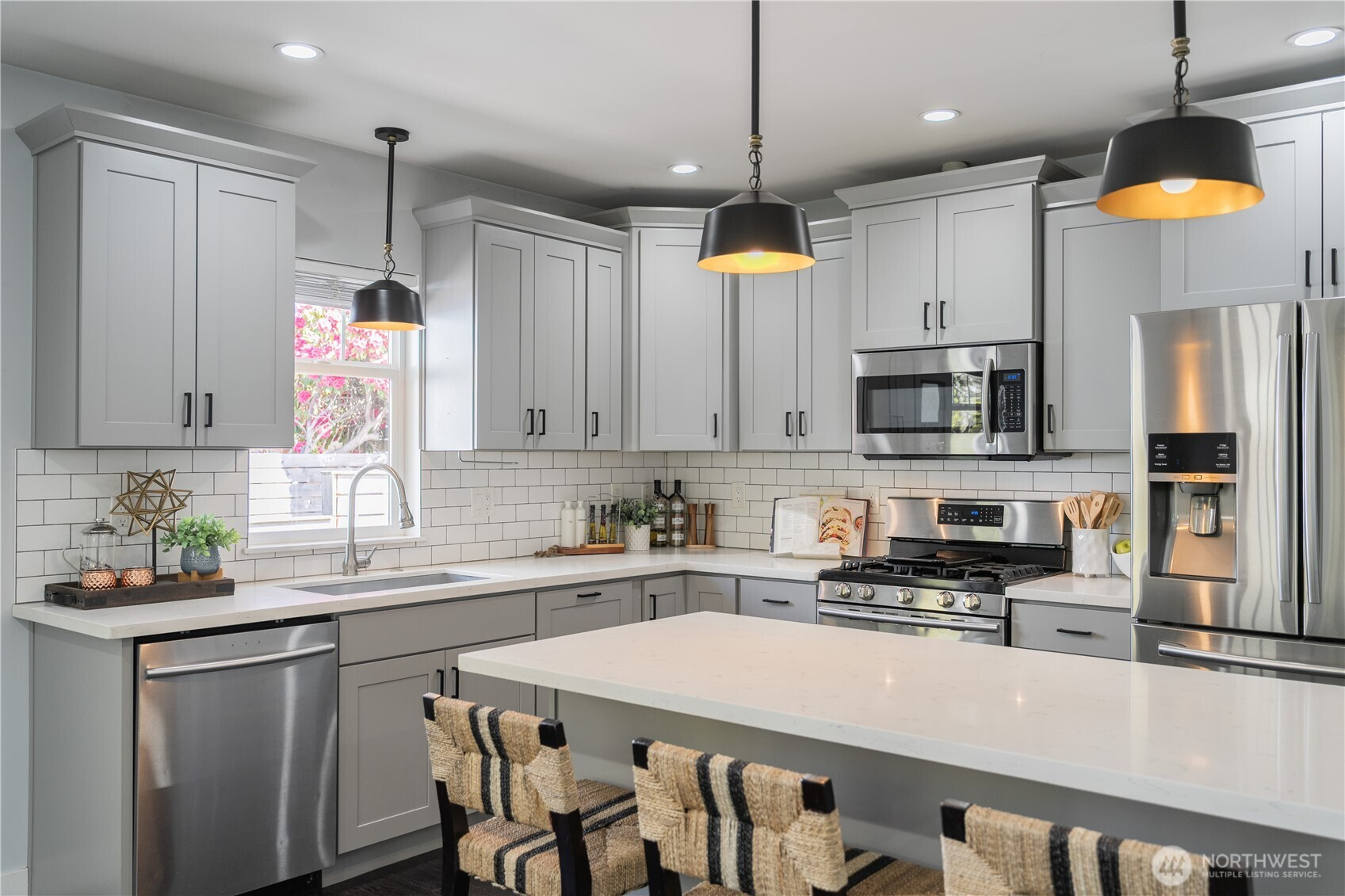 STYLISH, UPDATED & A SHORT STROLL TO ALASKA JUNCTION Perfectly located in one of West Seattle’s most walkable neighborhoods, this bright and inviting Genesee home blends timeless charm with thoughtful, modern updates. From the moment you arrive, curb appeal shines with a welcoming front yard and covered porch entry. Inside, an open-concept layout flows from the light-filled living room—featuring custom built-ins—into a spacious kitchen with a center island and contemporary finishes. Around the corner a powder room brings added convenience. The dining area, complete with a wet bar, opens to a backyard patio, creating an ideal indoor-outdoor living experience. The main-floor primary suite offers a peaceful retreat, featuring dual walk-in closets and a beautifully updated ensuite bath. Downstairs, the lower level adds flexibility with two additional bedrooms, a full bath, and a generous bonus space—perfect for a media room, home office, or relaxed living area. Looking for future upside? RSL zoning and alley access present potential for a DADU above or in place of the existing garage. Designed for easy living, this home includes a durable 50-year metal roof, ample off-street parking, a one-car garage, and a sunny fully enclosed backyard for your pet. Just moments from Trader Joe’s, Whole Foods, local cafés, restaurants, and boutique shops—you'll experience a convenient commute to downtown Seattle and a rare blend of neighborhood charm and urban convenience. Welcome home!