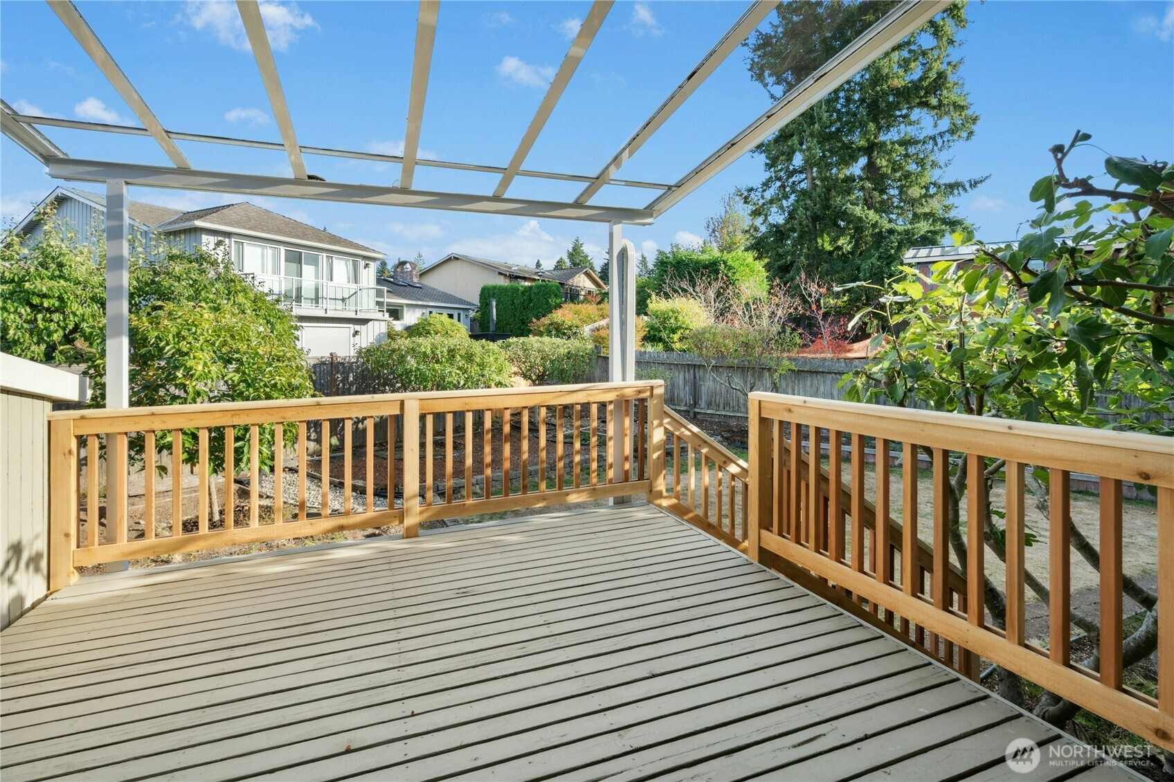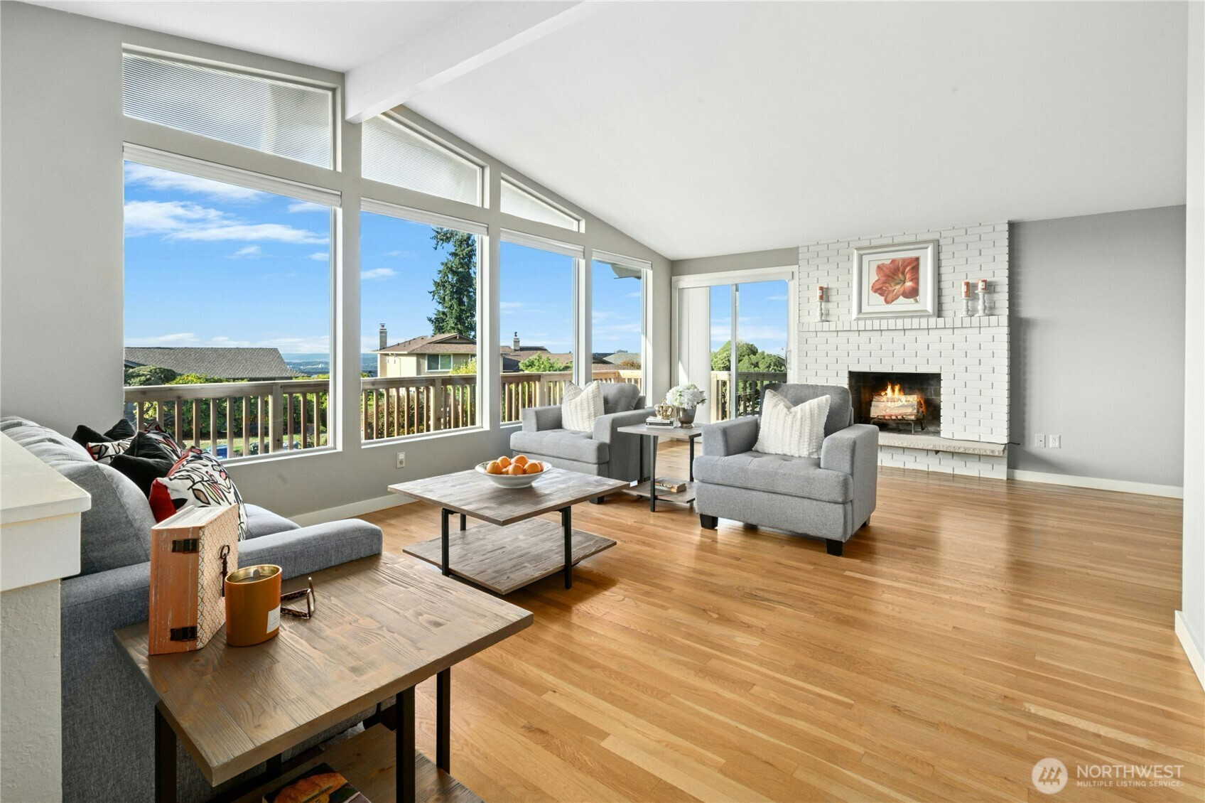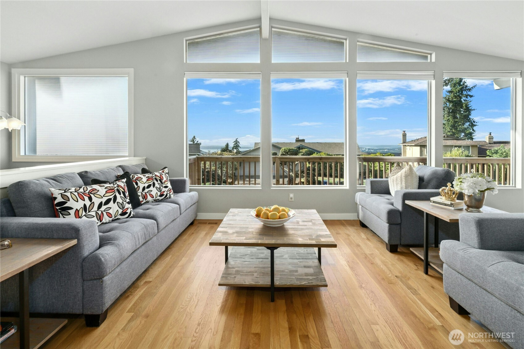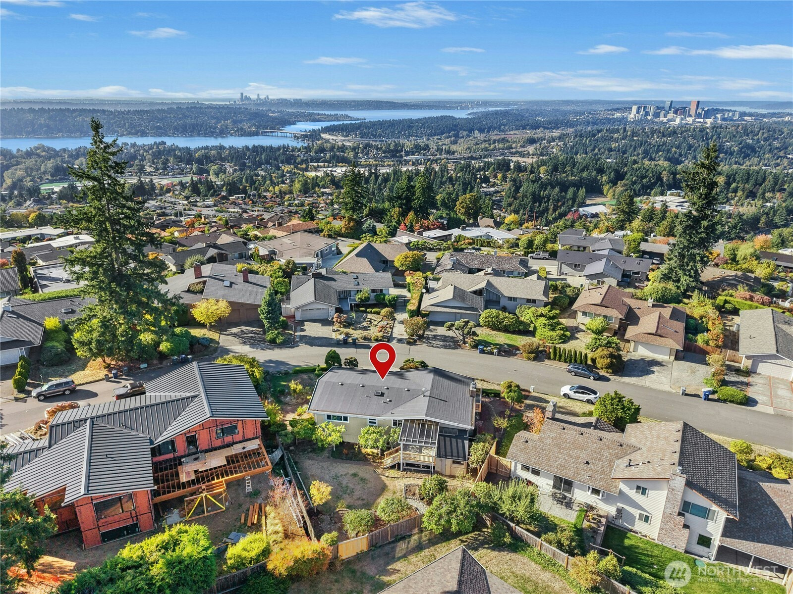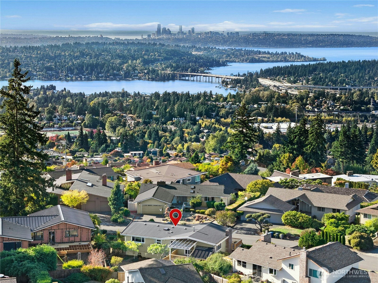 Welcome home to this meticulously cared for Somerset home, perfectly perched above the street with partial views of Lake WA, Seattle, Bellevue & the Olympics. Main living room features vaulted ceilings, a wall of windows & access to the front deck with new composite decking & railing. Large remodeled spacious kitchen with eat-in nook features SS appliances, granite counters, built-in desk & plenty of cabinets and storage. Oak hardwood floors on the upper floor with 3 bedrooms upstairs. Downstairs features a large family room, large utility room, bedroom and 3/4 bathroom. Fully fenced backyard features a covered back deck, mature landscaping with garden space, and fruit trees. Award winning BSD schools: Somerset, Tyee, & Newport HS.