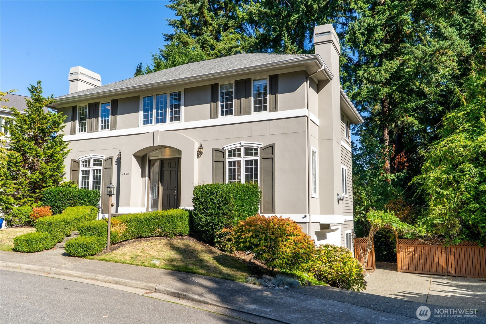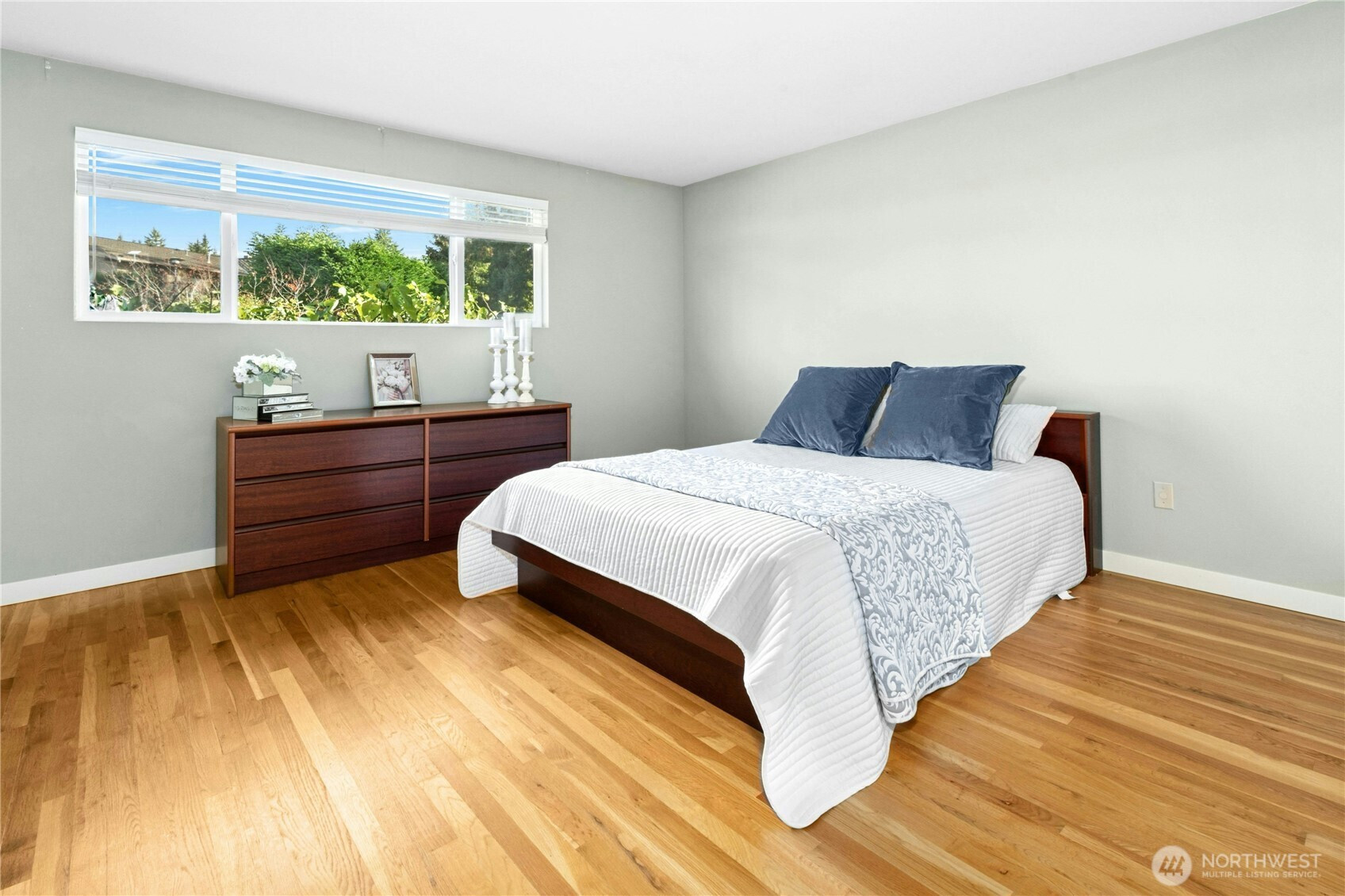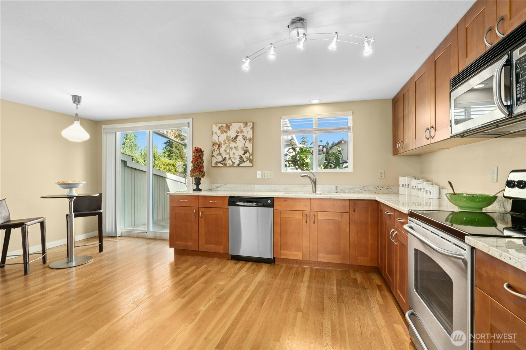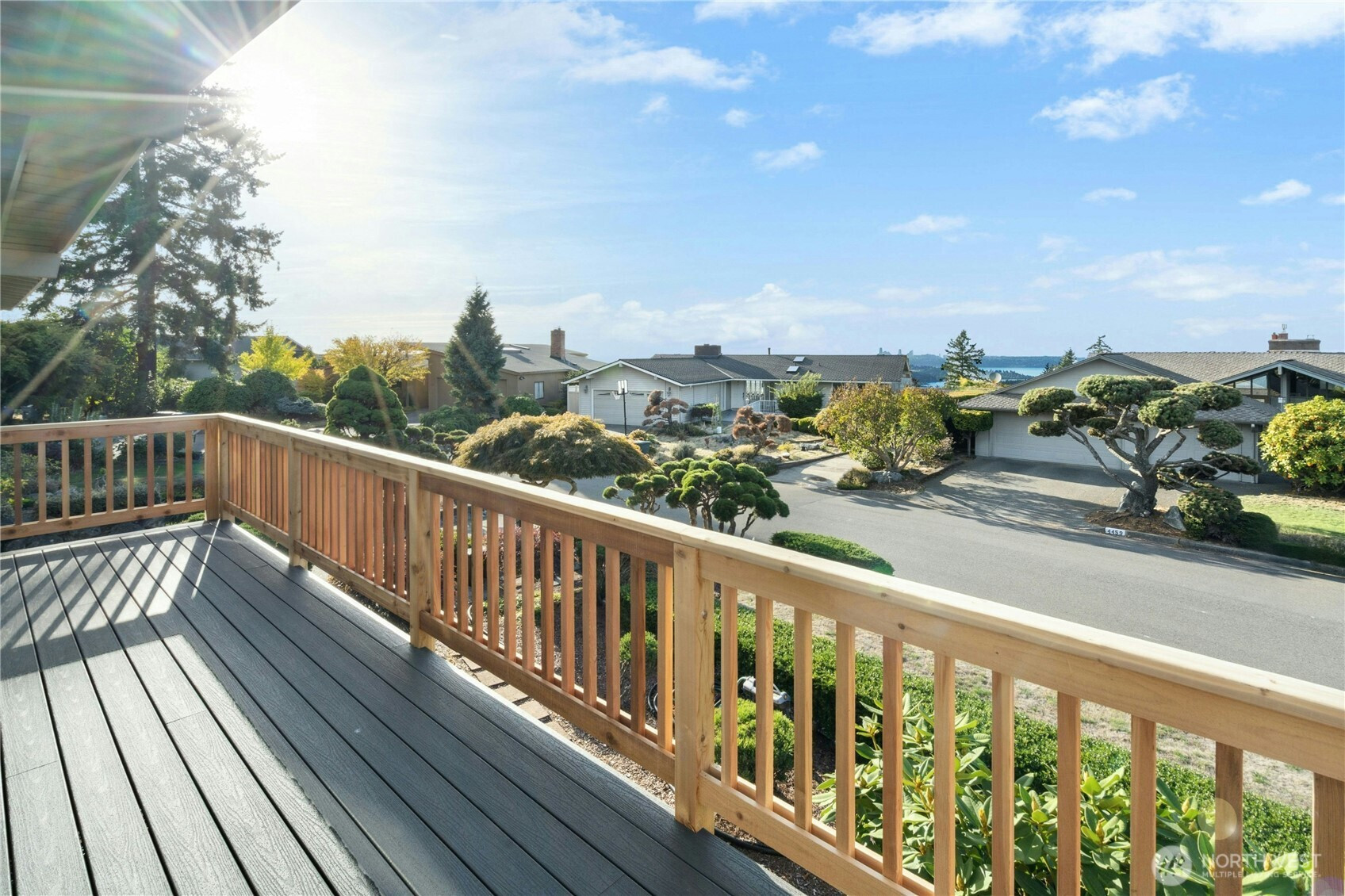 Welcome home to this meticulously cared for Somerset home, perfectly perched above the street with partial views of Lake WA, Seattle, Bellevue & the Olympics. Main living room features vaulted ceilings, a wall of windows & access to the front deck with new composite decking & railing. Large remodeled spacious kitchen with eat-in nook features SS appliances, granite counters, built-in desk & plenty of cabinets and storage. Oak hardwood floors on the upper floor with 3 bedrooms upstairs. Downstairs features a large family room, large utility room, bedroom and 3/4 bathroom. Fully fenced backyard features a covered back deck, mature landscaping with garden space, and fruit trees. Award winning BSD schools: Somerset, Tyee, & Newport HS.