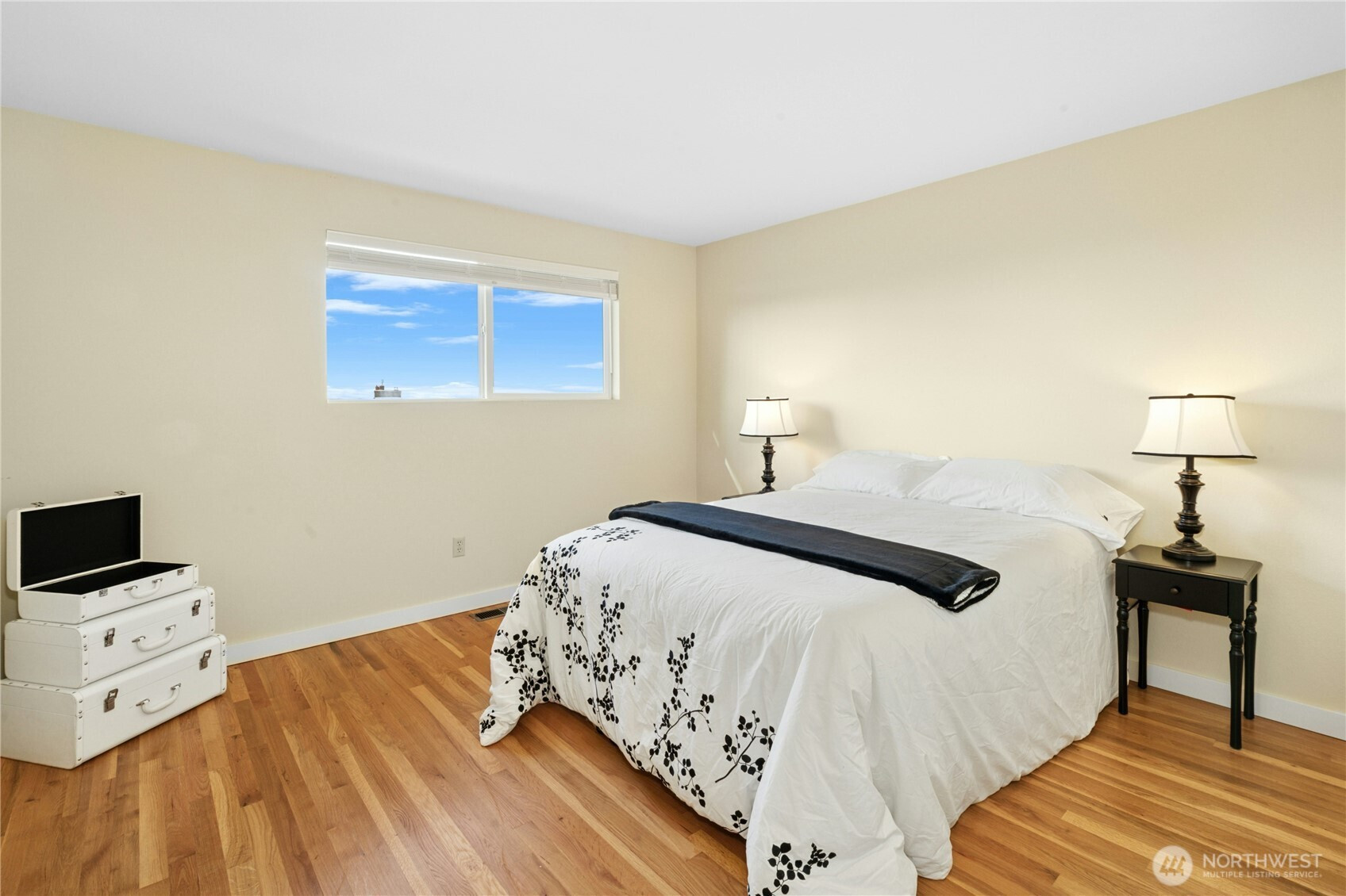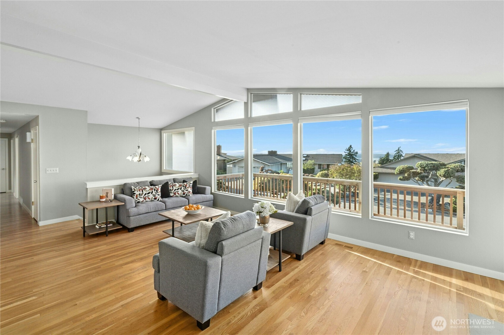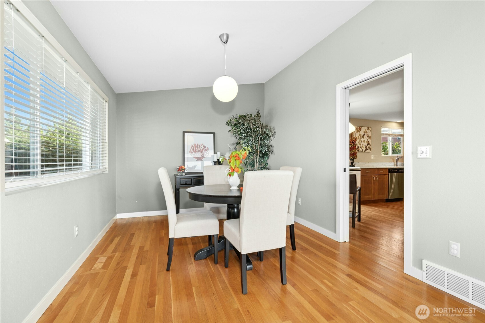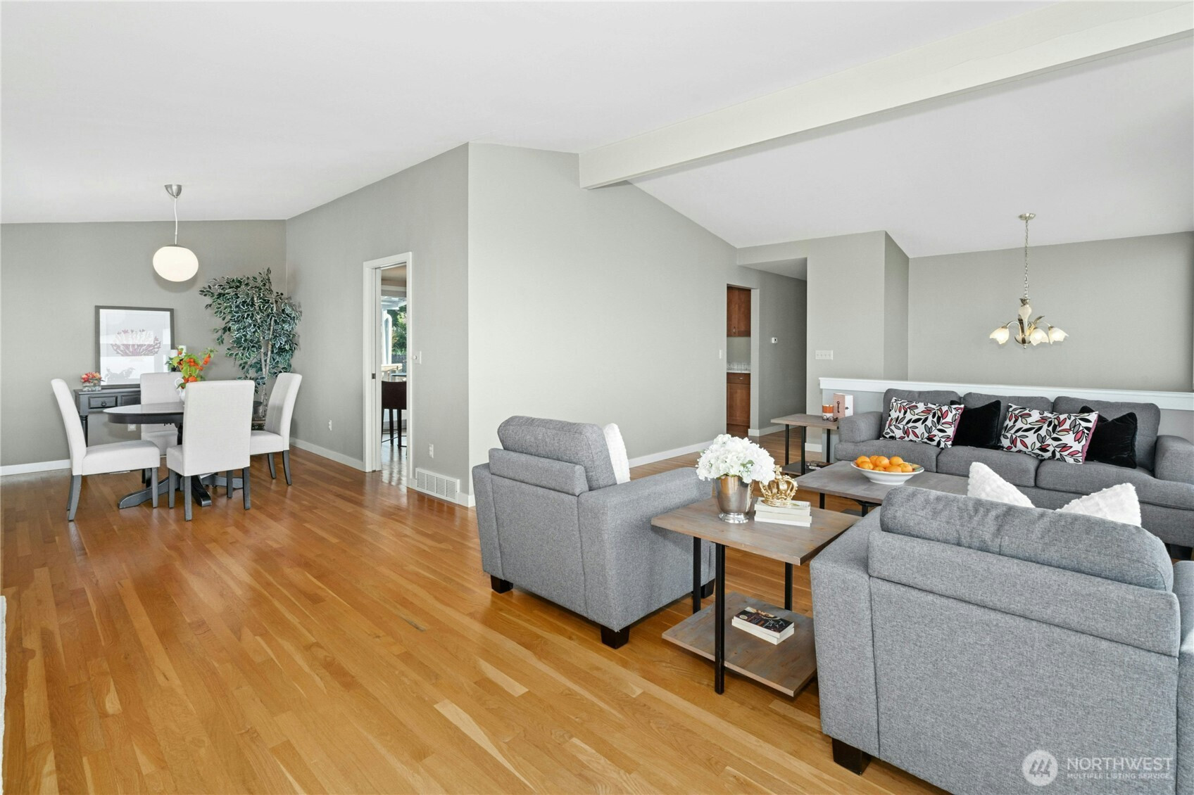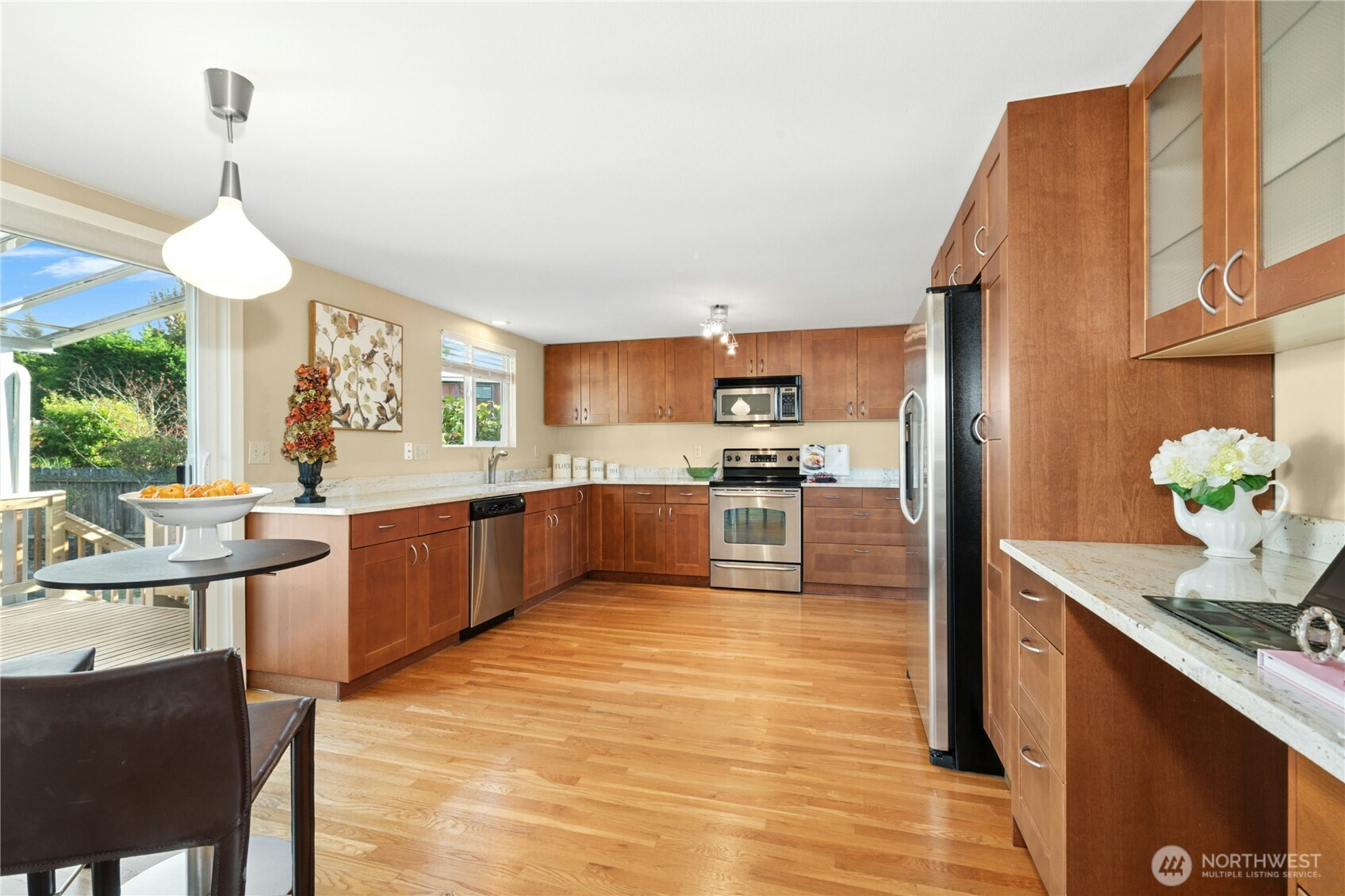 Welcome home to this meticulously cared for Somerset home, perfectly perched above the street with partial views of Lake WA, Seattle, Bellevue & the Olympics. Main living room features vaulted ceilings, a wall of windows & access to the front deck with new composite decking & railing. Large remodeled spacious kitchen with eat-in nook features SS appliances, granite counters, built-in desk & plenty of cabinets and storage. Oak hardwood floors on the upper floor with 3 bedrooms upstairs. Downstairs features a large family room, large utility room, bedroom and 3/4 bathroom. Fully fenced backyard features a covered back deck, mature landscaping with garden space, and fruit trees. Award winning BSD schools: Somerset, Tyee, & Newport HS.
