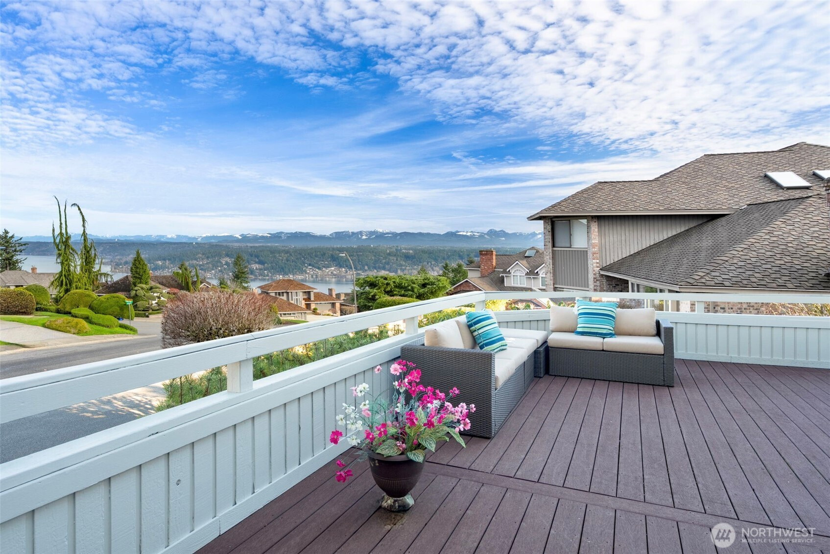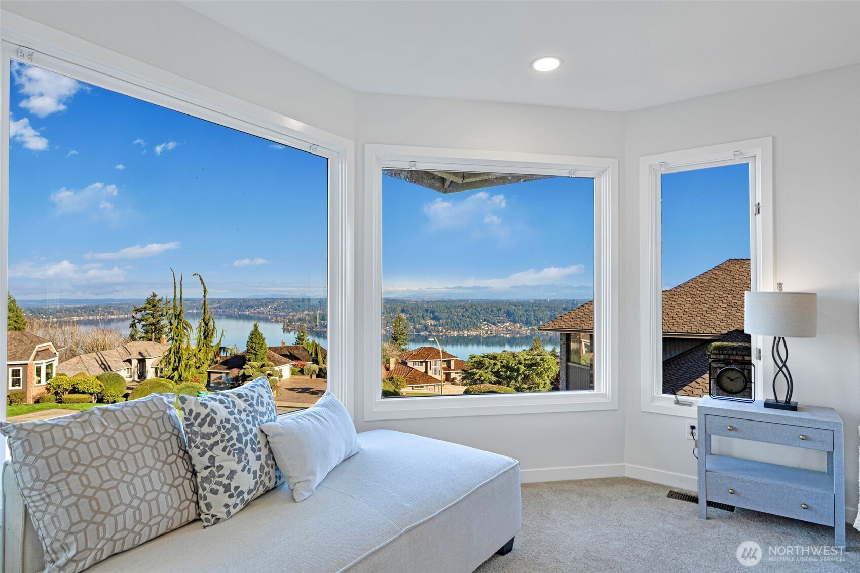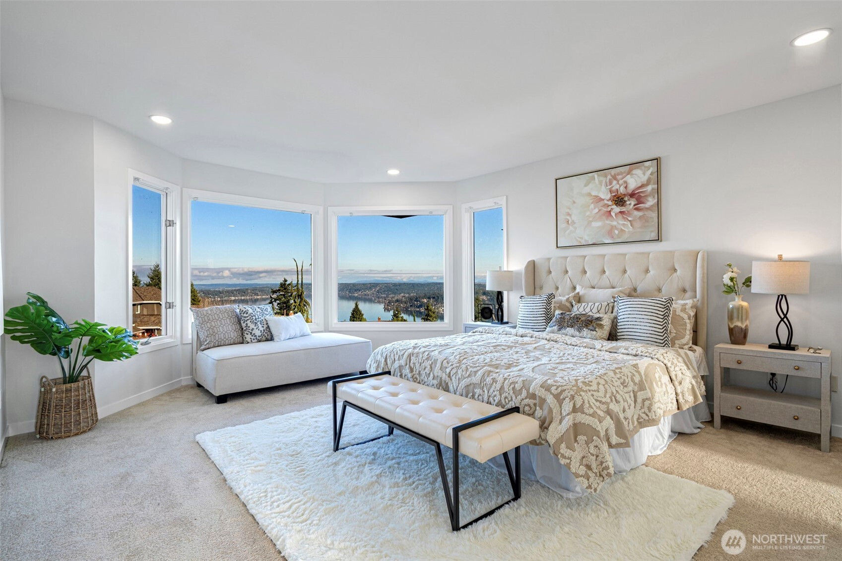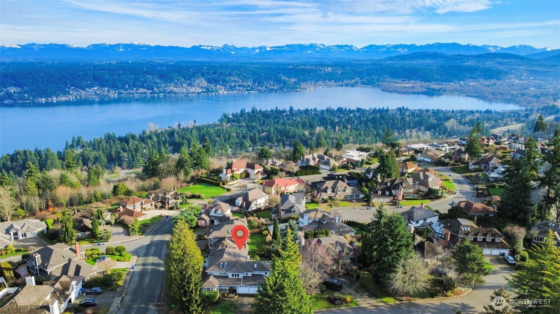 Stunning 180-degree panoramic views of Lake Sammamish, Mt. Baker and the Cascade Mountains define this elegant two-story Lakemont home in the sought-after Vuemont community. Enjoy breathtaking scenery from multiple living spaces and the backyard, offering a rare blend of privacy and views. The bright, open floor plan is designed for both everyday living and entertaining, featuring a chef’s kitchen with bar seating and abundant natural light. The dramatic high-ceiling living room flows seamlessly to a large view deck, perfect for gatherings or quiet evenings overlooking the landscape.The home offers 4 bedrooms and 3.25 baths, including a flexible main-floor office/den with a nearby shower, ideal for guests or multi-generational living. Upstairs features a spacious primary suite with walk-in closet, additional bedrooms and a generous bonus room providing excellent separation of space. Recent updates include a new roof (2023), fresh interior and exterior paint, updated bathrooms, refinished hardwood floors and new carpet, offering true move-in-ready peace of mind.Situated on a corner lot near a quiet cul-de-sac, the 10,091 sq ft lot includes a scenic backyard with views and excellent usability. Exceptional location close to top-rated schools, neighborhood parks, shopping, dining, trails and year-round recreation, combining comfort, convenience and long-term value in one of Lakemont’s most desirable neighborhoods.