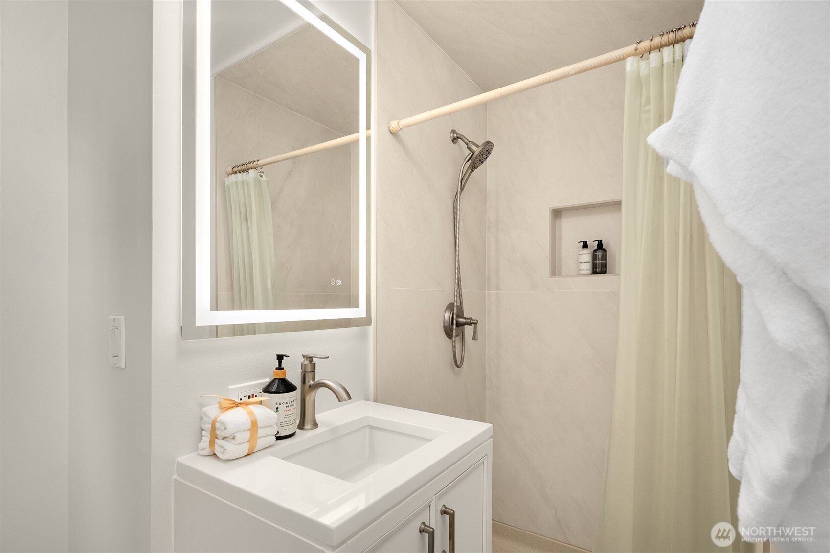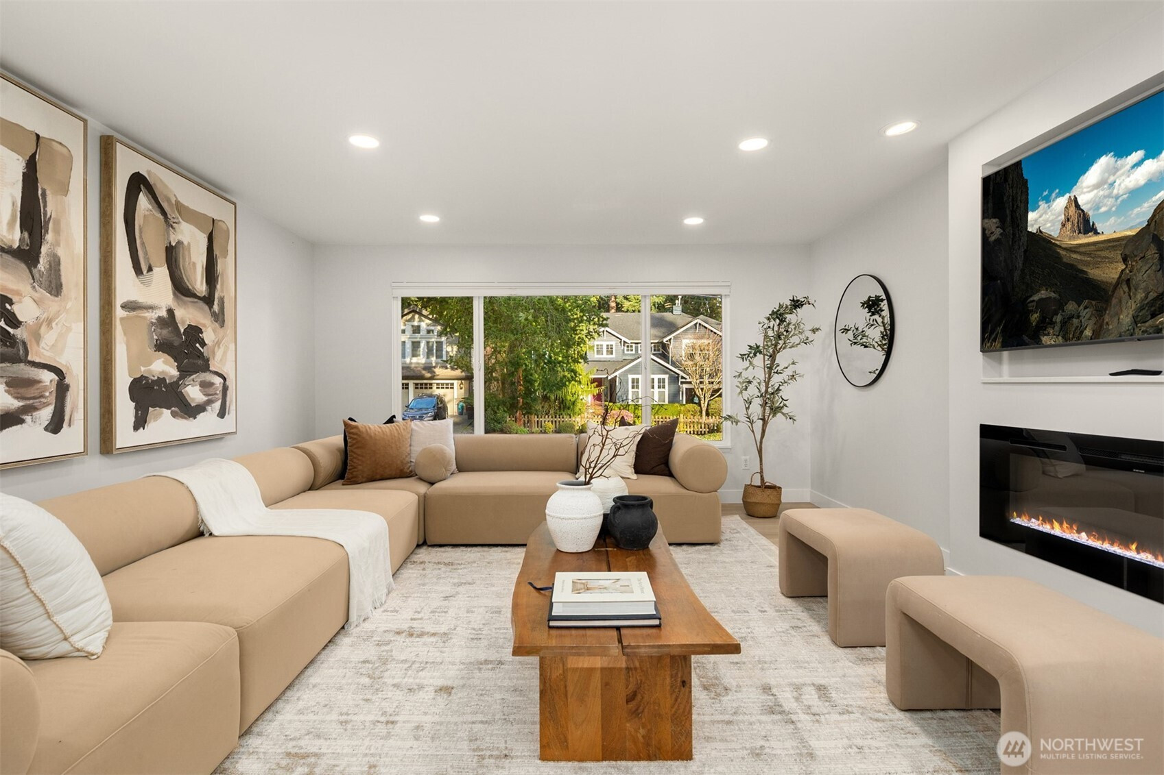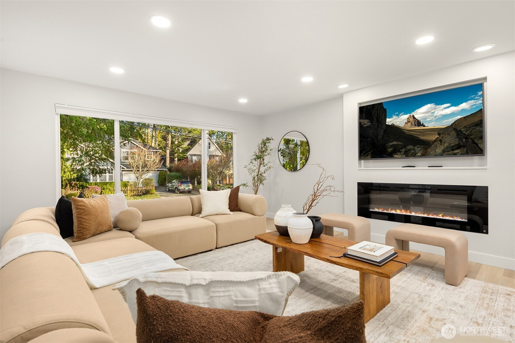 Set amidst towering evergreens, this residence presents a compelling blend of modern form and effortless livability. The approach is memorable, with intentional design elements that hint at the level of detail carried throughout the home. Inside, bright interiors and a flowing layout create spaces that feel both connected and comfortable. At the heart of the main level, the kitchen is designed for gathering and everyday ease, featuring an oversized island, quartz counters, streamlined cabinetry, and quality appliances. The adjoining living area centers around a five-foot electric fireplace with integrated heat, positioned beneath a dedicated TV niche, offering both style and function. Expansive glass doors extend the living space outdoors to a deck that overlooks a spacious flat yard with a sports court area—well-suited for recreation, gardening, or entertaining. Extra parking for a boat and the cutest playhouse you have ever seen. Finishes are cohesive and thoughtfully selected, bringing a sense of continuity to each room. Located in a sought-after mid-island setting, this property offers close proximity to schools, the library, Mary Wayte Pool, and community amenities, delivering a balance of privacy and convenience.