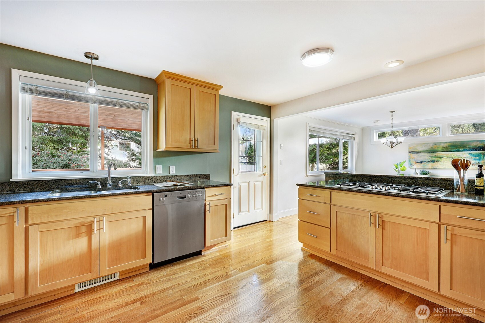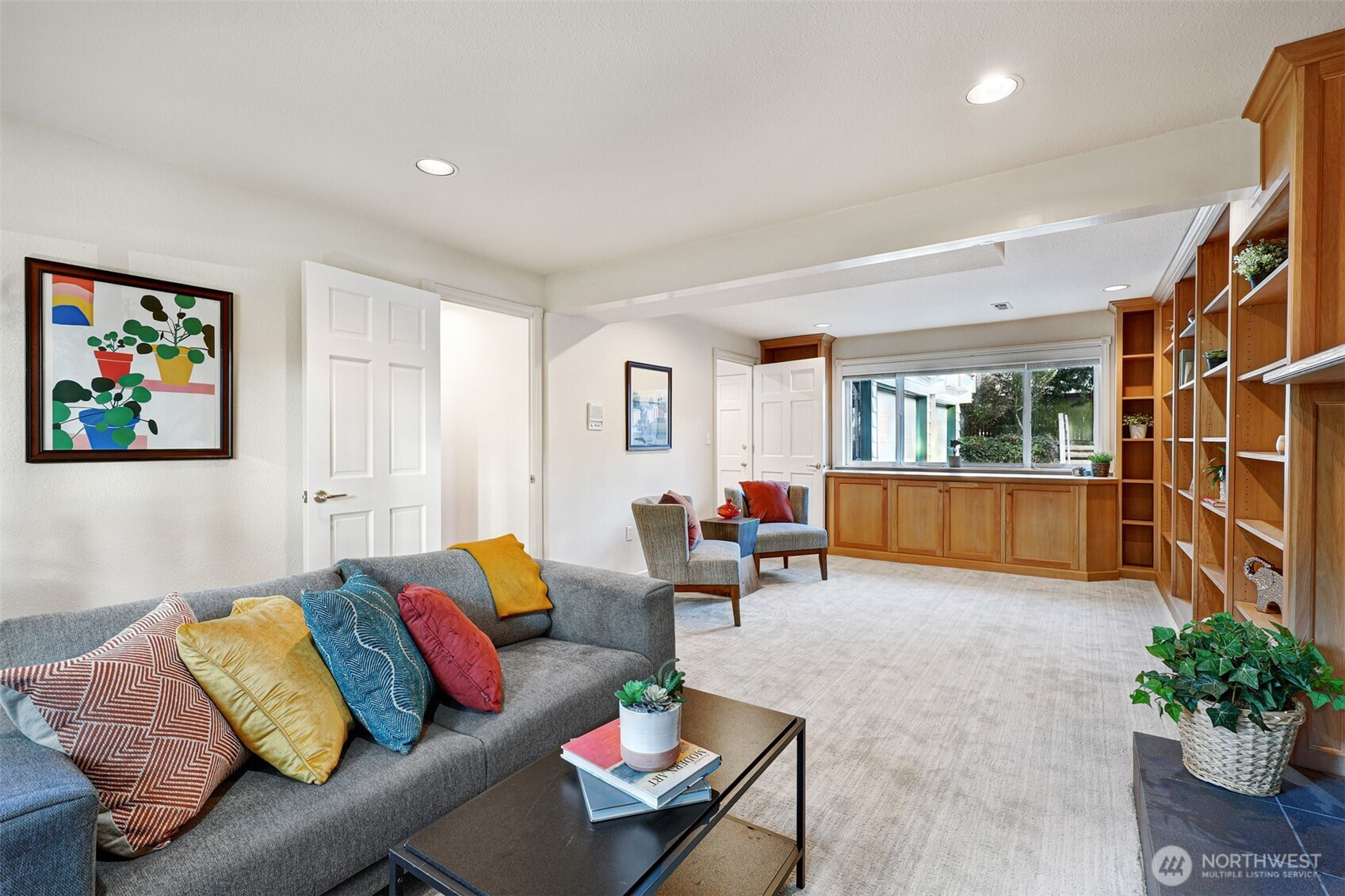 Spacious and serene in Mid-Island! Tucked back from the road in a private setting, this home offers all the right spaces to live, work, play, and host. Open living and dining areas are perfect for your next gathering with a cozy fireplace, gleaming hardwoods, and brilliant natural light. Cooks will delight in the roomy kitchen featuring slab granite surfaces, stainless-steel appliances, a breakfast bar, and cupboards galore. Step out for year-round al fresco enjoyment on the expansive, covered deck with skylights and stairs leading down to the patio. Three bedrooms are all together on the main floor, including your large primary suite with 3/4 bath. Discover fantastic flex-space on the lower level offering a fireside rec room with beautiful built-in library shelving, generous bedroom with adjoining office, guest bath with shower, and full second kitchen—ideal for multi-generational living or an au pair. Set in an ideal location just minutes from parks, the library, top-rated schools, Mercer Island town center, and I-90 access to Seattle or Bellevue.