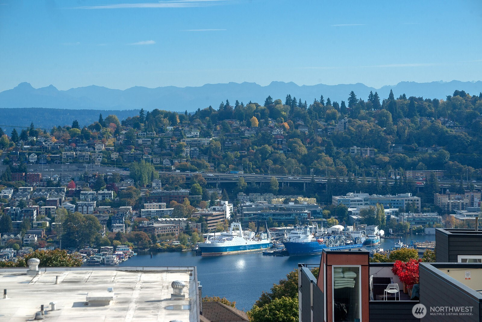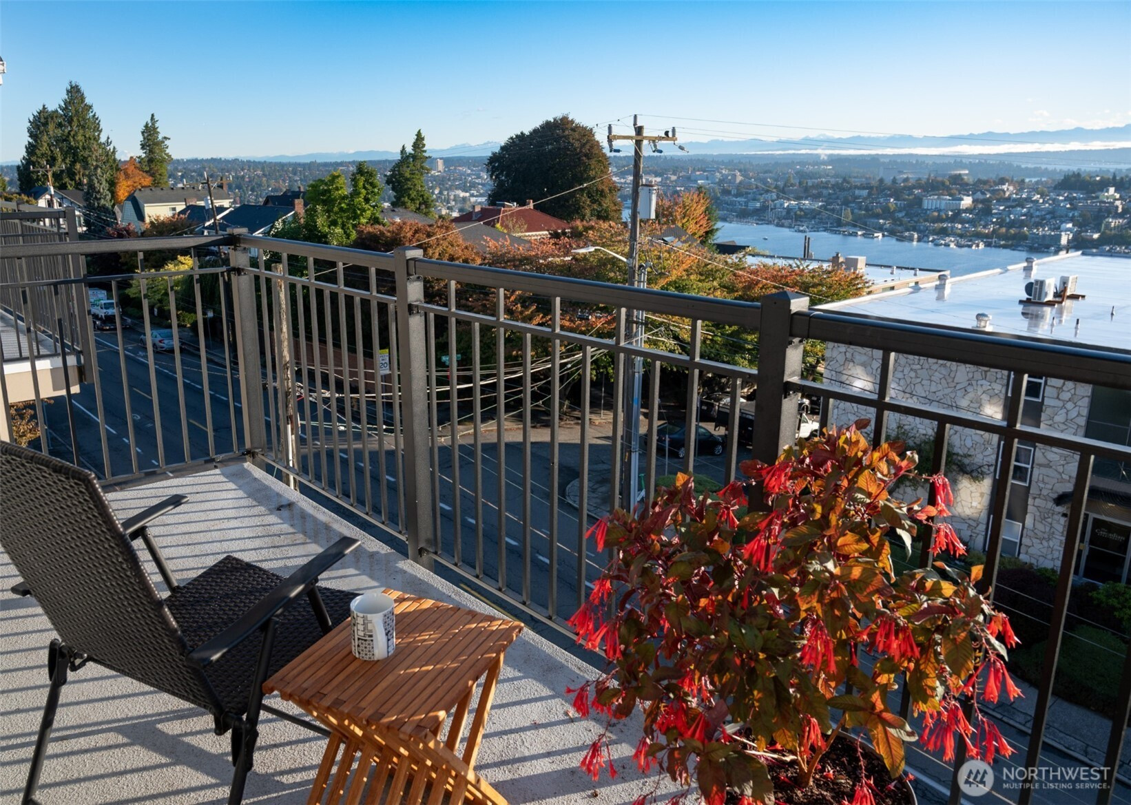 Prepare to be delighted by this top floor unit with cathedral ceilings, spectacular natural light & 180-degree views! This urban pied-a-terre has an updated kitchen with quartz counters, stainless appliances, & skylight. Meticulous hardwood floors, dining room, fireplace, & large deck. The views stretch from the Space Needle & across the city with glimpses of Mt. Rainier, over Lake Union, dotted with Cascade Mountain vistas all the way to Mt. Baker. Enjoy fireworks on New Years Eve & 4th of July. The big bedroom has plenty of room for a King-sized bed & desk/dresser, plus a walk-in closet. Storage & secured covered parking. Just a short stroll (nearly flat!) to top of Queen Anne shopping, restaurants, bars. Enjoy the rare combination of a very well-funded & managed building with affordable dues! No assessments! Priced well below assessed value for quick sale! Don't wait!