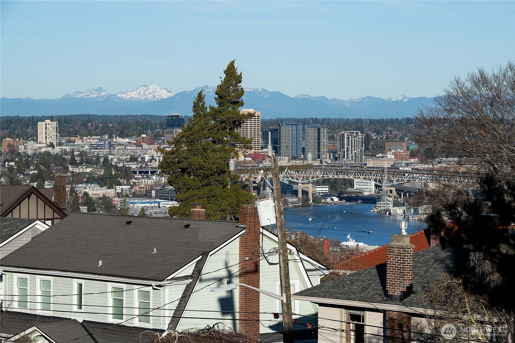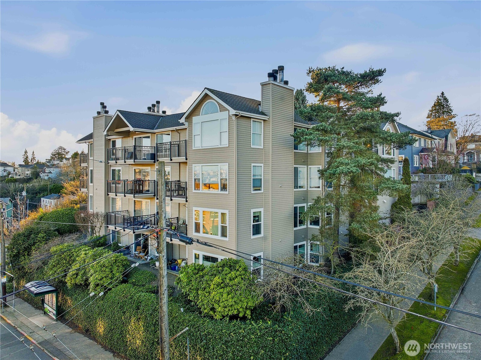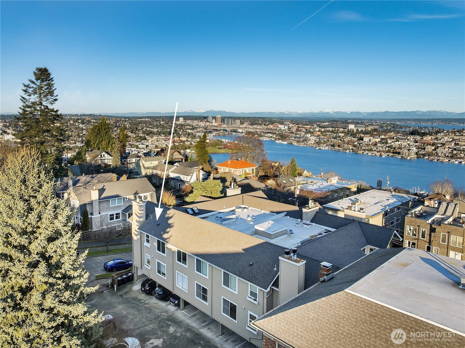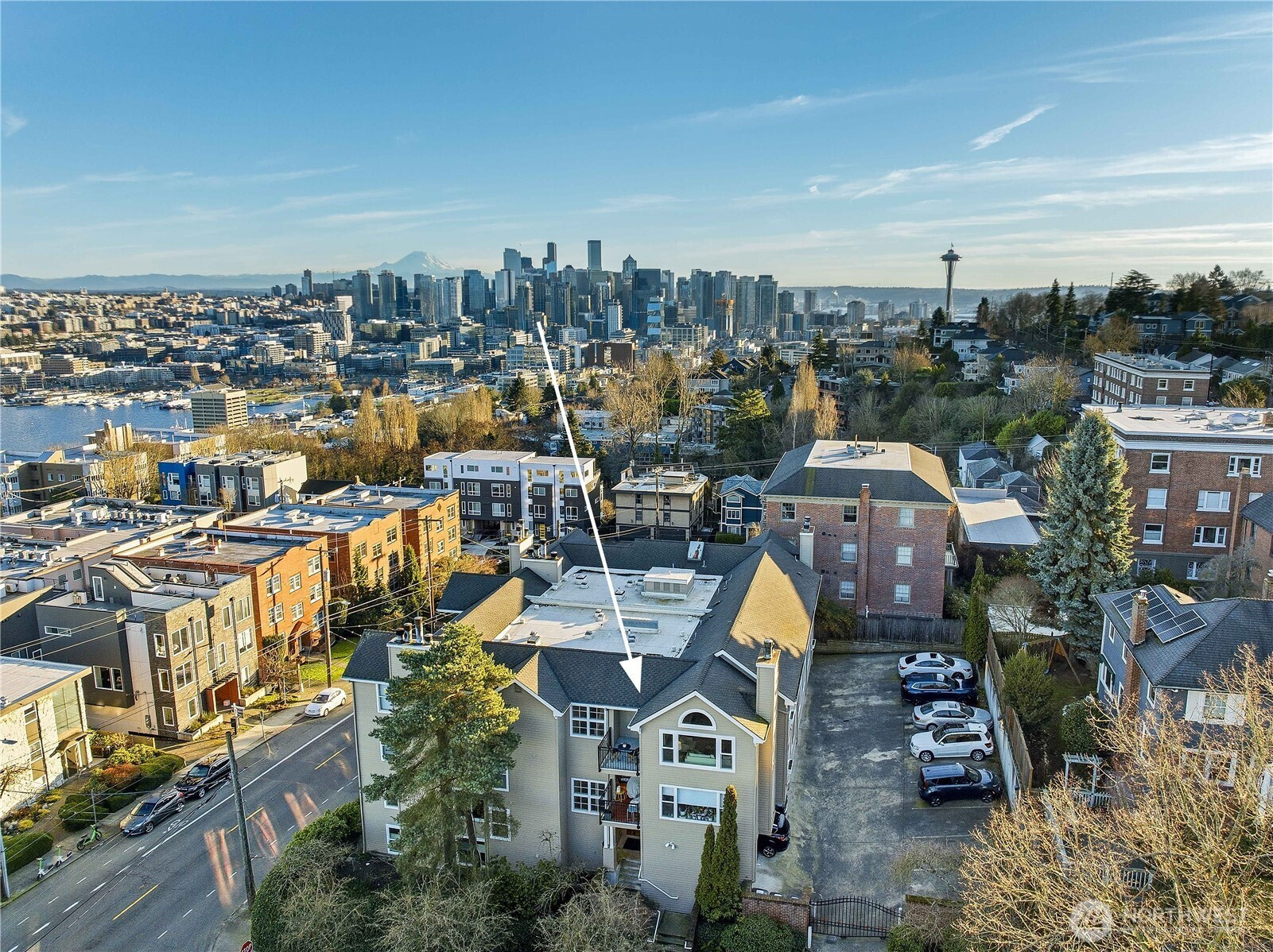 Standout value in today’s crowded condo market. This light-filled 2-bedroom, 1-bath home enjoys a top-floor setting in a 16-unit boutique building near the top of Queen Anne. North-facing windows and a private deck capture views toward the Ship Canal and Cascades, bringing light and openness to the living space. Thoughtful details include a cozy fireplace, free-standing bookcase, and a refreshed galley kitchen with farmhouse sink and butcher-block counters. Heated floors and towel bar in spacious bathroom with double pedestal sinks. Recently updated with new carpet, fresh paint, and professionally cleaned and resealed tile surfaces throughout, the home is move-in ready. In-unit stacked washer/dryer, generous closet space, additional storage locker down the hall, and gated carport parking add everyday convenience—all in a close-in location with easy access to downtown, SLU via Metro bus, and just minutes to Queen Anne amenities.