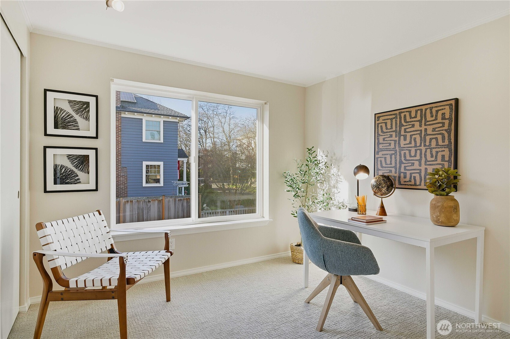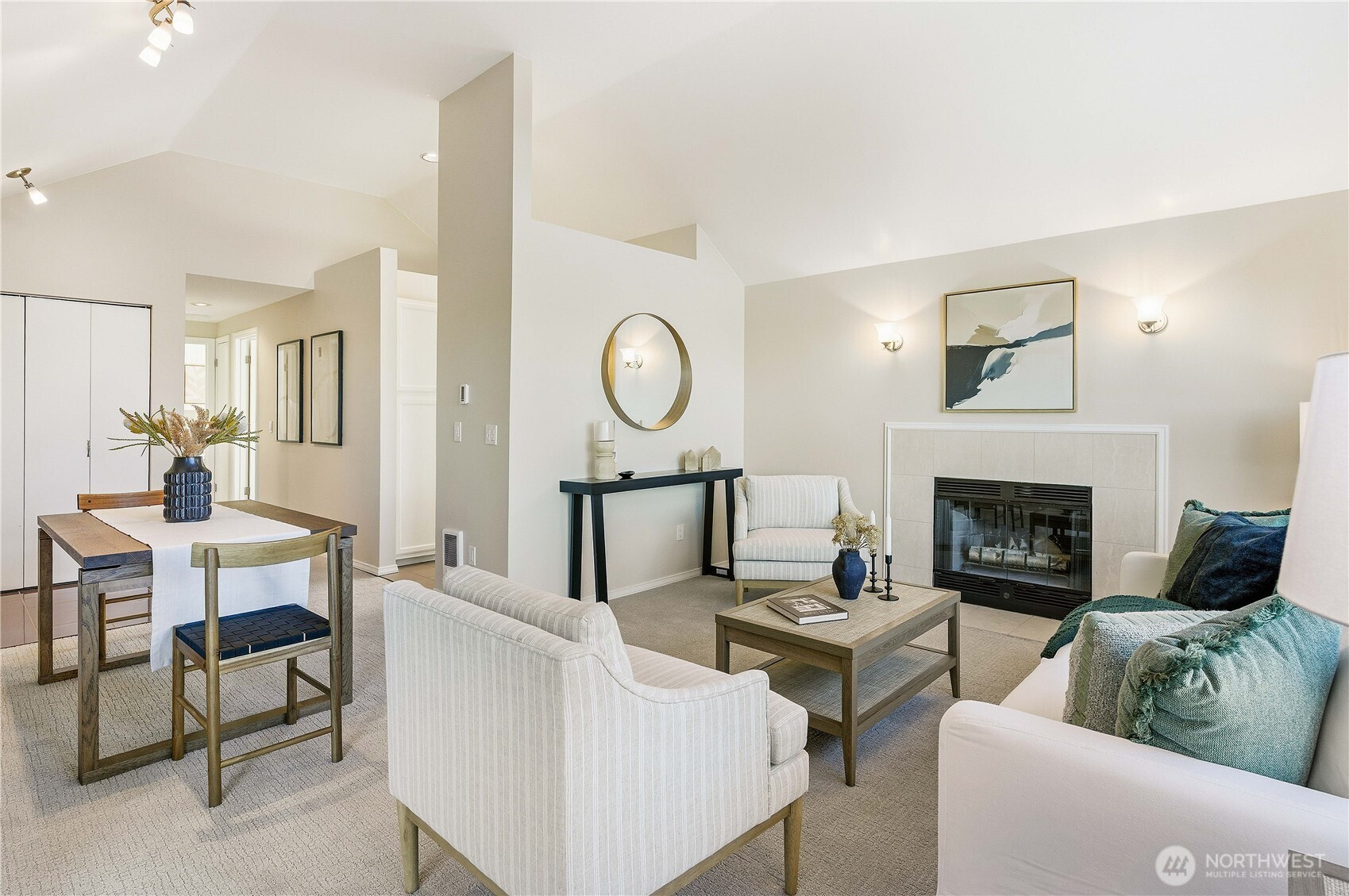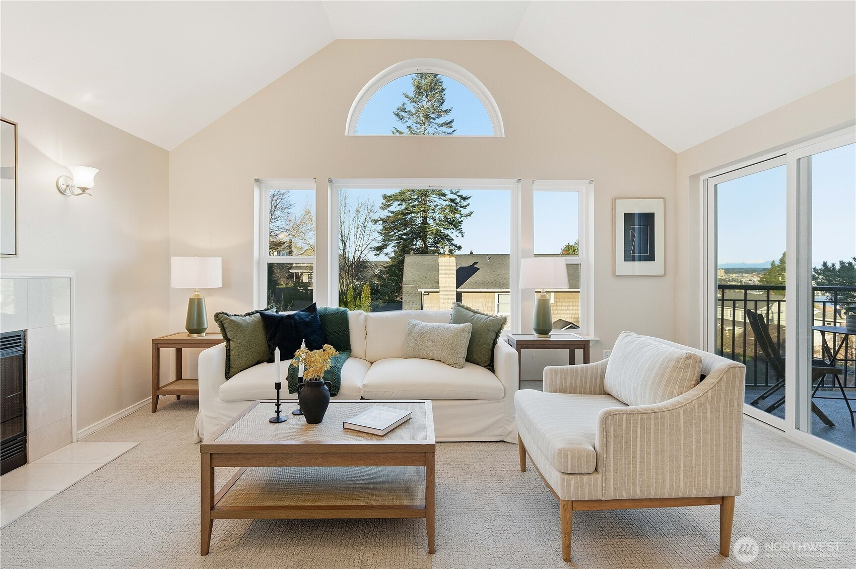 Standout value in today’s crowded condo market. This light-filled 2-bedroom, 1-bath home enjoys a top-floor setting in a 16-unit boutique building near the top of Queen Anne. North-facing windows and a private deck capture views toward the Ship Canal and Cascades, bringing light and openness to the living space. Thoughtful details include a cozy fireplace, free-standing bookcase, and a refreshed galley kitchen with farmhouse sink and butcher-block counters. Heated floors and towel bar in spacious bathroom with double pedestal sinks. Recently updated with new carpet, fresh paint, and professionally cleaned and resealed tile surfaces throughout, the home is move-in ready. In-unit stacked washer/dryer, generous closet space, additional storage locker down the hall, and gated carport parking add everyday convenience—all in a close-in location with easy access to downtown, SLU via Metro bus, and just minutes to Queen Anne amenities.