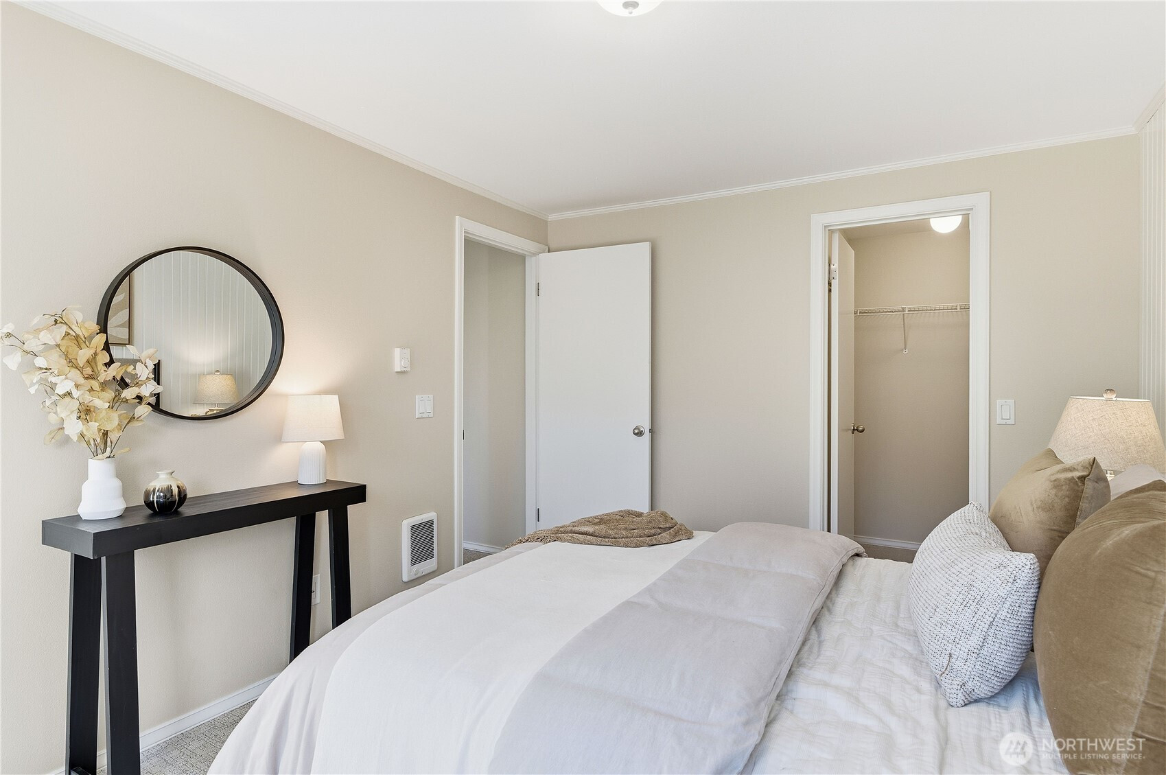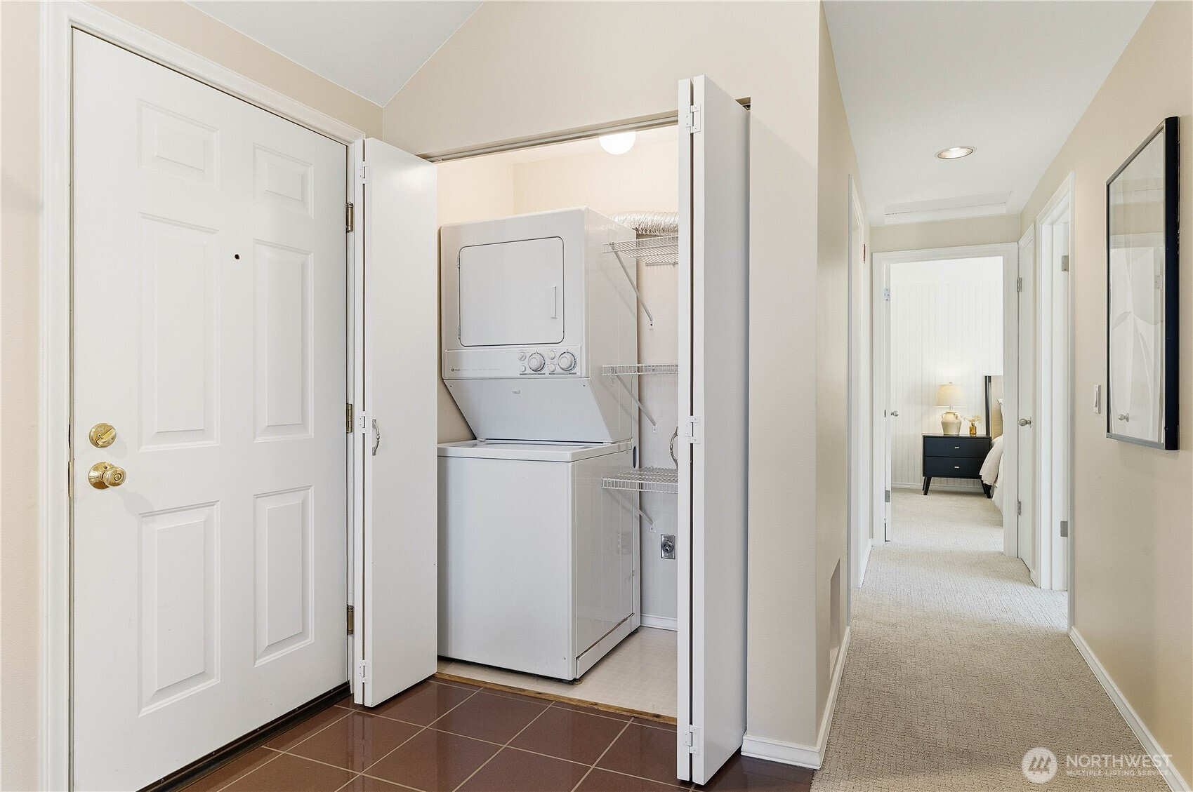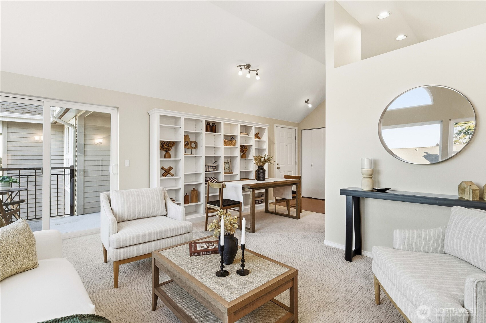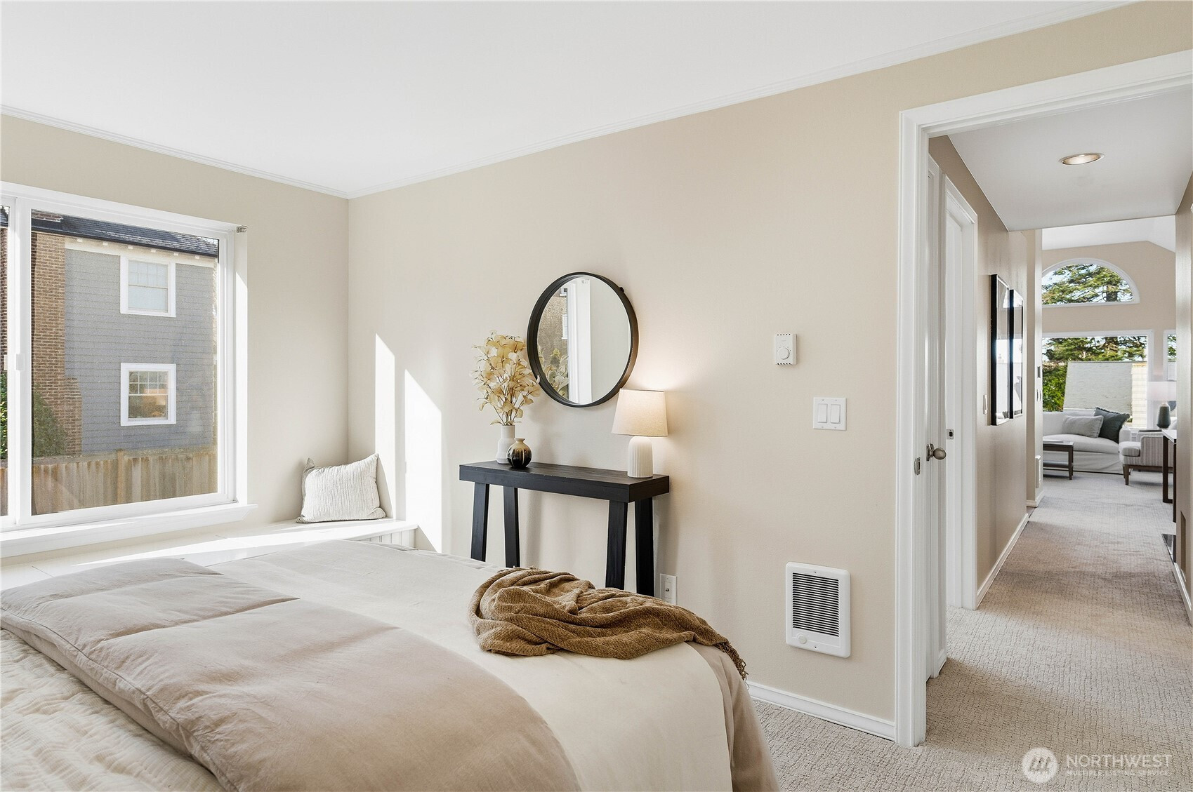 Standout value in today’s crowded condo market. This light-filled 2-bedroom, 1-bath home enjoys a top-floor setting in a 16-unit boutique building near the top of Queen Anne. North-facing windows and a private deck capture views toward the Ship Canal and Cascades, bringing light and openness to the living space. Thoughtful details include a cozy fireplace, free-standing bookcase, and a refreshed galley kitchen with farmhouse sink and butcher-block counters. Heated floors and towel bar in spacious bathroom with double pedestal sinks. Recently updated with new carpet, fresh paint, and professionally cleaned and resealed tile surfaces throughout, the home is move-in ready. In-unit stacked washer/dryer, generous closet space, additional storage locker down the hall, and gated carport parking add everyday convenience—all in a close-in location with easy access to downtown, SLU via Metro bus, and just minutes to Queen Anne amenities.
