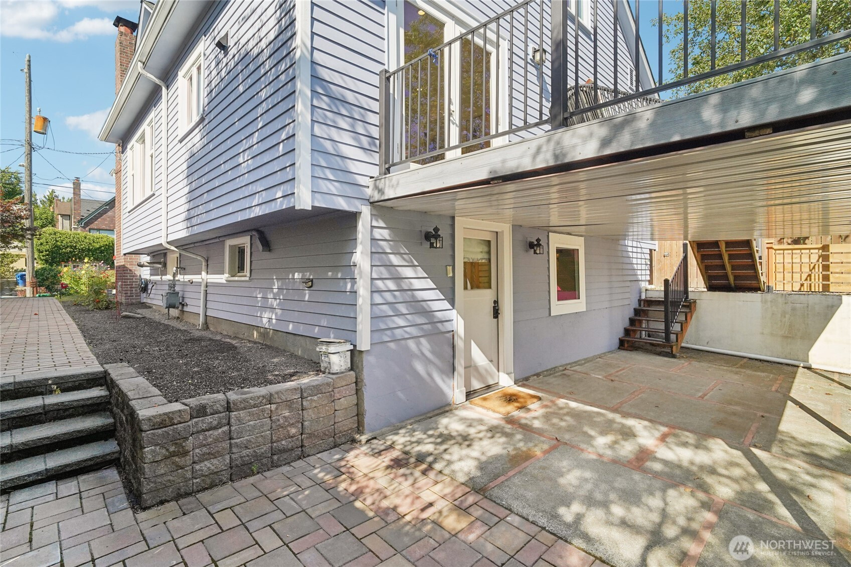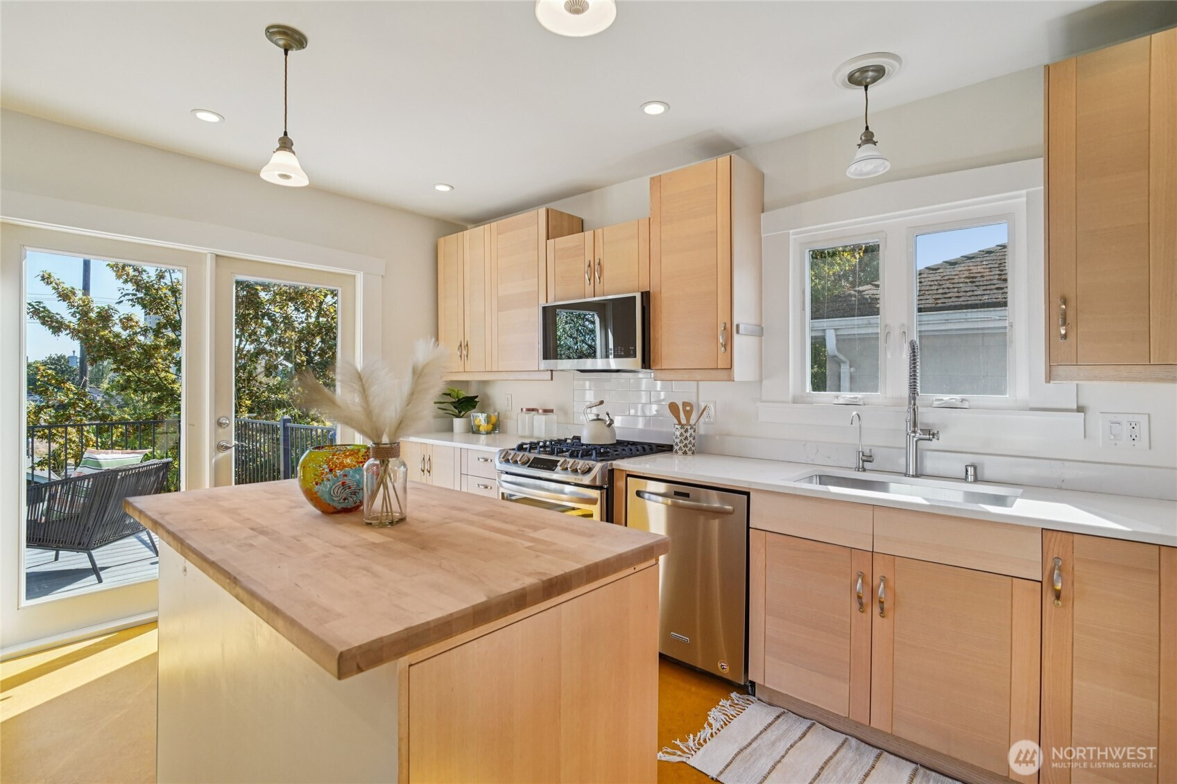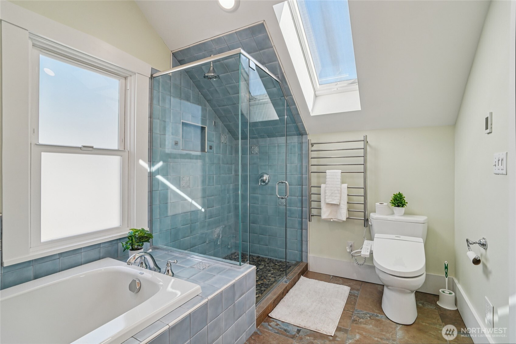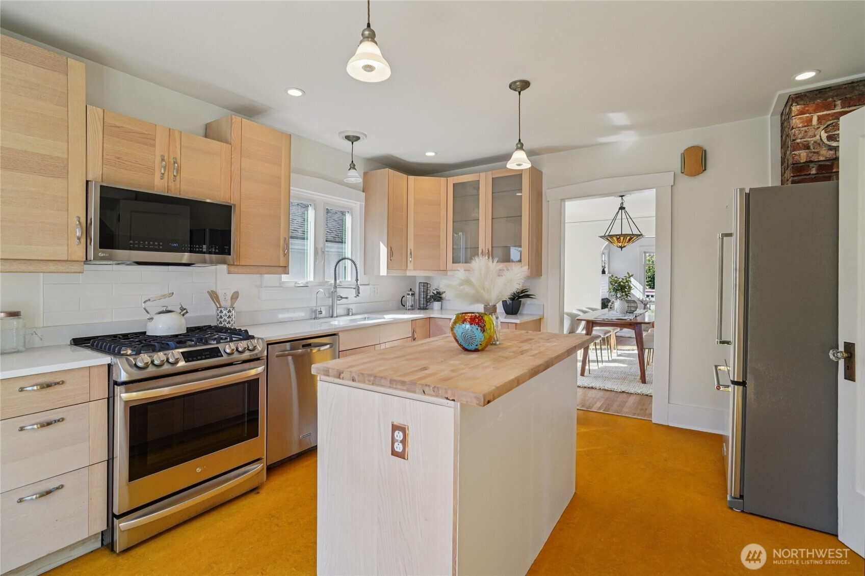Wallingford charm and thoughtful updates shine in this beautifully maintained home. Original leaded glass, a welcoming front porch, and refinished hardwoods set the tone in this light-filled, notably quiet space given its central location. The spacious living and dining rooms connect to a bright kitchen with stainless appliances, tile backsplash, and French doors to the Trex deck. Two main-floor bedrooms share a full bath. Upstairs, the skylit primary suite includes a walk-through closet and private 4-piece relaxing bath. The lower level offers a cozy media room, laundry, and loads of storage. Permitted Airbnb studio with its own entrance will subsidize your lifestyle. New sewer line with warranty. This is the home you’ve been waiting for.