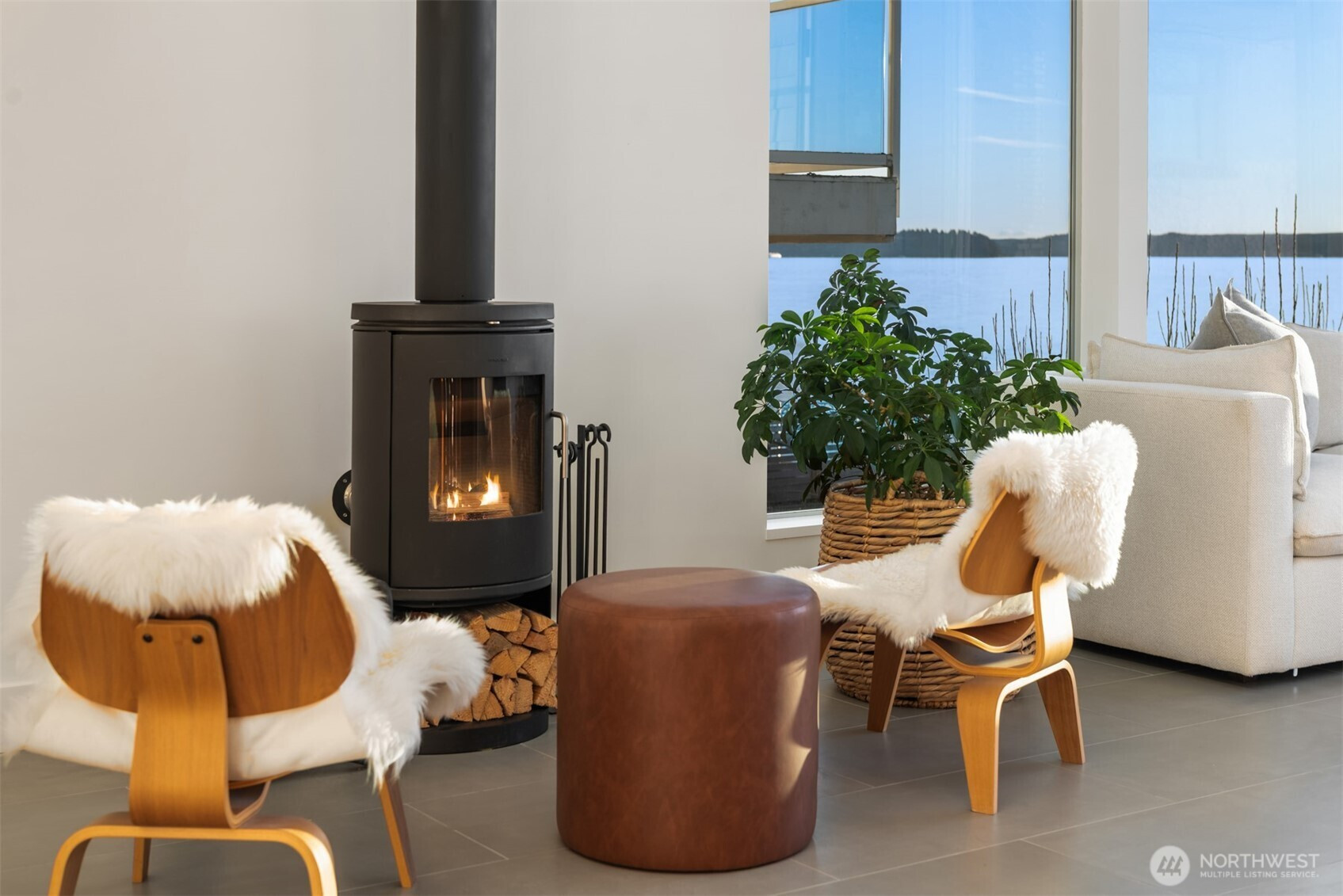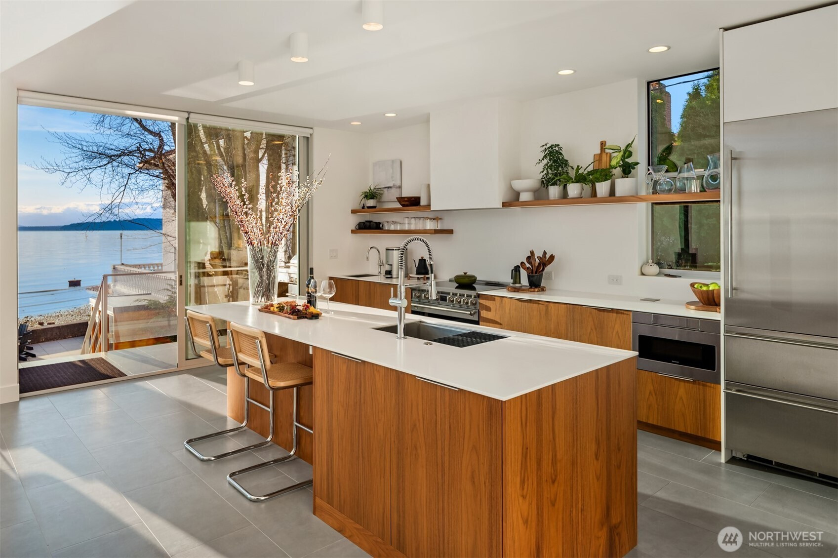 A private waterfront reveal on West Seattle’s coveted Beach Drive. Built in 2023, this architectural home reads as a sculptural cedar-clad form from the street—minimal, restrained, and intentionally discreet behind cedar privacy screen slats and a secure gate. Step inside and everything shifts. A dramatic 2-story living room with a Fleetwood window wall slider opens to sweeping views of Puget Sound & the Olympic Mountains, w/ a deck just off the main level for seamless indoor-outdoor living. Anchored by a Danish wood stove, the space feels both modern & warmly grounded. The adjoining kitchen pairs walnut cabinetry, induction cooking, and high-end European appliances with clean architectural lines that keep the focus on the view. From the shoreline, the home becomes open and fully in conversation with the Sound. Nearly 40 feet of waterfront with tideland rights and deeded buoy bring paddleboarding, wildlife, and sunsets into daily life. A skylit staircase leads to a lofted den and a primary suite with floor-to-ceiling water views and spa bath featuring Moroccan plaster shower and view soaking tub. A second bedroom opens to a Zen balcony. The lower level includes a third bedroom and separate flex space—each with its own glass garage door for true inside-out living. Multiple decks, native landscaping, water-view sauna, & 2 secured parking spaces behind the gate. Close to Lincoln Park, Alki, & the Alaska Junction. Architectural. Intentional. A luminous retreat at the shoreline.