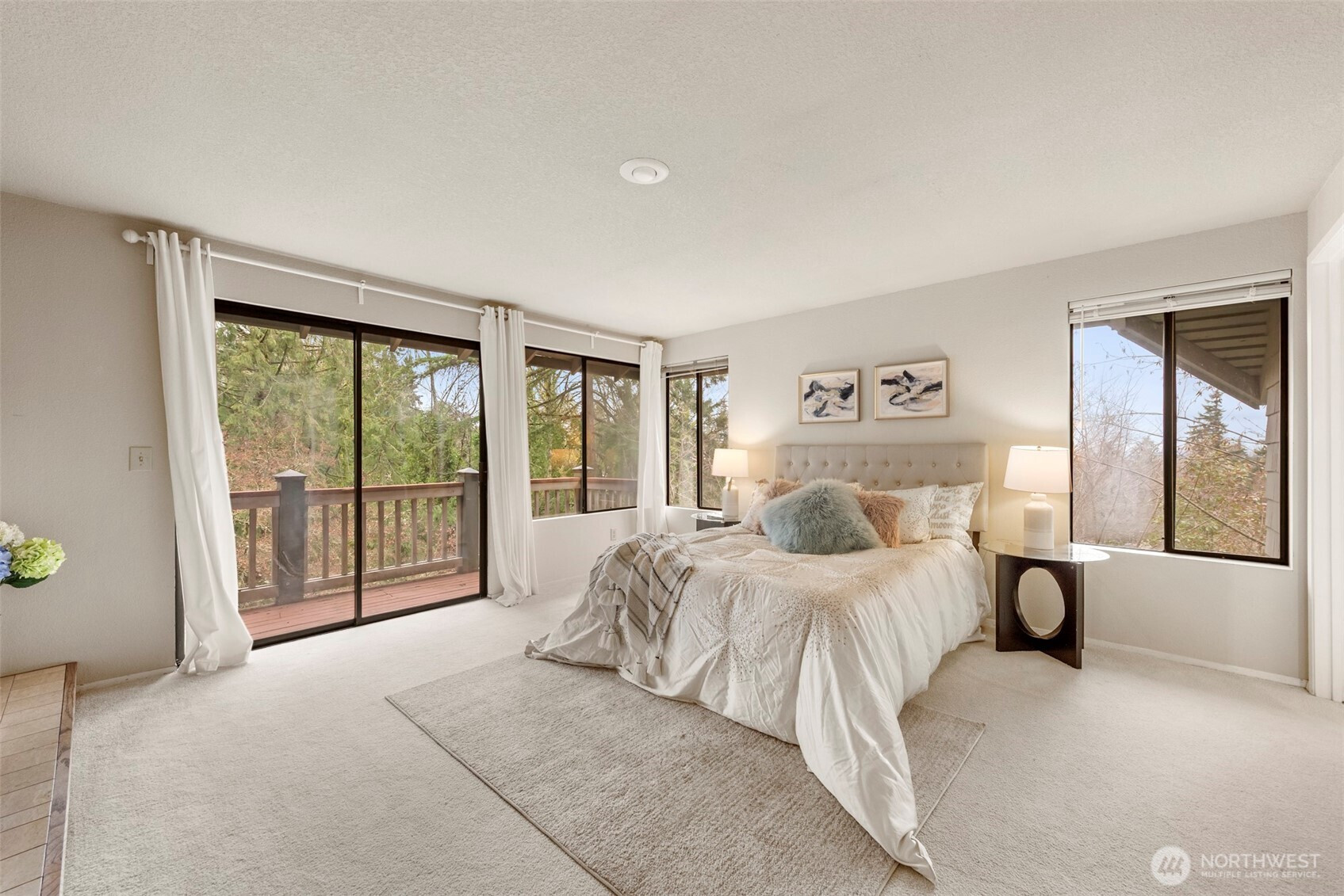 3 BDs 1 bonus RM, 2.5 BA contemporary home with large windows, supper private, adjacent to Whispering Heights. Updated open kitchen w/ large core counter & dinning space, wet bar. Recent updated SS appliances, new fridge in 2022, Blank new range, new furnace in 2024. Remodeled bathrooms, refinished and well maintained oak hardwood & lvp floor. Some territorial views, low maintenance level backyard w/ new fence, deck. Separate dining & high ceiling living RM. One fireplace at every floors. Upper floor has master suite and adjoining office or nursery RM , private deck. Lower level has two BDs 1 full bath, plus rec RM or third BD, laundry RM. Attached spacious 2 car garage with flat driveway, don't miss the additional secured storage space on top of garage. Mature landscaping. Convenient to I-90, 405, shops, park-n-ride. Bellevue School District (Spiritridge Elem, Tillicom Mid, Newport high)