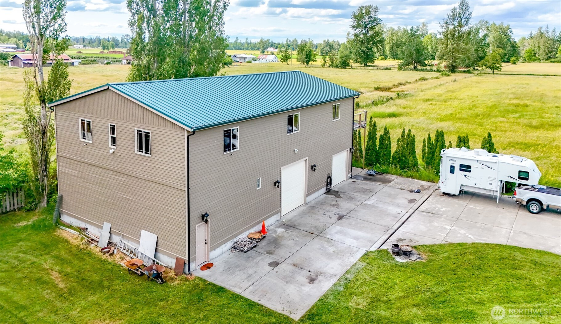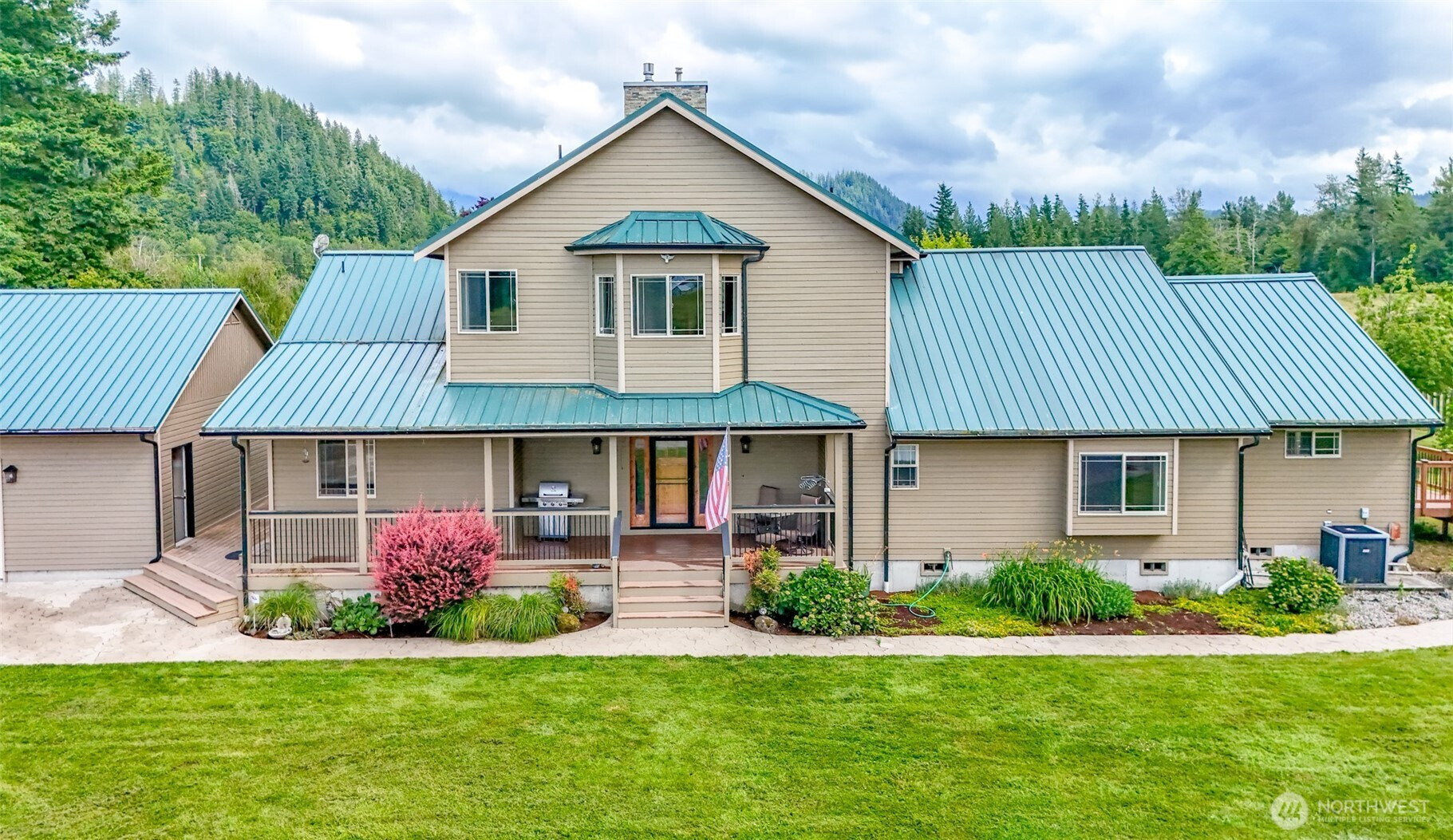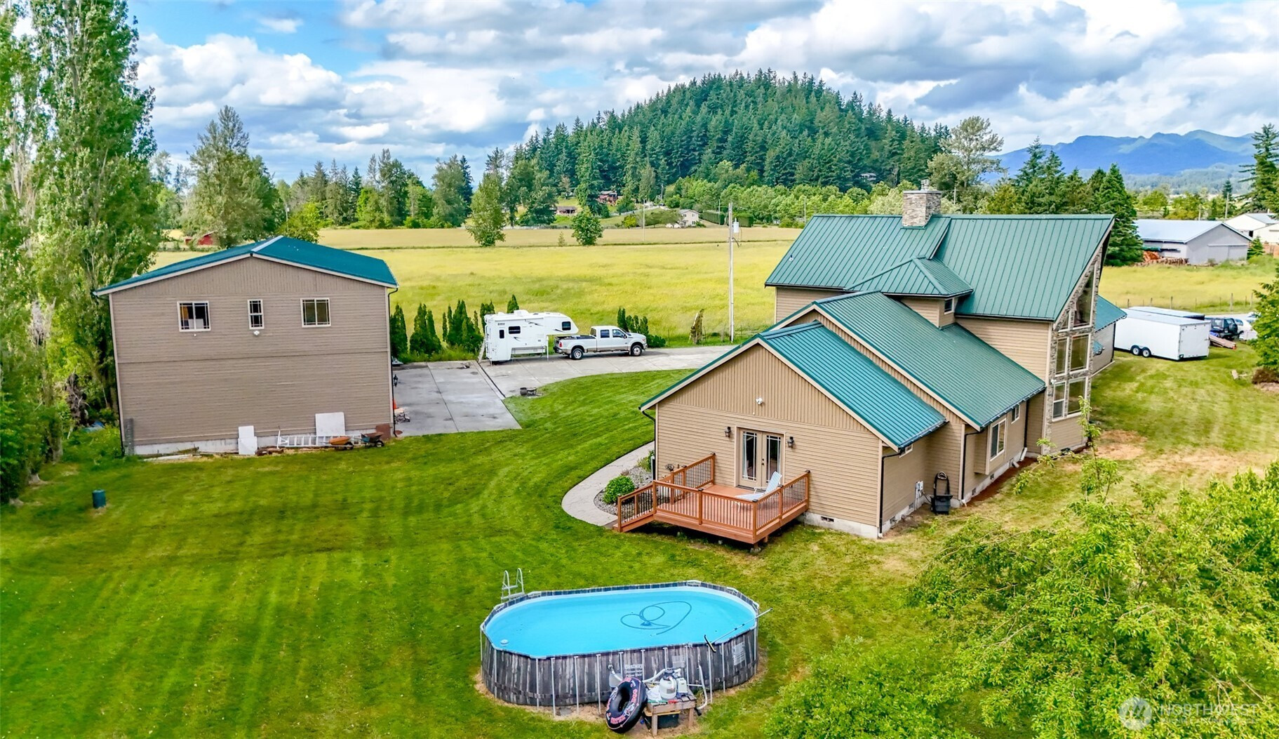 Gorgeous Custom Home on 2.66 acres +/- w/beautiful mountain views. Over 3300Sf w/3 bedrooms 2.5 bathrooms, huge gourmet kitchen w/ island. Great room concept w/ 2 story river rock fireplace, vaulted ceiling's & floor to ceiling windows. Upstairs primary suite w/fireplace & 5 piece bath, complete w/jetted soaking tub and oversized shower. You will love the 2 large main floor bedrooms. The separate rec room leads to the side yard and has a wet bar. Huge 2 story detached shop (4300 +/-sf), with the possibility of an ADU. The attached 3 car garage (1350 +/- sf) has a hobby/storage room. Ideal for horses, mechanics, hobbyists, RV's and more! There are many fruit trees and plenty of garden spaces! Close to 410, downtown Enumclaw and Buckley!