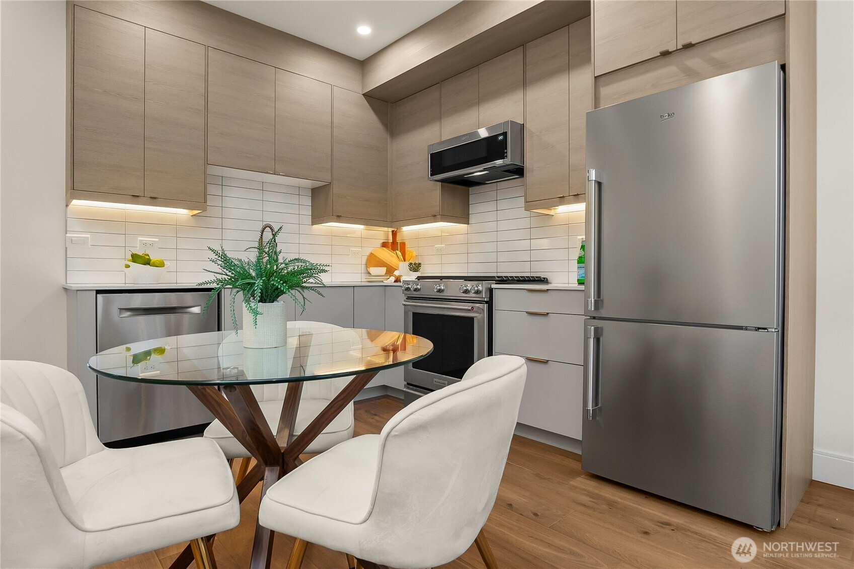 Discover the perfect blend of modern design and timeless elegance in this spacious Fremont end-unit townhome. Featuring custom elements and abundant natural light, the home showcases hardwood floors, exquisite tile work, and a thoughtfully planned layout. The gourmet kitchen boasts premium appliances, quartz countertops, and high-end cabinetry for the discerning chef. Upstairs, the generous primary suite offers two walk-in closets and a luxurious bath, complemented by a second bedroom and bathroom—both with heated floors for added comfort. Only a few blocks from Woodland Park, enjoy breathtaking views from the rooftop deck and the popular Fremont neighborhood.