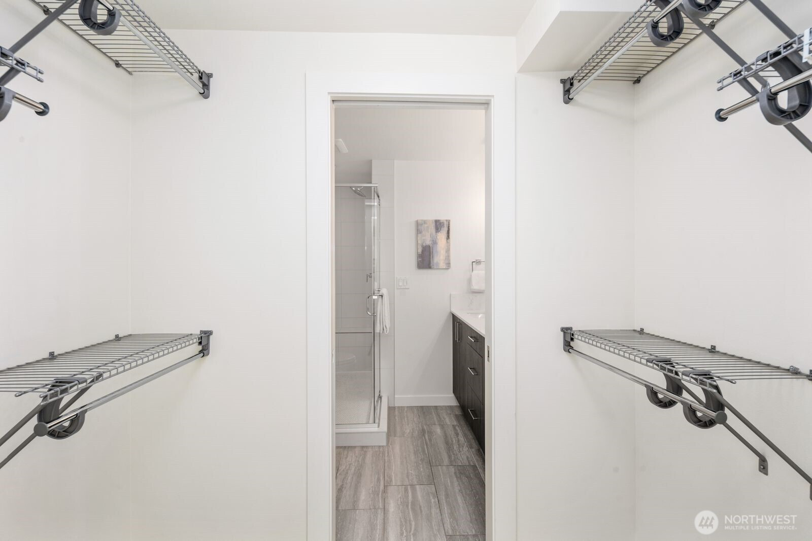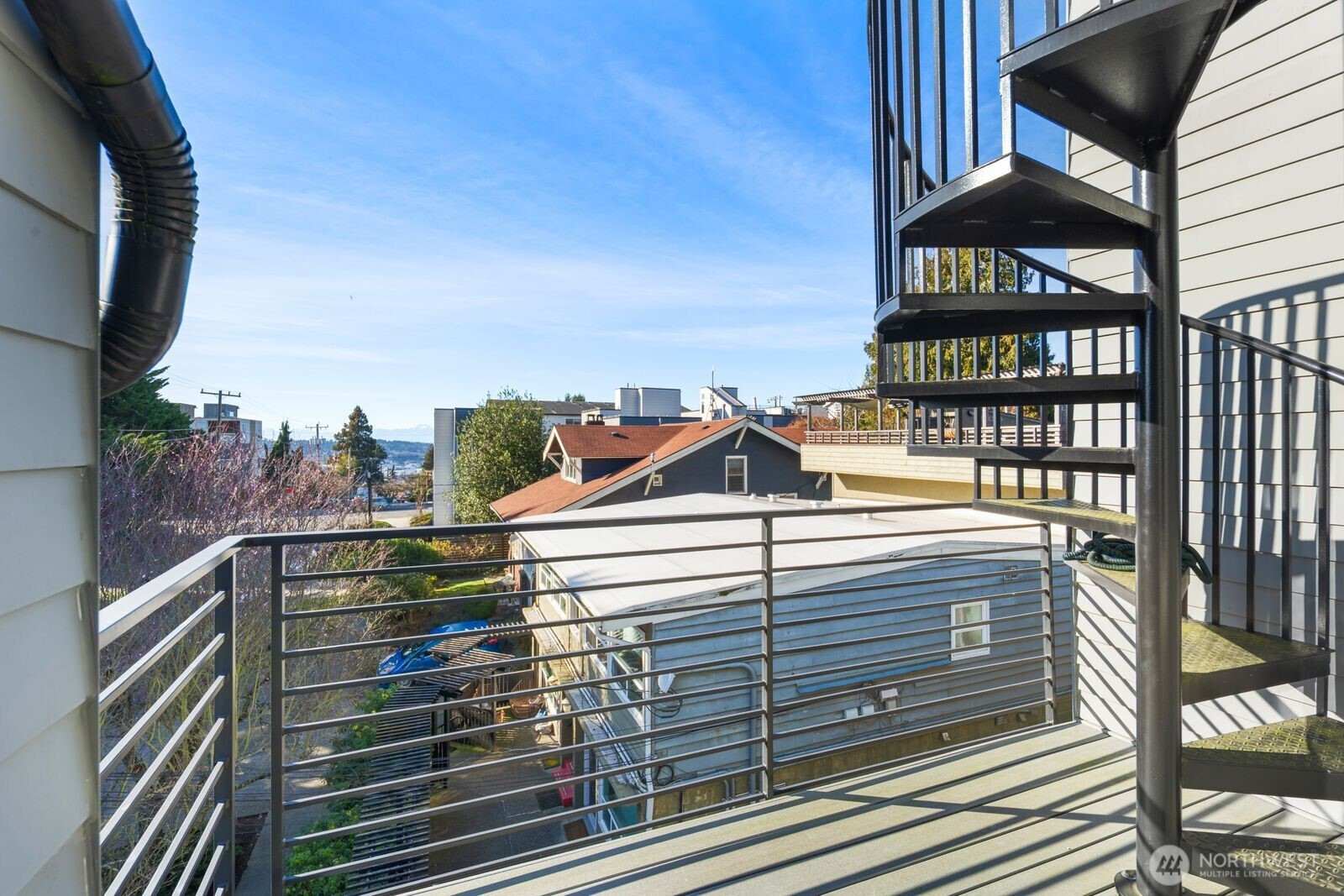Sun-filled end unit townhome on a quiet street between Fremont and Phinney Ridge, prime location just minutes to shops, dining, and easy Seattle access. The home features vaulted ceilings, wide-plank floors, and abundant windows with views throughout. The main living space complements a sleek kitchen with quartz counters, stainless appliances, and a Bertazzoni gas range. Flexible loft with half bath, top floor private primary suite with designer bath, and lower-level bedroom with full bath tucked away from main living areas. Enjoy a sunny rooftop deck off the primary with sweeping views of Mt. Rainier, Lake Union, Lake Washington, and the skyline. 4-Star Built Green with mini-splits, A/C, fresh paint, and move-in-ready appeal.