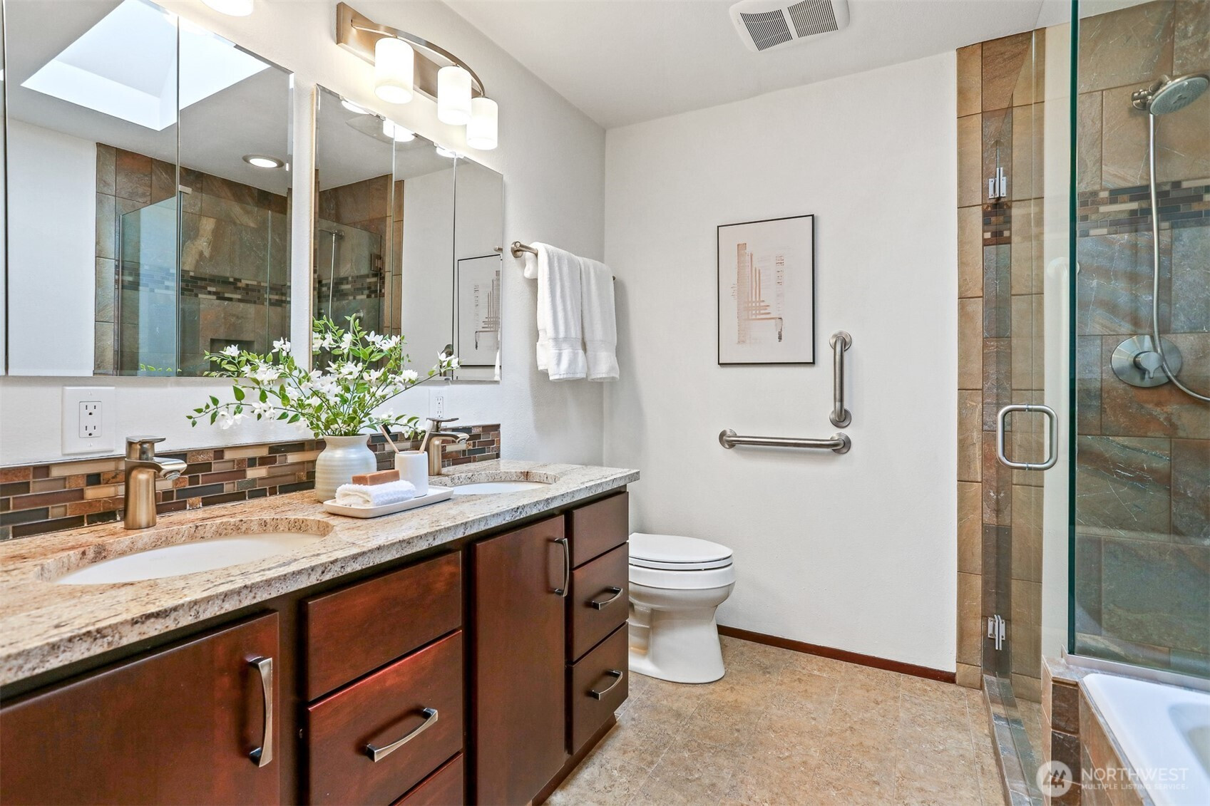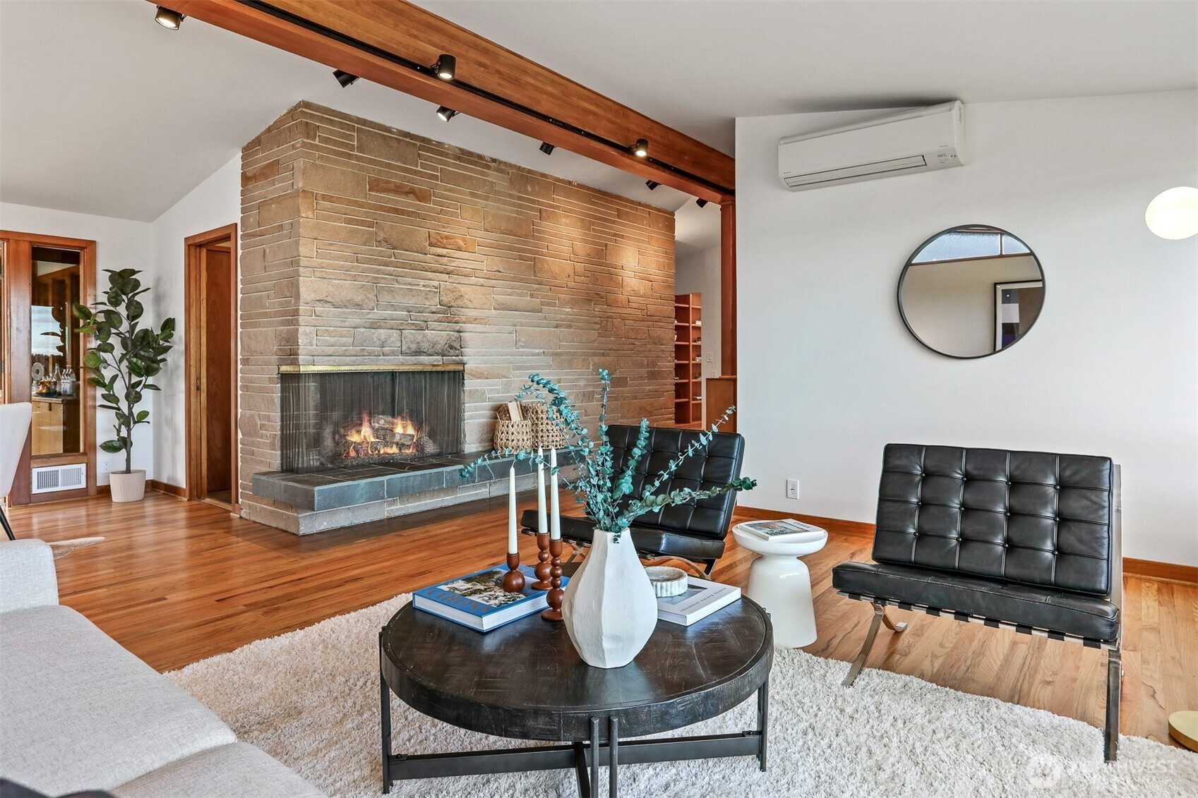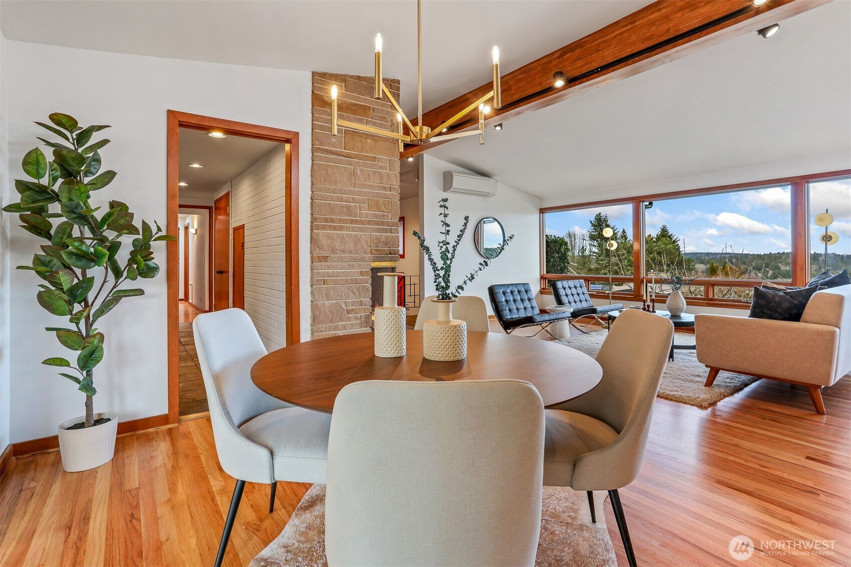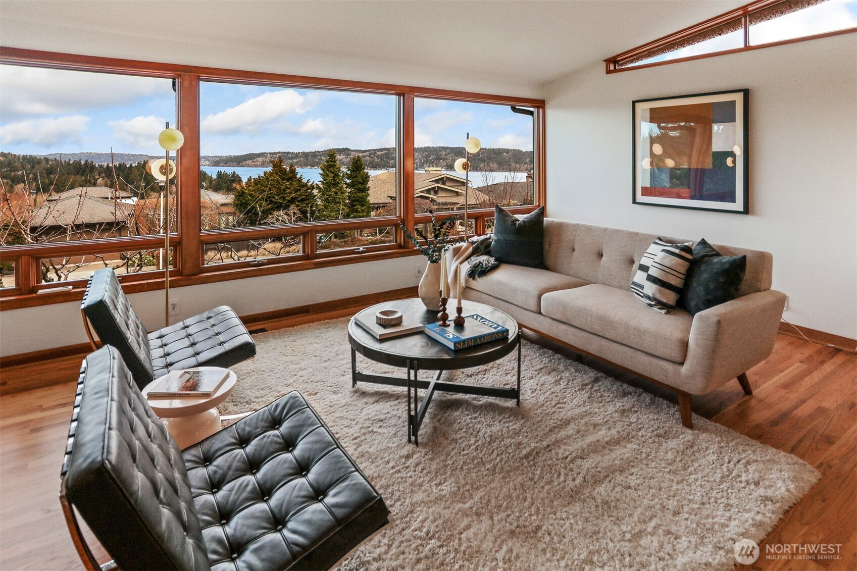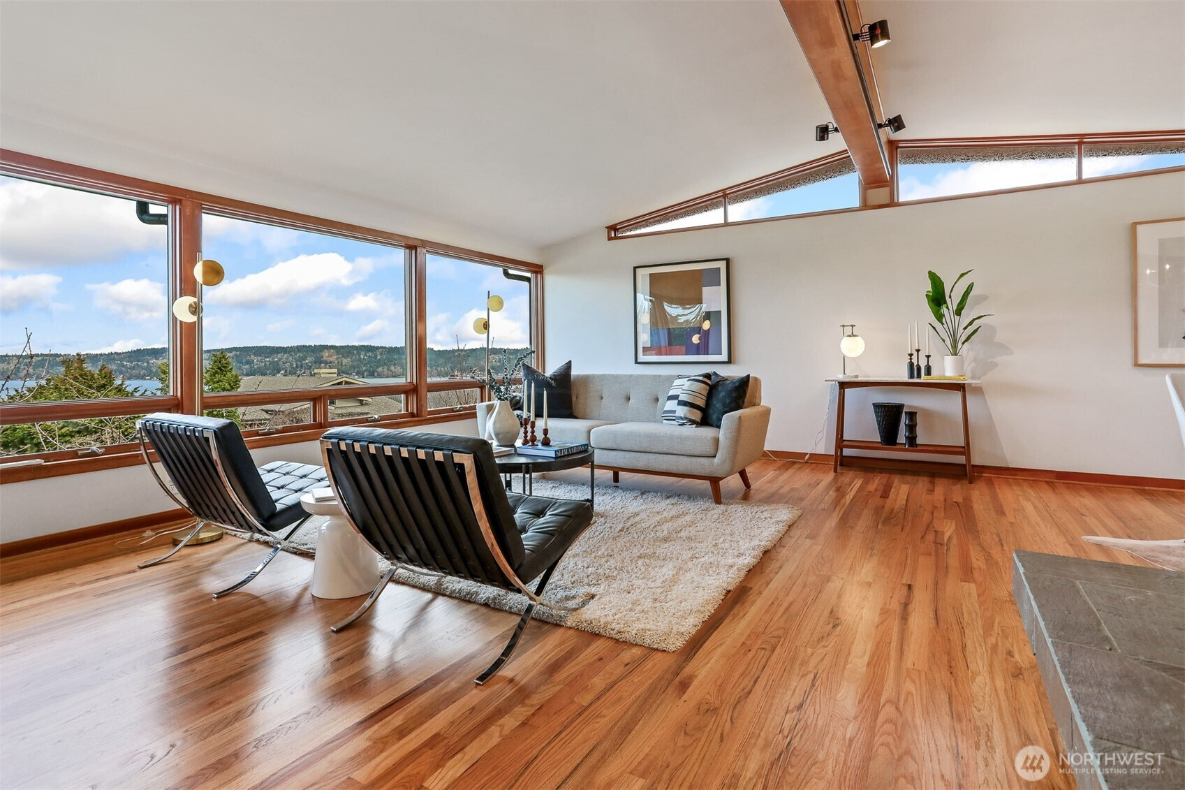 Awesome Mid-Century design in fabulous Inverness! Walls of windows provide expansive, protected views of Lake WA, the mountains, ever-changing skies, and marine activity. There’s constant natural light and a feeling of connection to the outside world. The spacious kitchen with loads of prep and storage space makes entertaining a snap, and flows out to a gorgeous back yard sanctuary. An attached sun-room is the perfect place to ease into the day or unwind at the end, and you’ll be drawn out back by the sounds of a waterfall and soothing spaces to relax. Coveted 3-bed/2-bath on the main floor, vaulted ceilings, excellent flow, and solid construction throughout. The large lower level offers a 4th bedroom, more storage, rec room, bonus spaces, and large 2-car garage. Updates include new interior paint, gleaming hardwoods, AC, and much more. Super location close to great schools, beaches, parks, Children’s, UW, U Village, and the popular Burke Gilman Trail. What a wonderful place to call home!