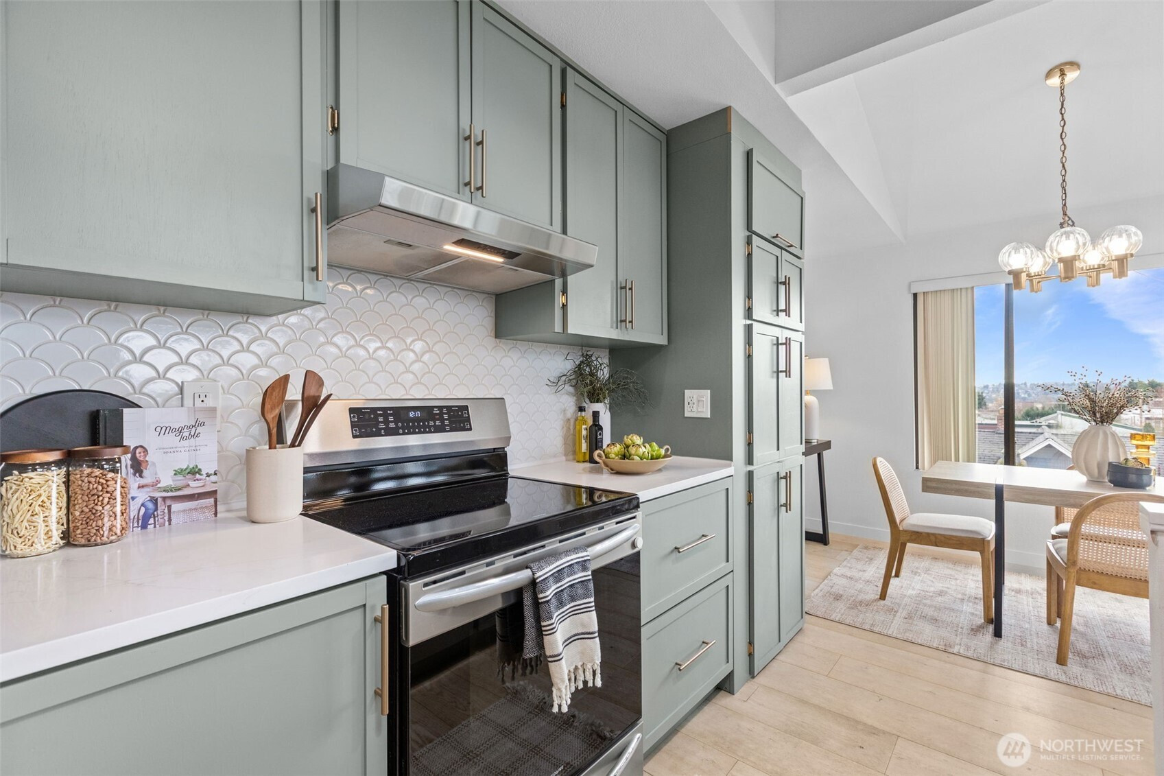 Perched in Seattle's sought-after Fremont neighborhood & directly across from Woodland Park Zoo & Rose Garden, this fully remodeled, top-floor residence offers a rare blend of nature, design, & city views. Southwest facing provides vibrant sunset views of Seattle’s skyline, the Space Needle, & surrounding mountains. The vaulted ceilings create an expansive, airy atmosphere complemented by refined finishes throughout. A redesigned, custom kitchen with quartz countertops, design-forward scalloped tile backsplash, & sage-green cabinetry, flows seamlessly into the dining & living space. Anchored by a gas, limestone fireplace, the living area feels elevated yet inviting. Oversized bedrooms, a welcoming entry, an abundance of storage, & 2 covered parking spots: everyday conveniences rarely found in city living. Just steps from Green Lake, trails, & beloved outdoor amenities. Mins to trending shops & restaurants in Fremont, Wallingford, & Phinney Ridge. No rental cap!