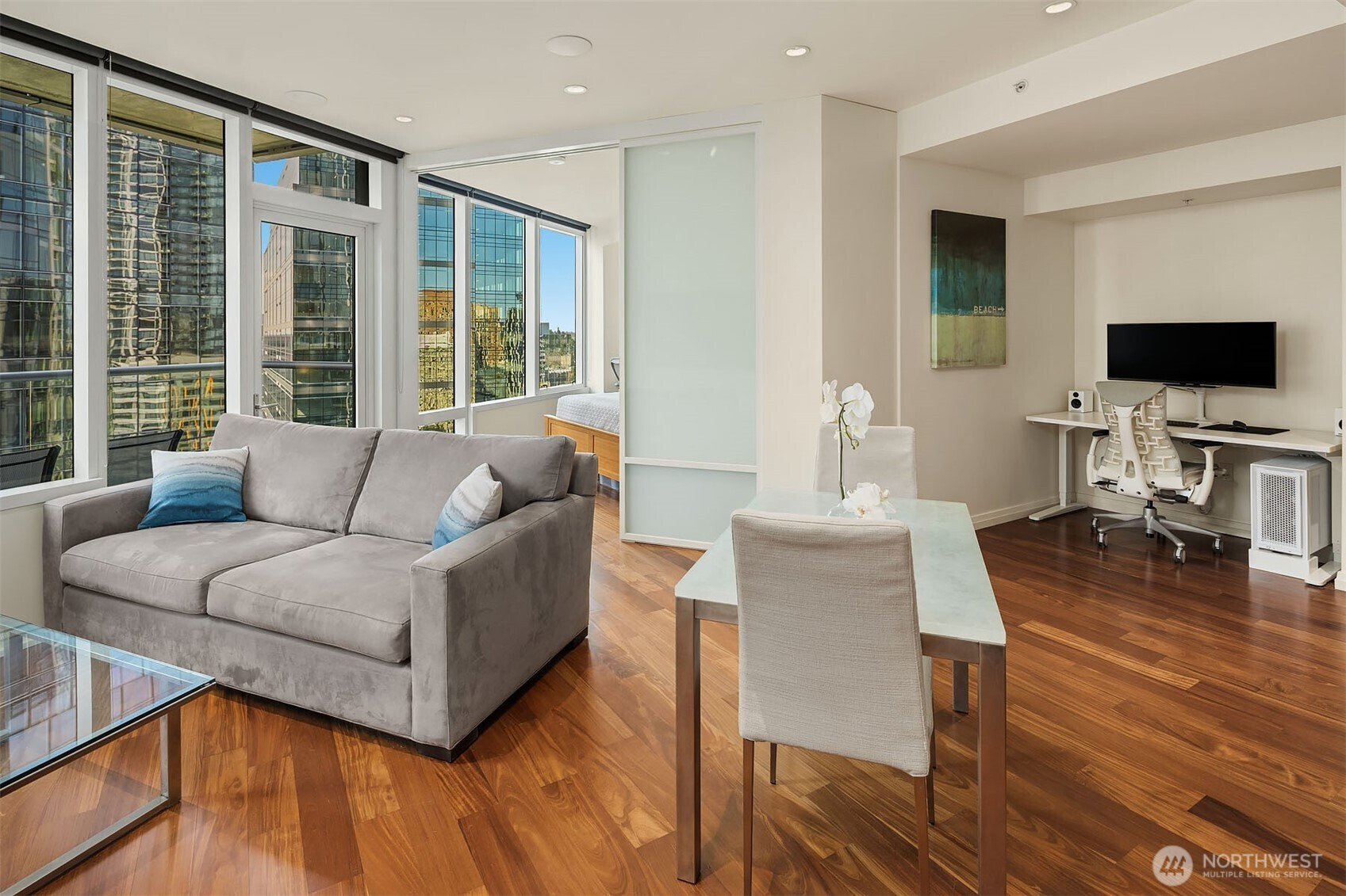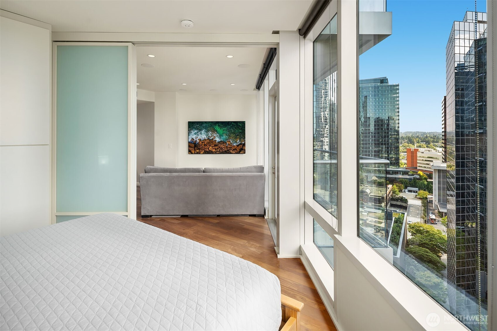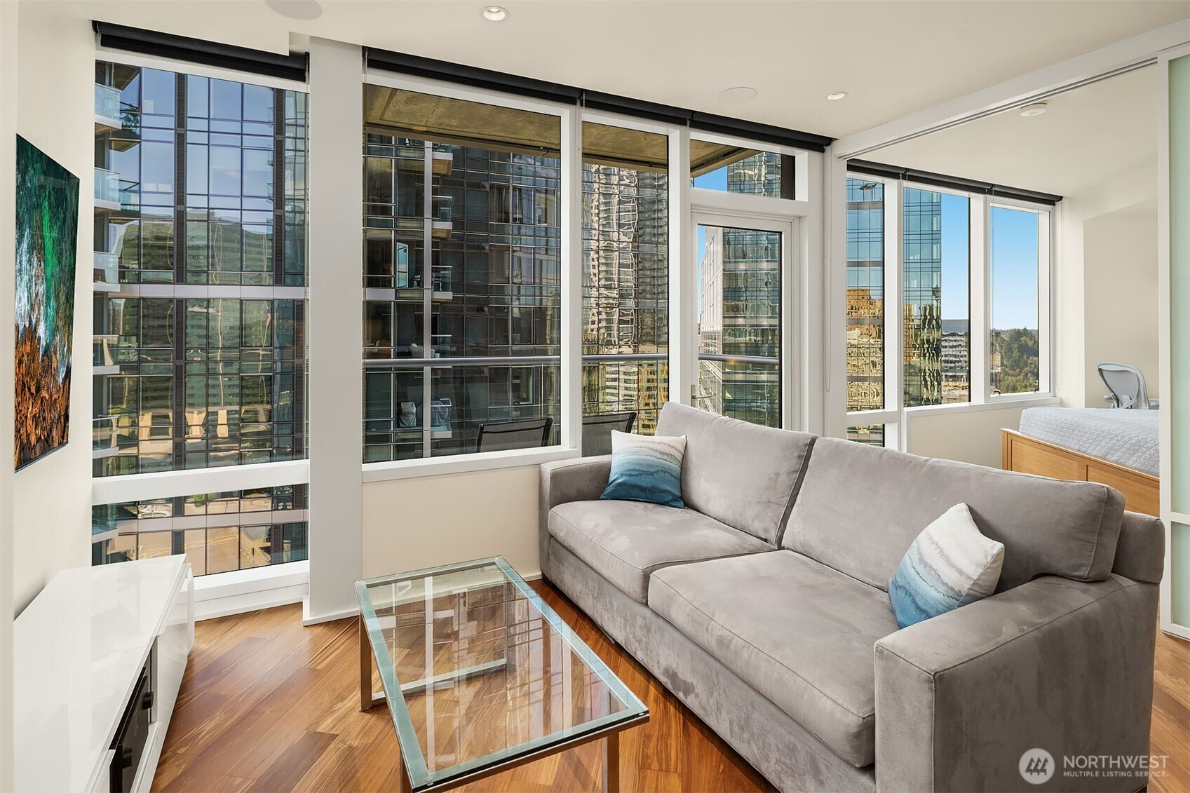 Live in the heart of downtown Bellevue in this sunny south-facing 1BR at Bellevue Towers. Highlights of this tastefully updated home include custom foyer built-ins, updated kitchen w/ Miele appliances, commercial-style stainless sink & new quartz countertops, upgraded lighting, built-in speakers, and newer HVAC, plus a light and open floor plan w/ 9’ ceilings and a sliding door system at the bedroom offering privacy when you want it. The conveniently located, large parking space features EV charging on a custom pulley system for ease of use. Bellevue Towers offers fitness rms, whirlpool spa, dining rm w/ kitchen, community rm theater, outdoor terraces, concierge and all the best of downtown: walk to shopping, dining, downtown park and more.